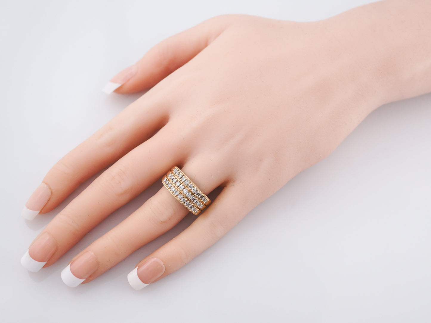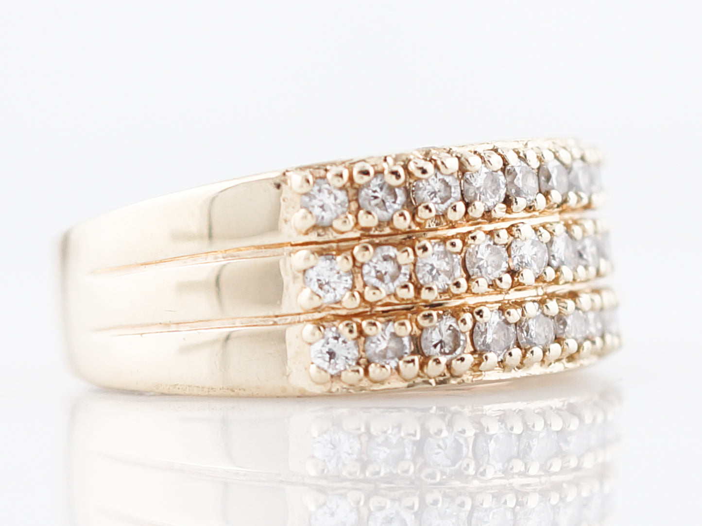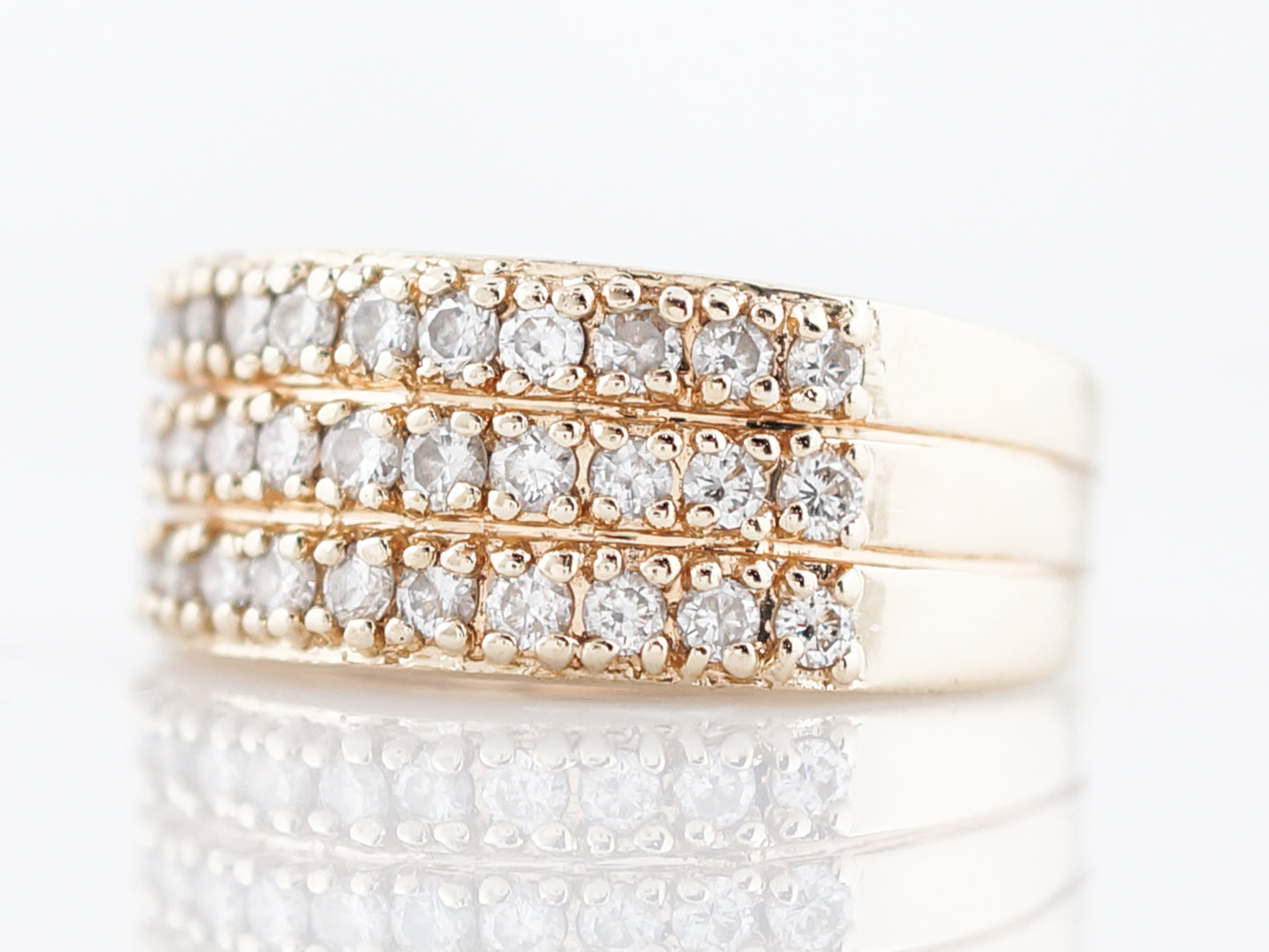 This Modern right hand ring is made with three rows of prong set diamonds set in 14k yellow gold. This band style ring has a width of 9.6mm so it has a big, bold look. The one full carat of bright, white diamonds contrast beautifully with the warmth of the yellow gold. This ring is sizable enough to be considered a statement ring.