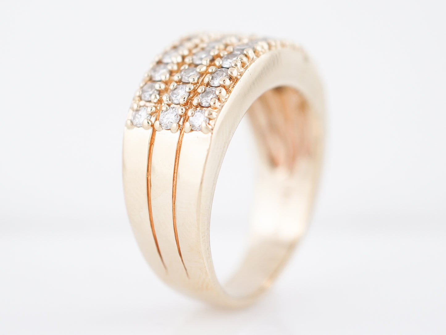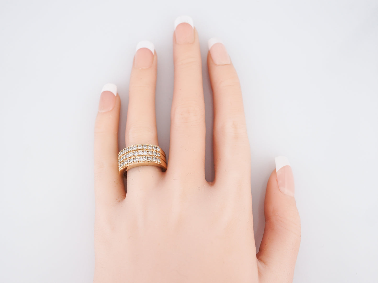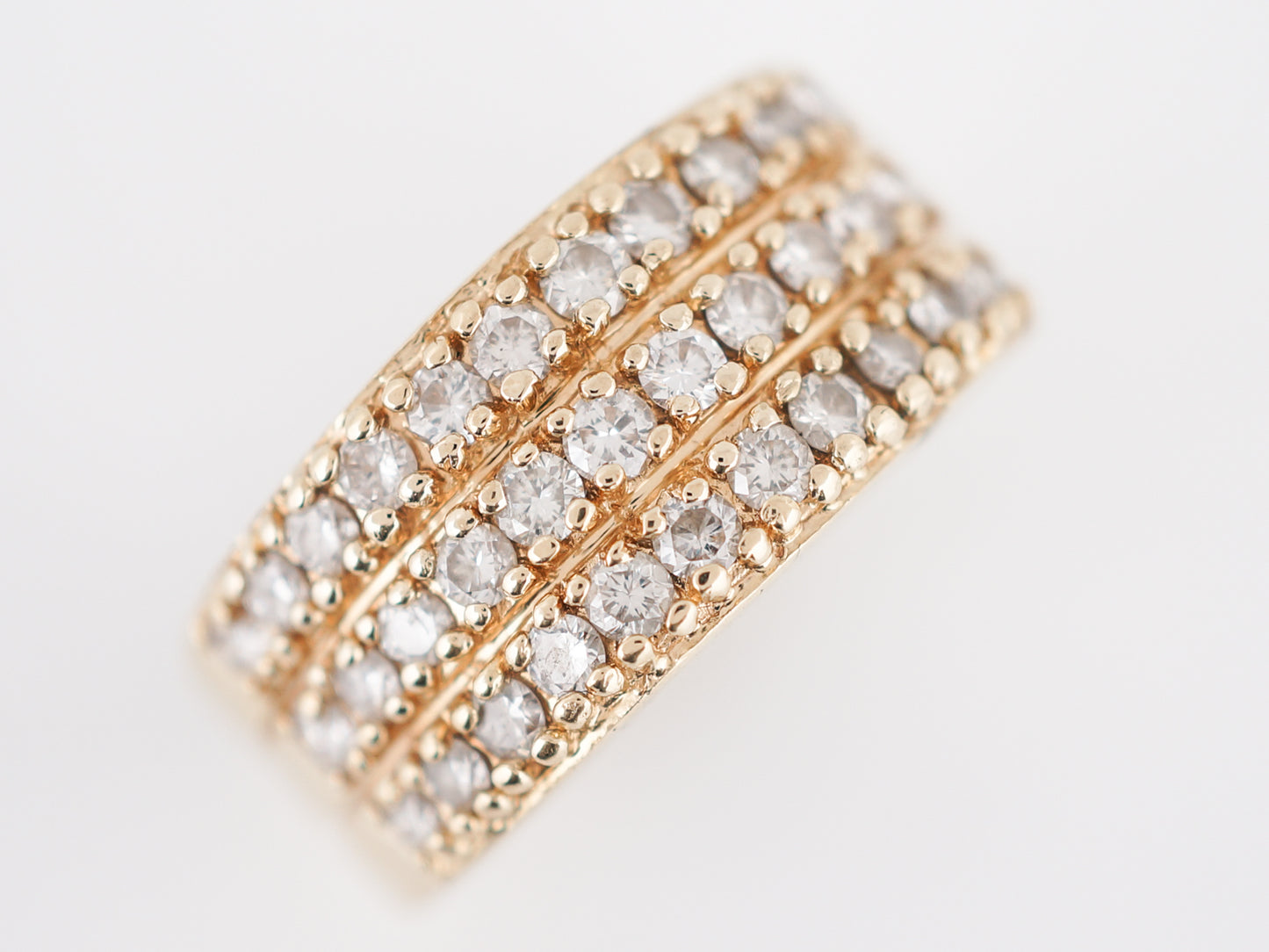 This Modern right hand ring is made with three rows of prong set diamonds set in 14k yellow gold. This band style ring has a width of 9.6mm so it has a big, bold look. The one full carat of bright, white diamonds contrast beautifully with the warmth of the yellow gold. This ring is sizable enough to be considered a statement ring.