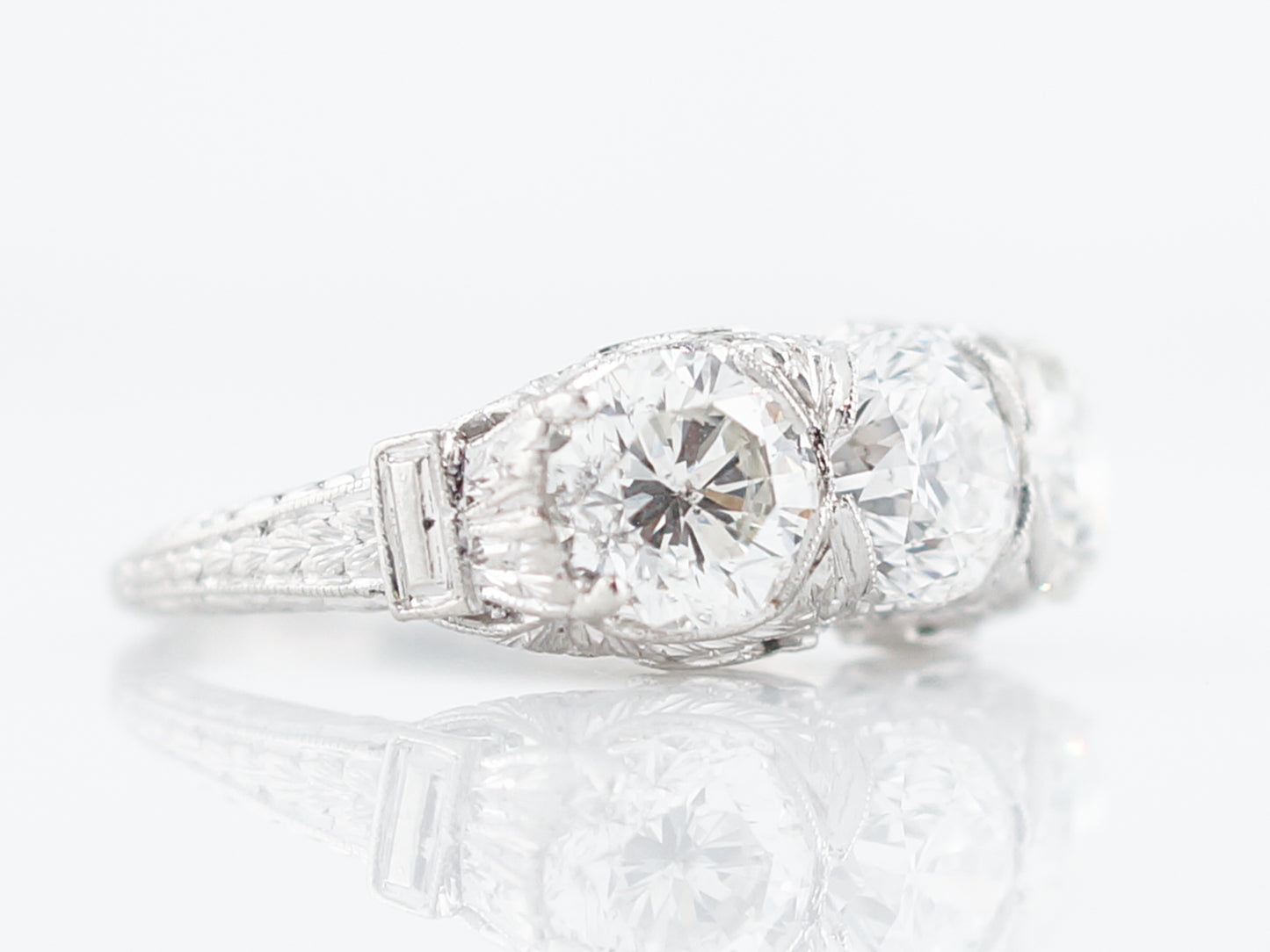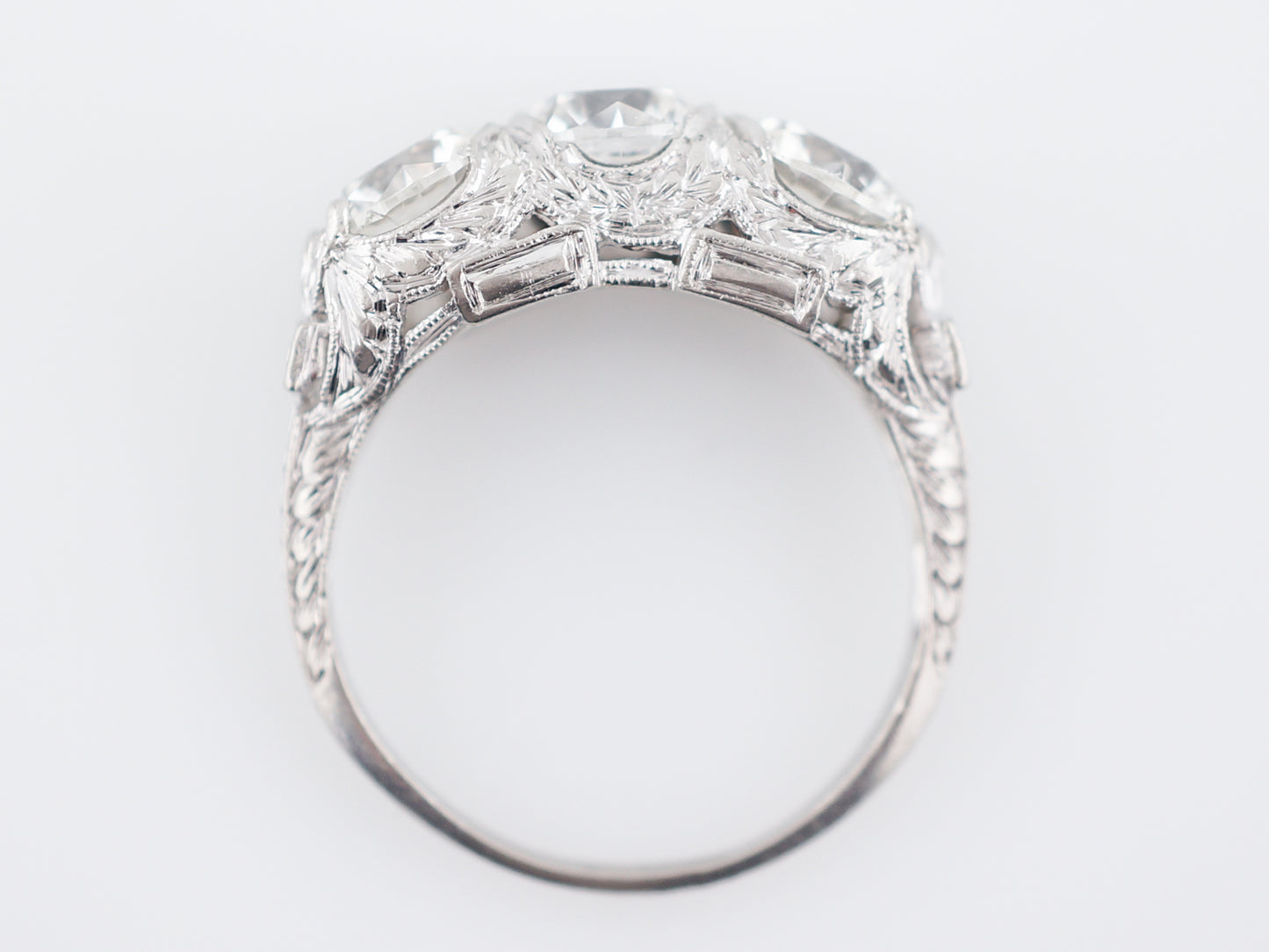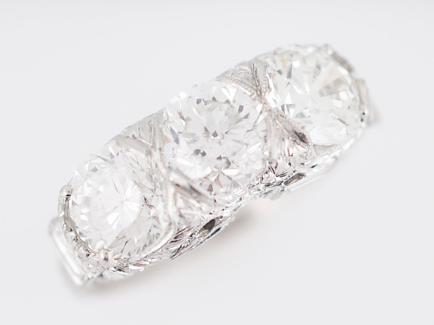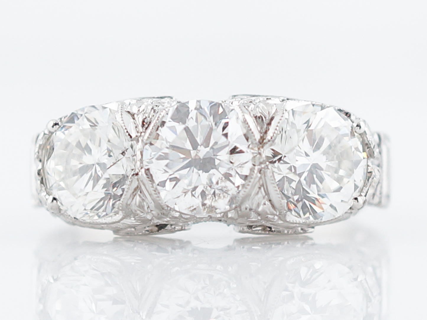 This three stone diamond ring is an impressive piece. All three large diamonds are colorless, E grade GIA certified stones. Although this is a Modern ring it has many qualities of an Art Deco piece like engraving, open work and milgrain details. This platinum ring has a graceful curve to it as it wraps around the top of the finger. The metal and the prongs blend into the stones giving it a glittering, all diamond appearance. This intricate ring has detail covering the entire front and shoulders of the ring so theres something beautiful to see from every viewing angle.