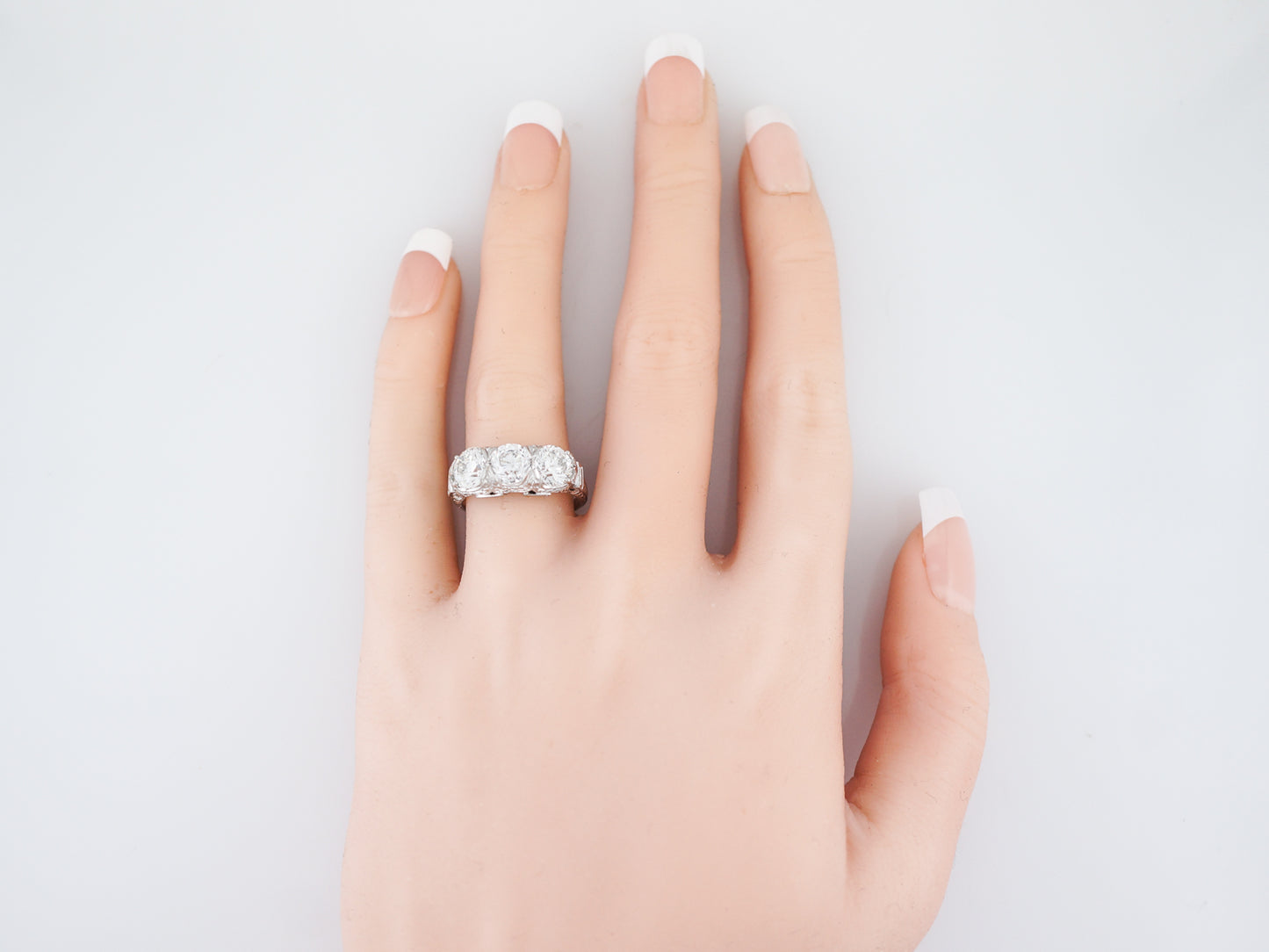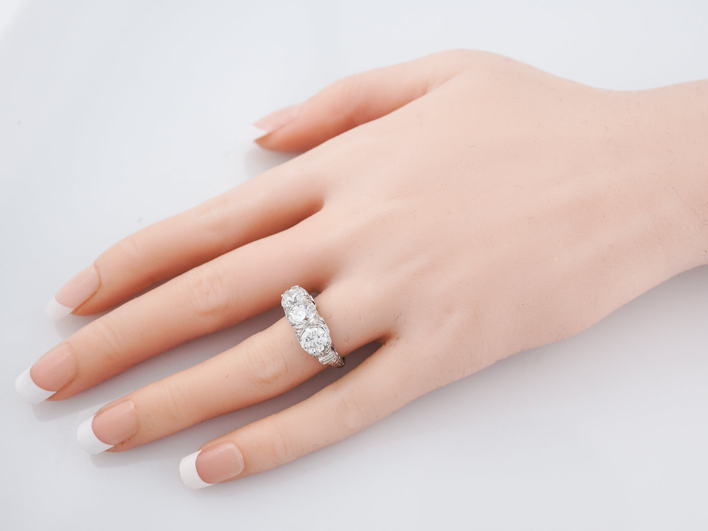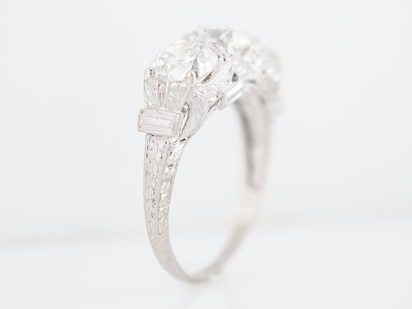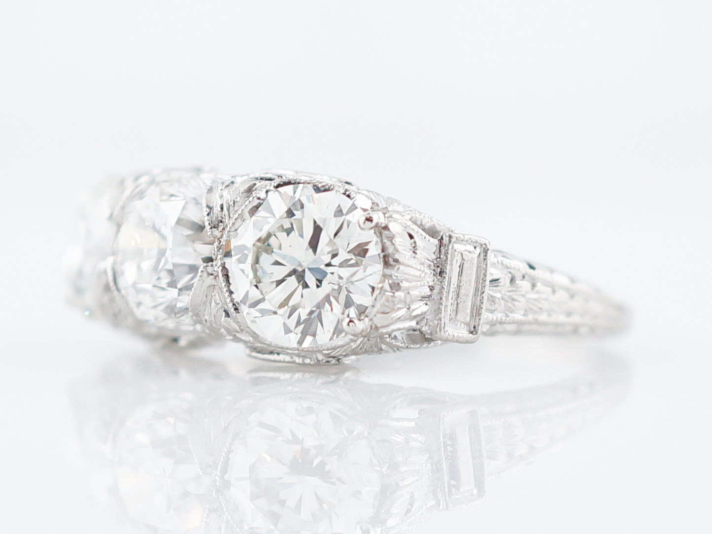 This three stone diamond ring is an impressive piece. All three large diamonds are colorless, E grade GIA certified stones. Although this is a Modern ring it has many qualities of an Art Deco piece like engraving, open work and milgrain details. This platinum ring has a graceful curve to it as it wraps around the top of the finger. The metal and the prongs blend into the stones giving it a glittering, all diamond appearance. This intricate ring has detail covering the entire front and shoulders of the ring so theres something beautiful to see from every viewing angle.