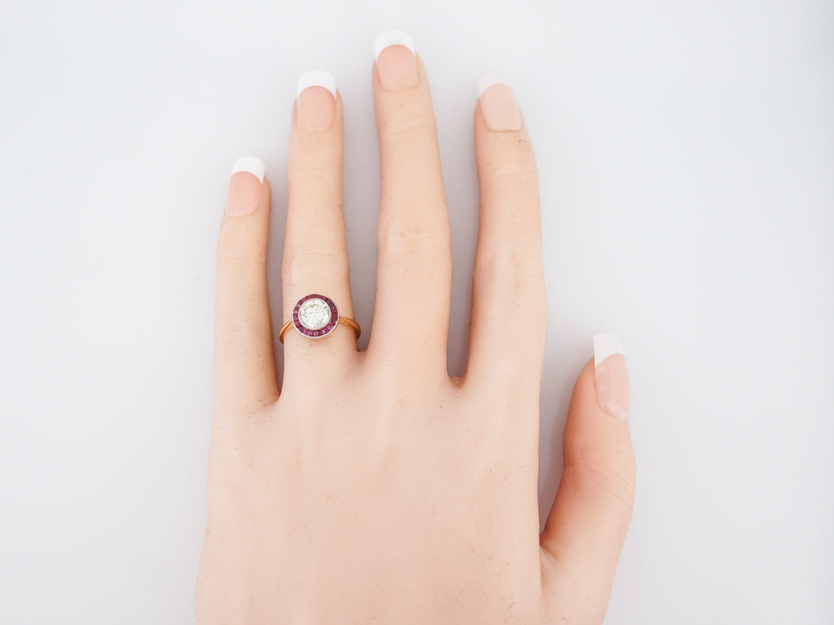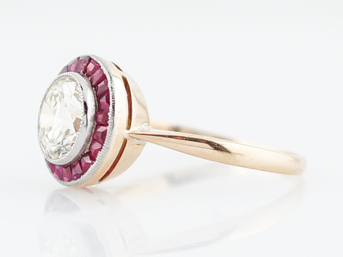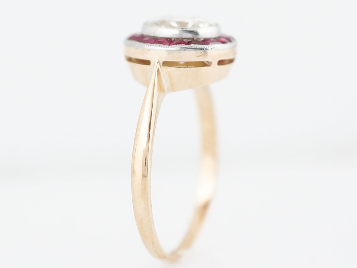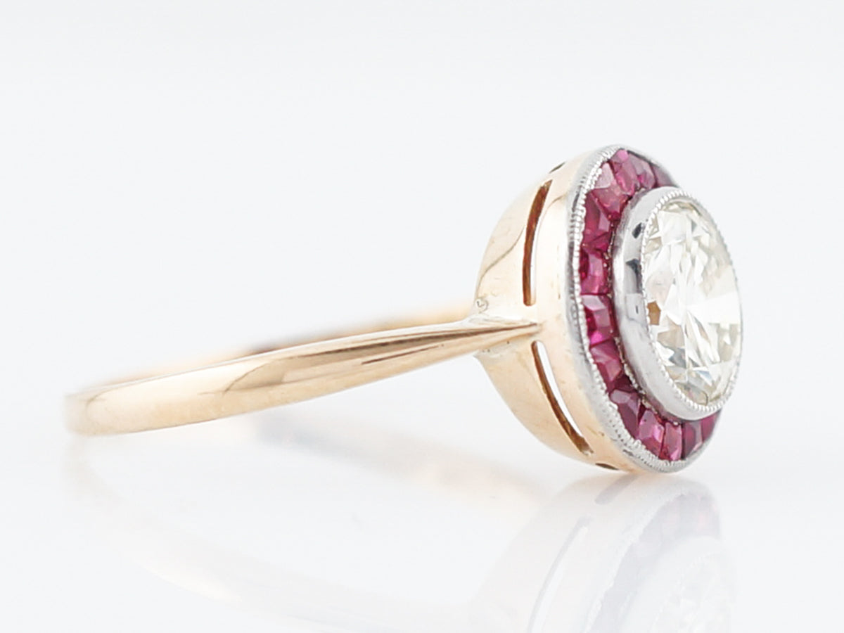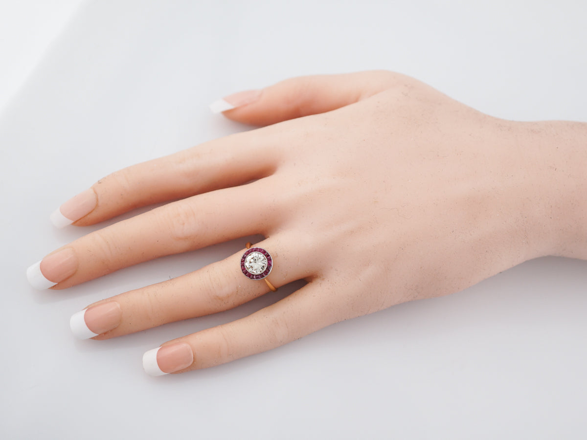 Lightly accented with red rubies, this 1.09 carat diamond halo ring has a classic look for an elegant bride. The center stone is bezel set and features a milgrain detail around the wall of the setting. Surrounding the center stone are seventeen french cut natural rubies, adding a pop of color to a timeless style. Resting just 5.5mm above the finger this stunning ring is perfectly suited for a classic yet casual bride who wants a ring that does more than just sparkle.