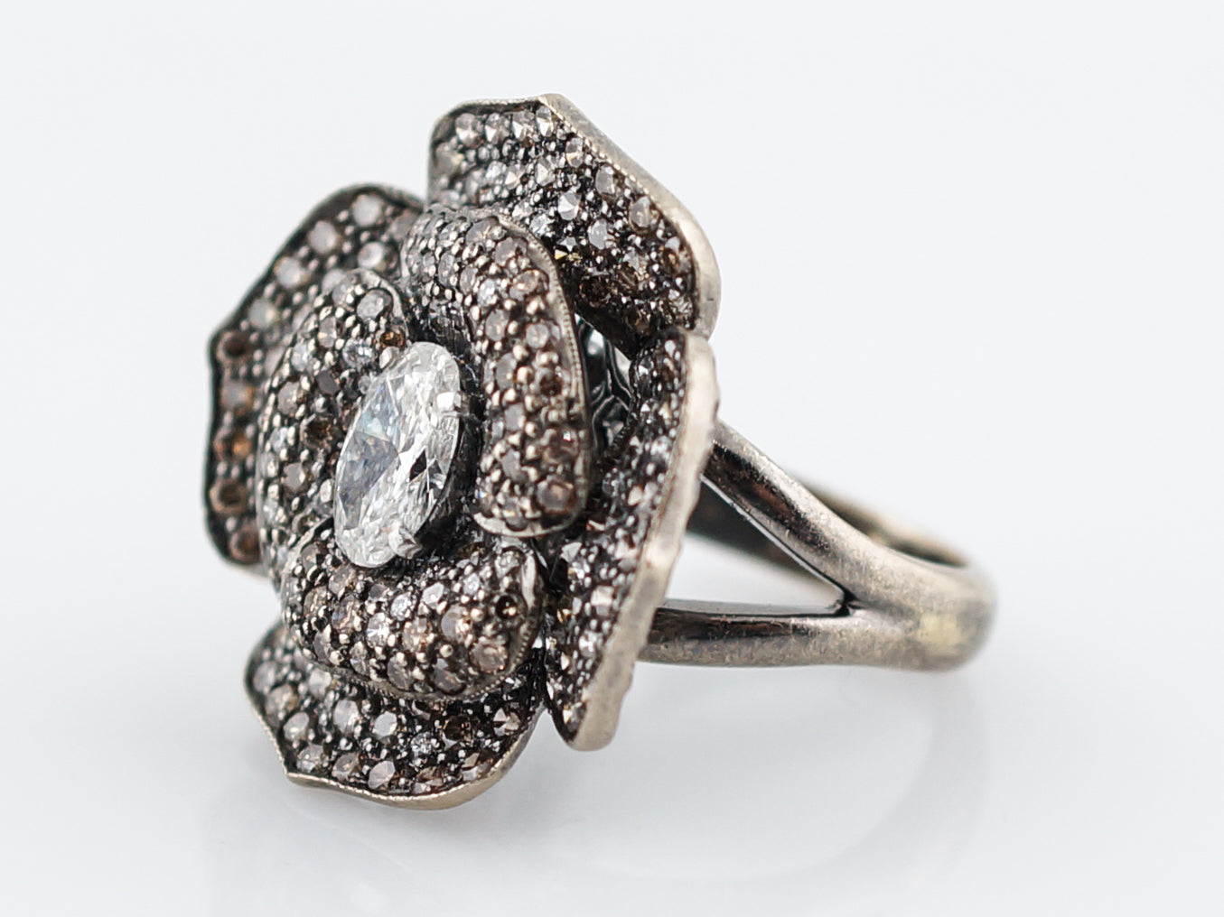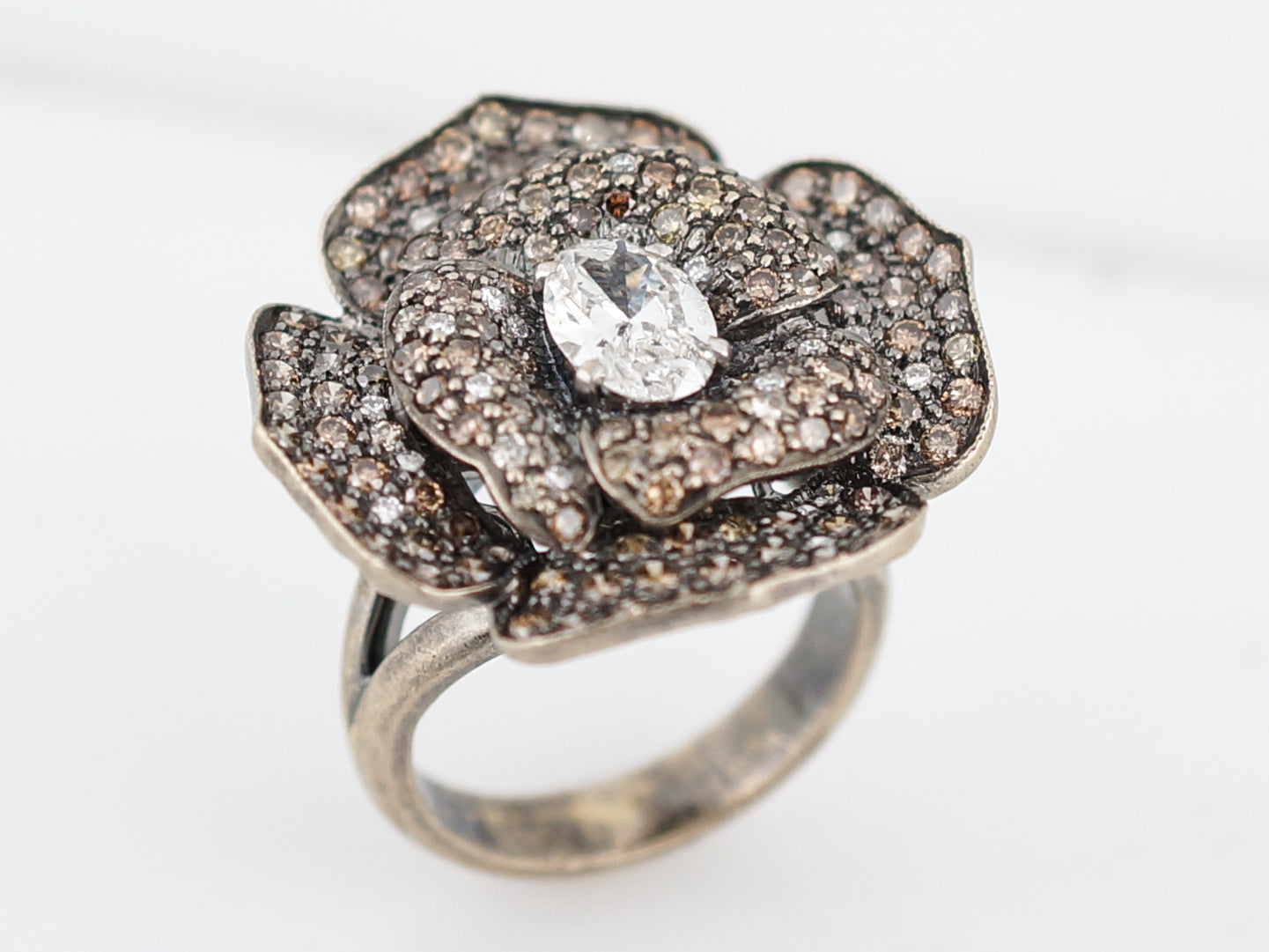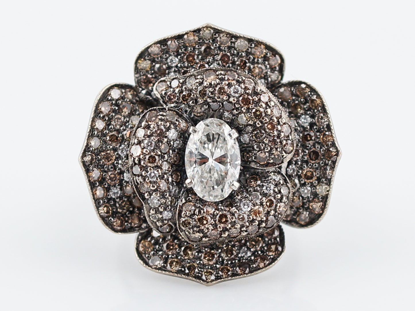 This statement ring is ready to be noticed. This fun flower ring has a 1.07 carat oval diamond as its focal point. The dazzling oval diamond sits in the center of a diamond encrusted flower. The flower is covered in 2.44 carats of multi-colored diamonds giving the petals a unique mosaic feel. The ring is made with 18k gold that has been plated in a black platinum to give it a distinctive look.