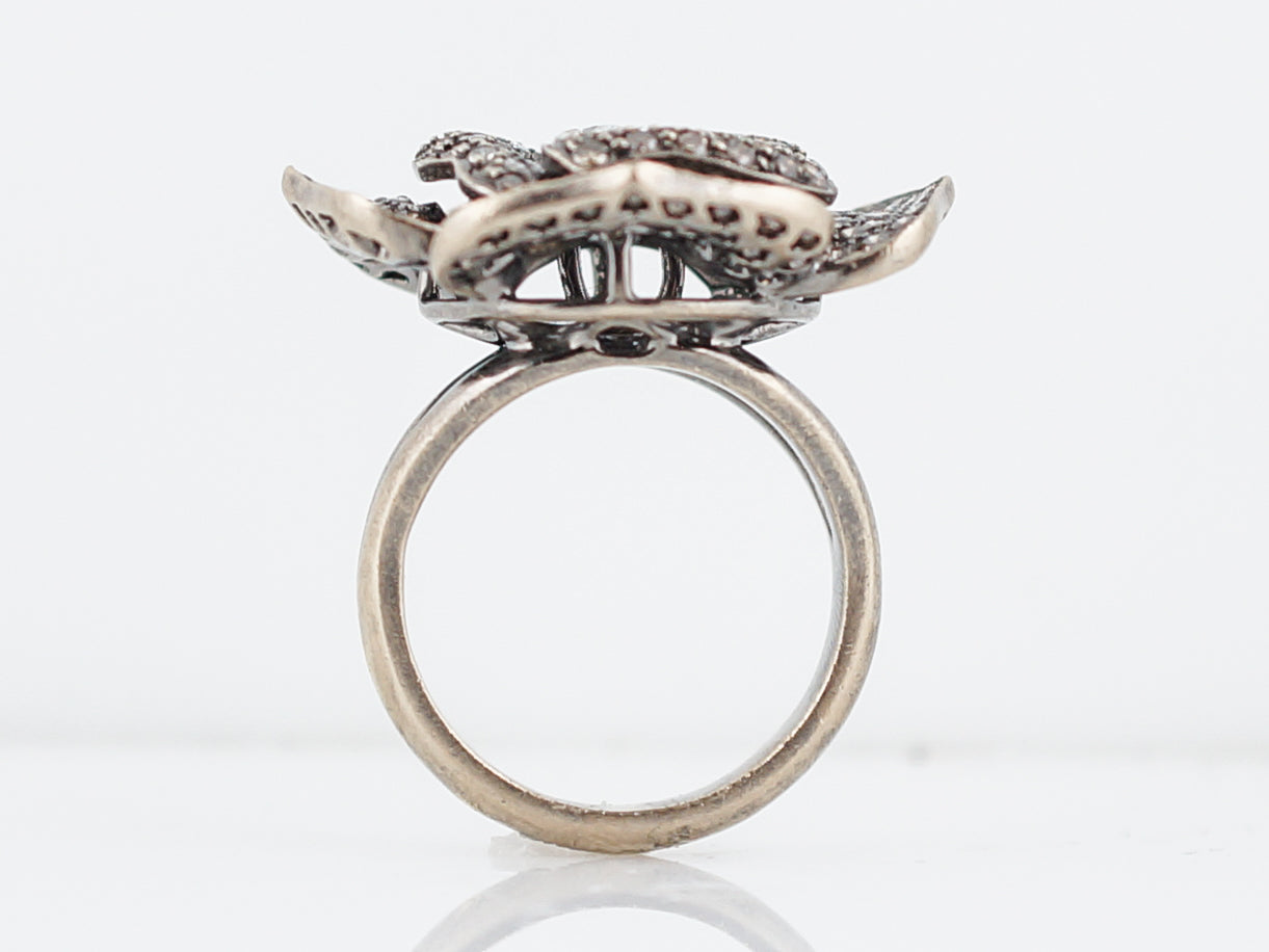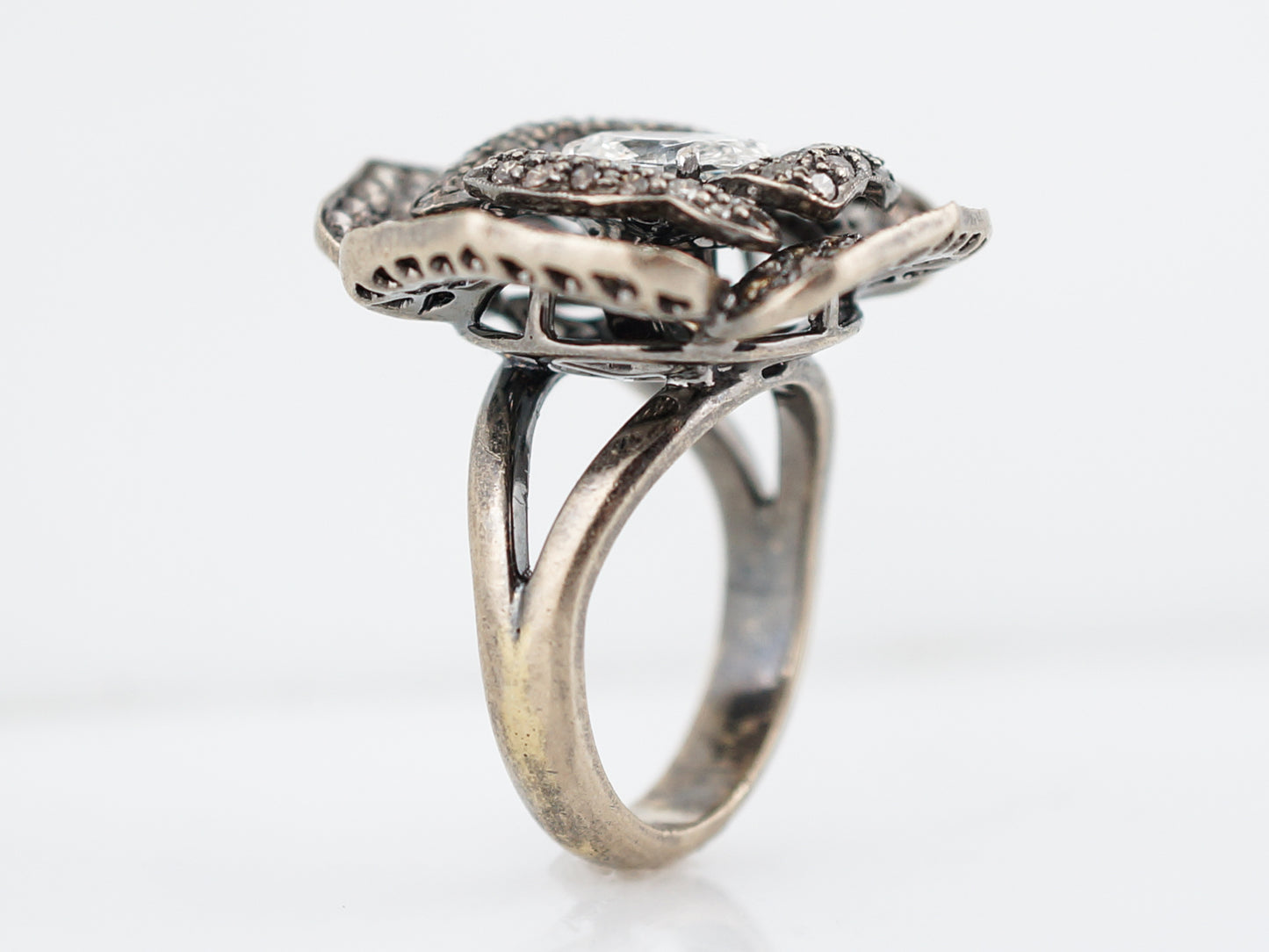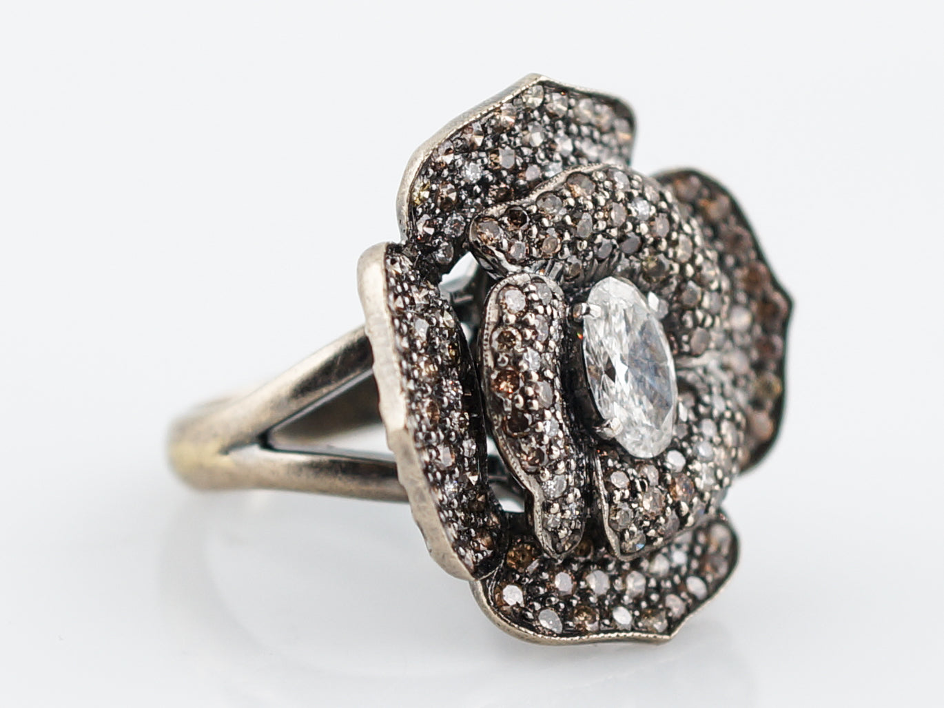 This statement ring is ready to be noticed. This fun flower ring has a 1.07 carat oval diamond as its focal point. The dazzling oval diamond sits in the center of a diamond encrusted flower. The flower is covered in 2.44 carats of multi-colored diamonds giving the petals a unique mosaic feel. The ring is made with 18k gold that has been plated in a black platinum to give it a distinctive look.