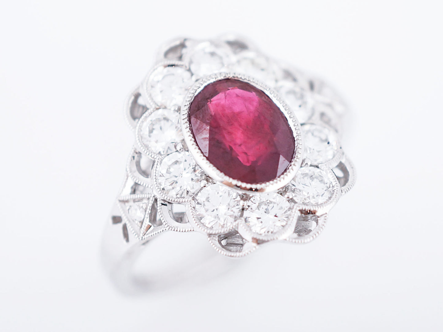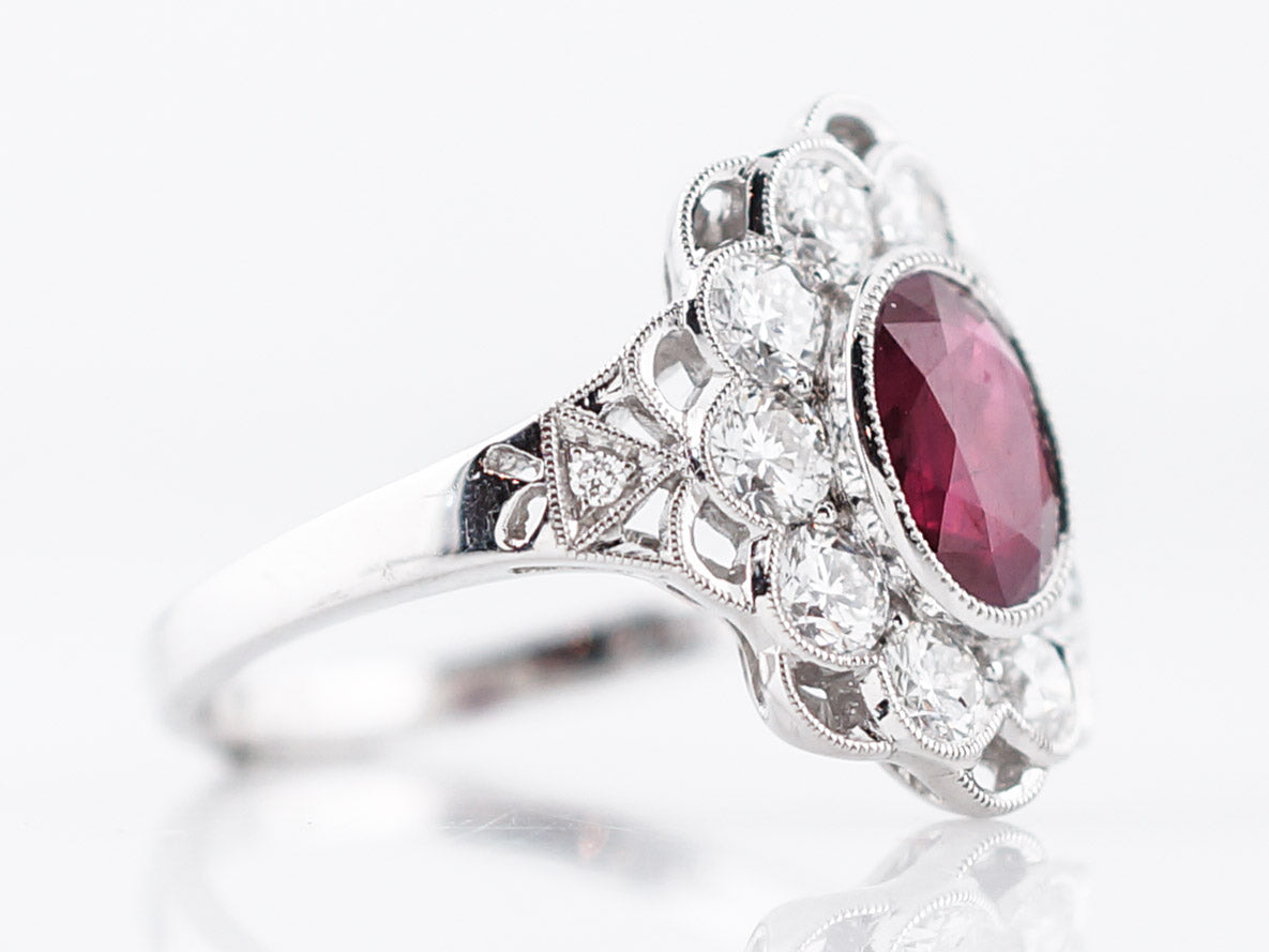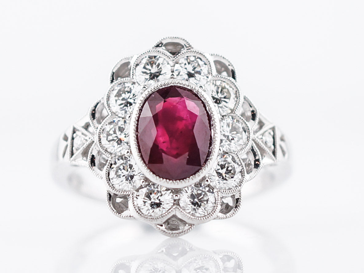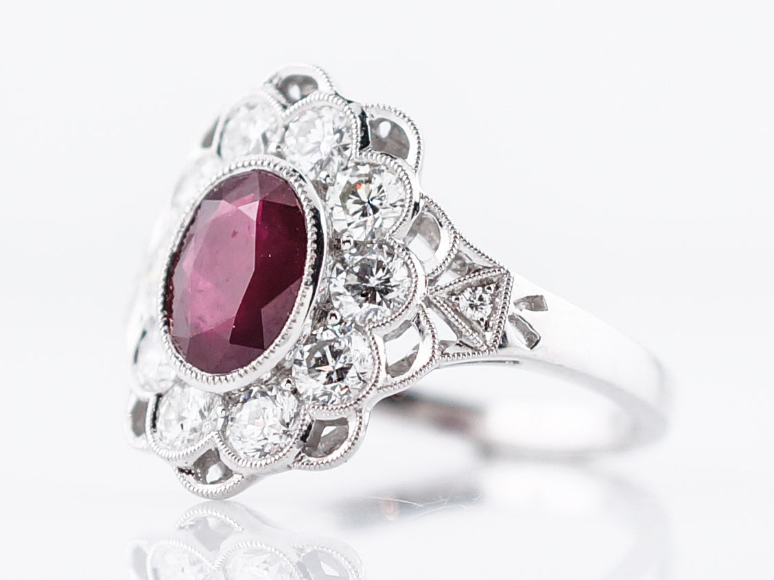 This modern right hand ring features a 1.39 carat oval cut ruby and accent diamonds in platinum. The striking ruby reflects a rich red hue. A halo of Round Brilliant cut diamonds surround the center stone. The diamonds weigh a total of 1.01 carats. Modern vintage-inspired. Milgrain details accent the trim. Finished in polished platinum. A one of a kind gift for a future family heirloom!
