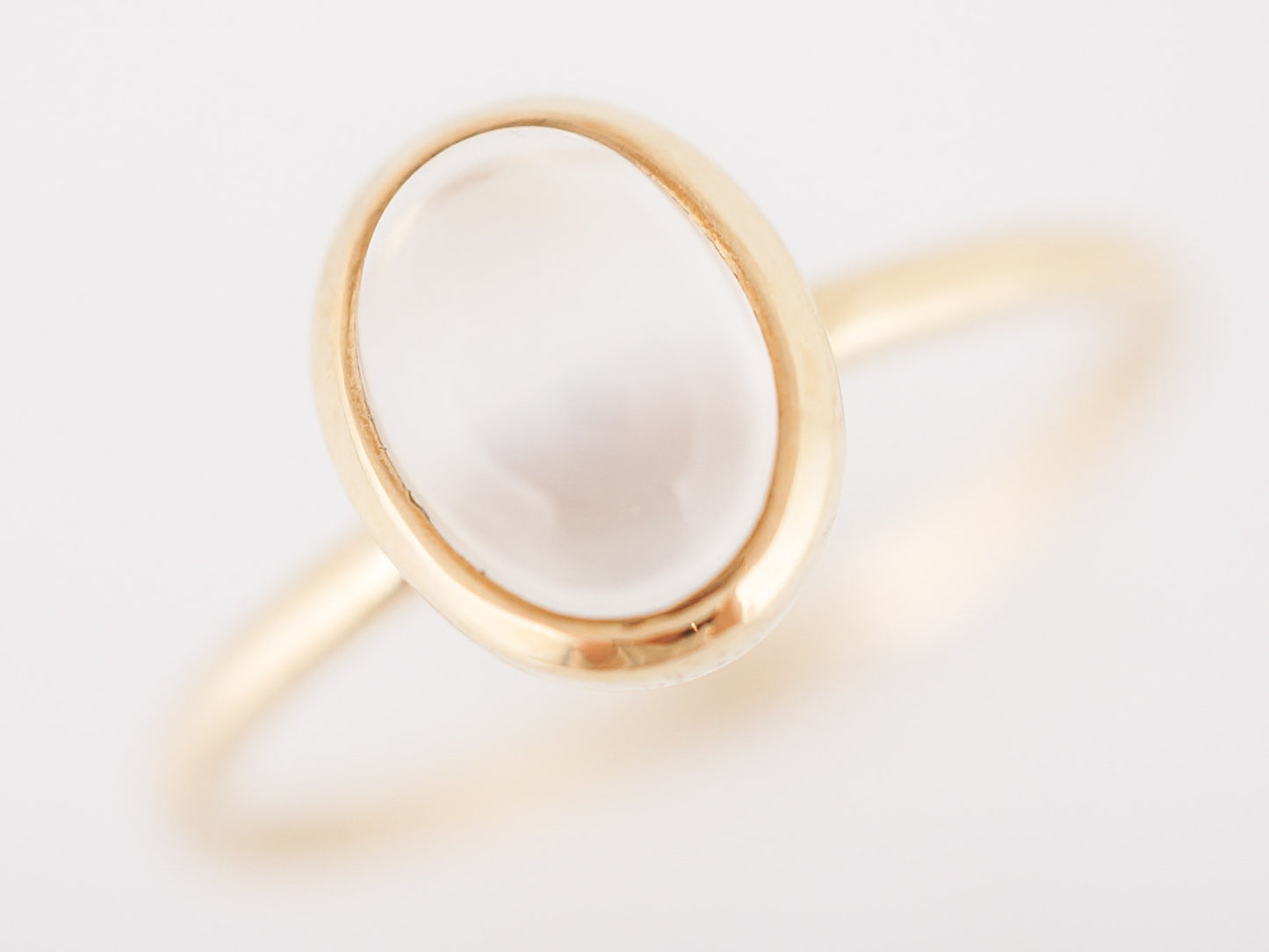 This fun, modern ring features a gorgeous 1.46 carat moonstone in a simple bezel setting. Moonstone is said to bring the wearer good fortune and we think it would be awfully good fortune to own this piece! Cast in 18 karat gold, it has a rich yellow tone too and a lovely high polish. It can be worn alone or stacked with several bands for a larger look.