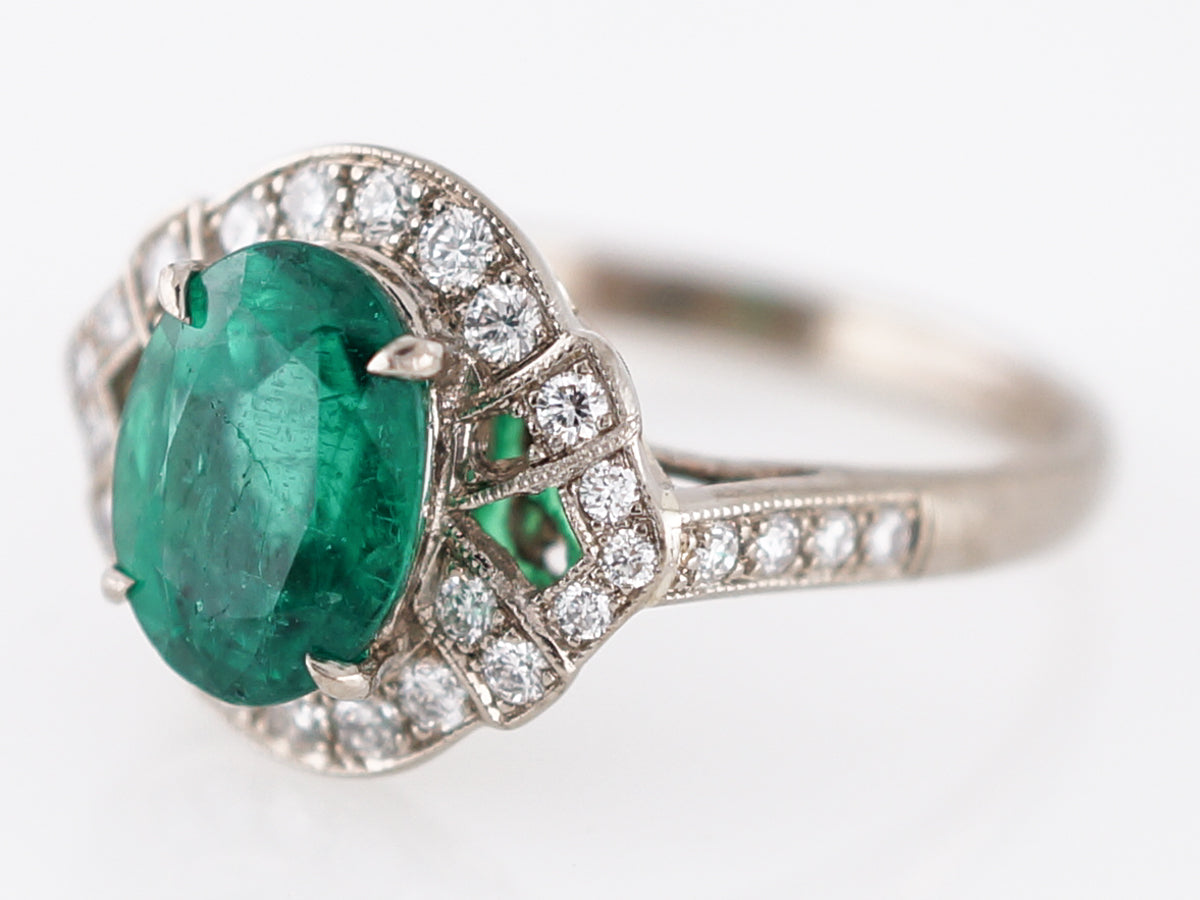 Nothing compares to the beauty of a well saturated, vibrantly colored emerald and this gorgeous ring has a spectacular quality, oval shaped emerald as its focal point. The 1.89 carat gem is surrounded by an eye shaped frame of bead set diamonds that leave a bit of negative space on each side. The negative space is a geometric shape that perfectly compliments the rest of the ring. The shoulders of this 18k white gold ring also have bead set diamonds in them so this ring is beautiful from every viewing angle.
