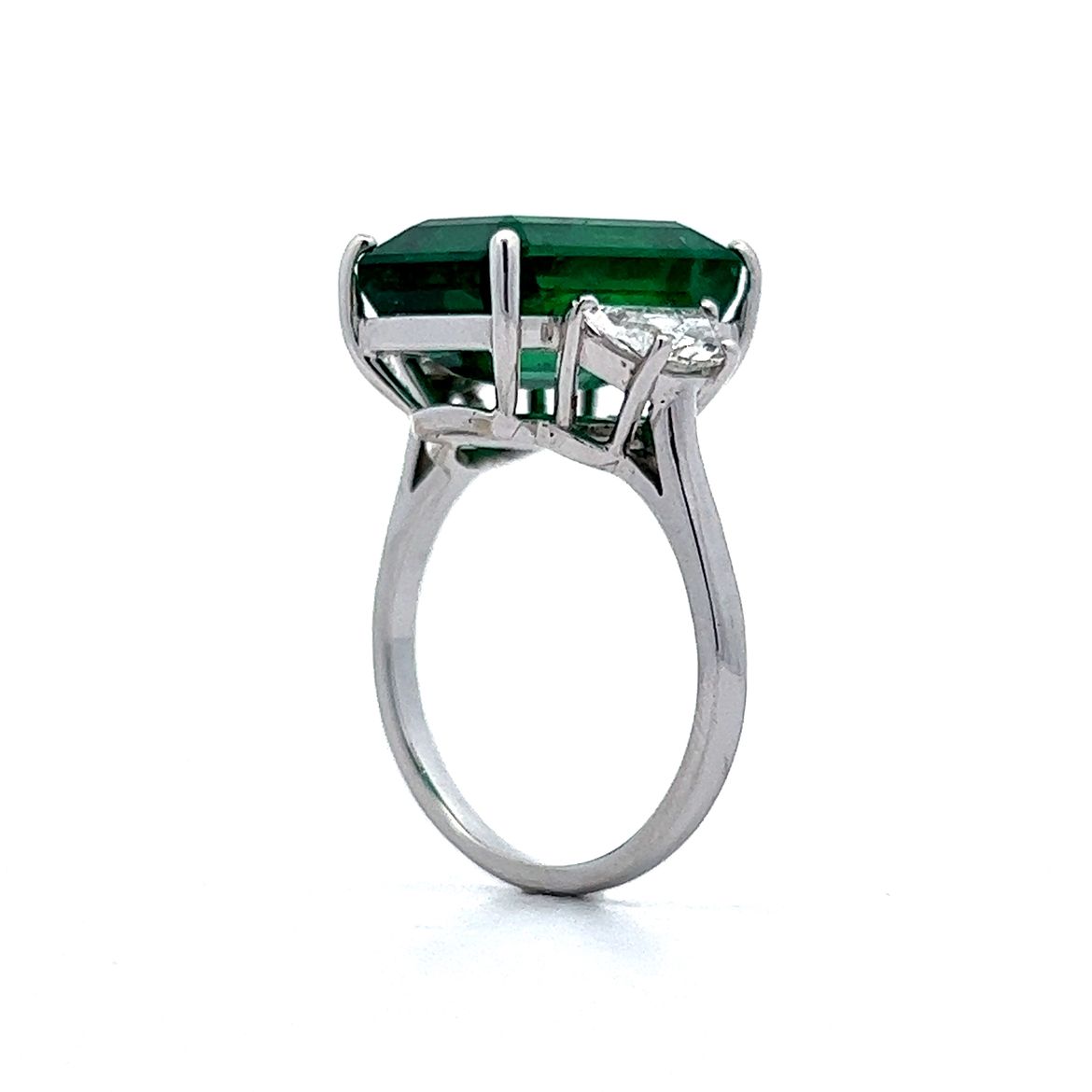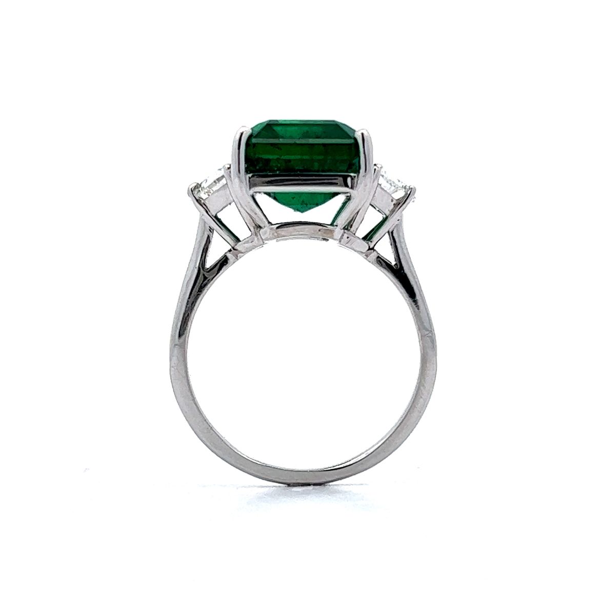 This modern emerald and diamond ring is an absolute stunner. The center stone in this ring is an immaculate 10.02 carat, GIA certified octagonal step cut emerald. The emerald reflects a cool forest green hue. Two half moon cut diamonds weighing 1.24 carats flank the center stone. This rare ring is a true heirloom piece to be passed down from generation to generation. A cocktail right hand ring with sparkle and color.