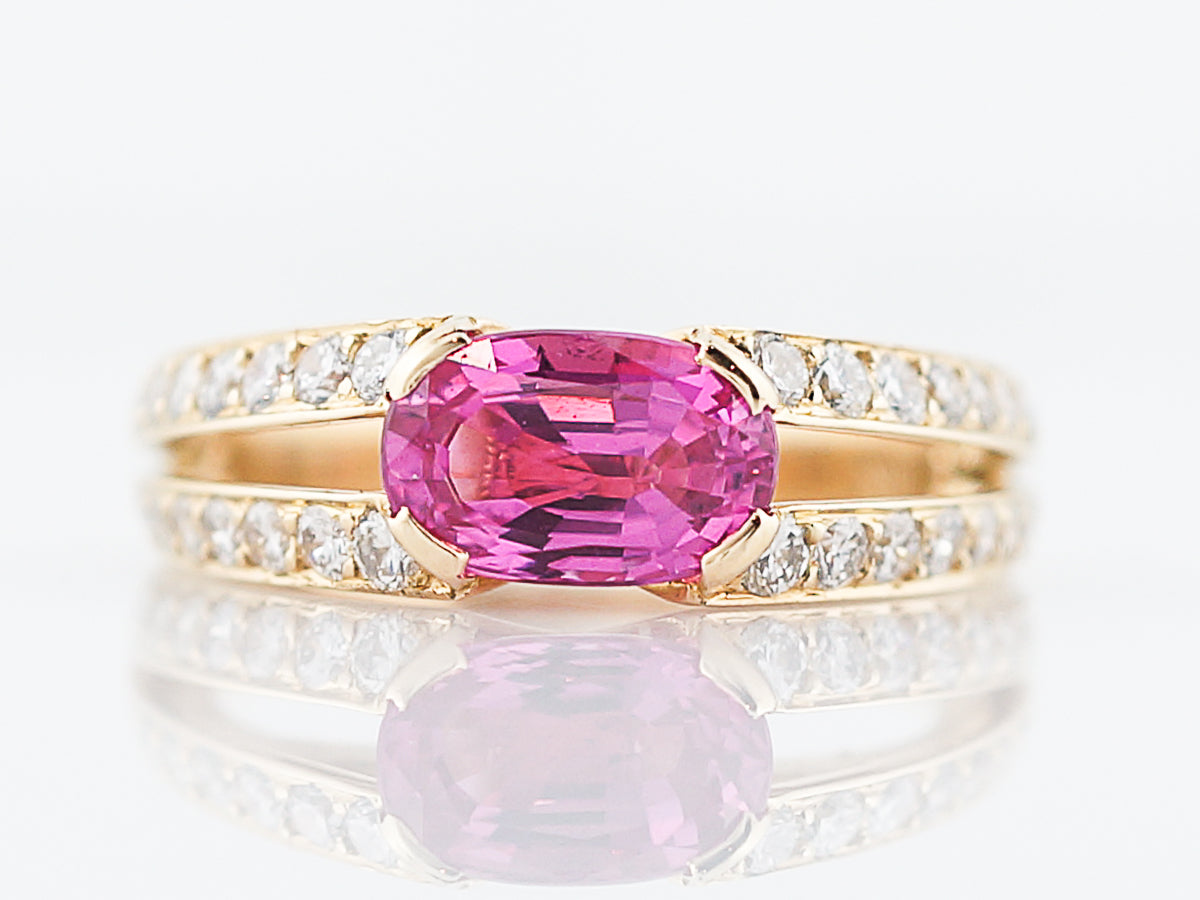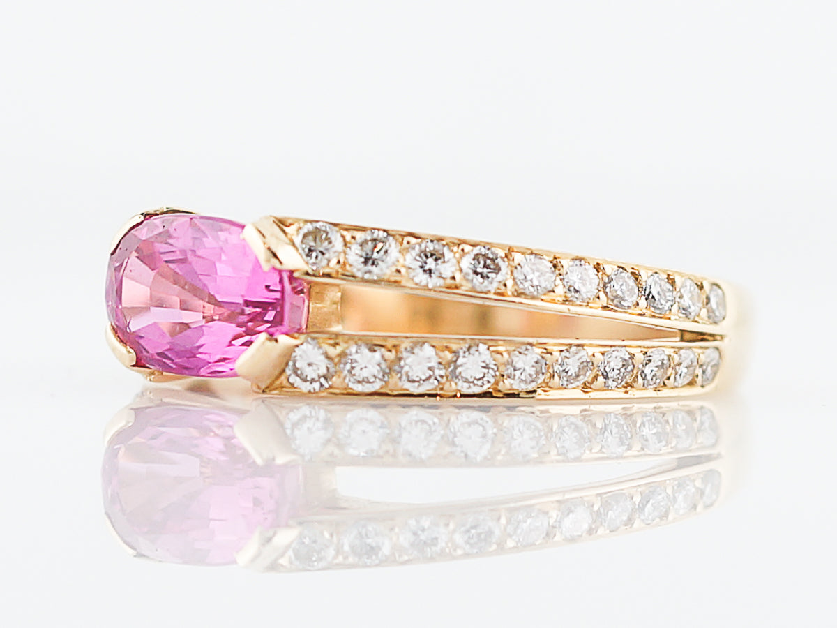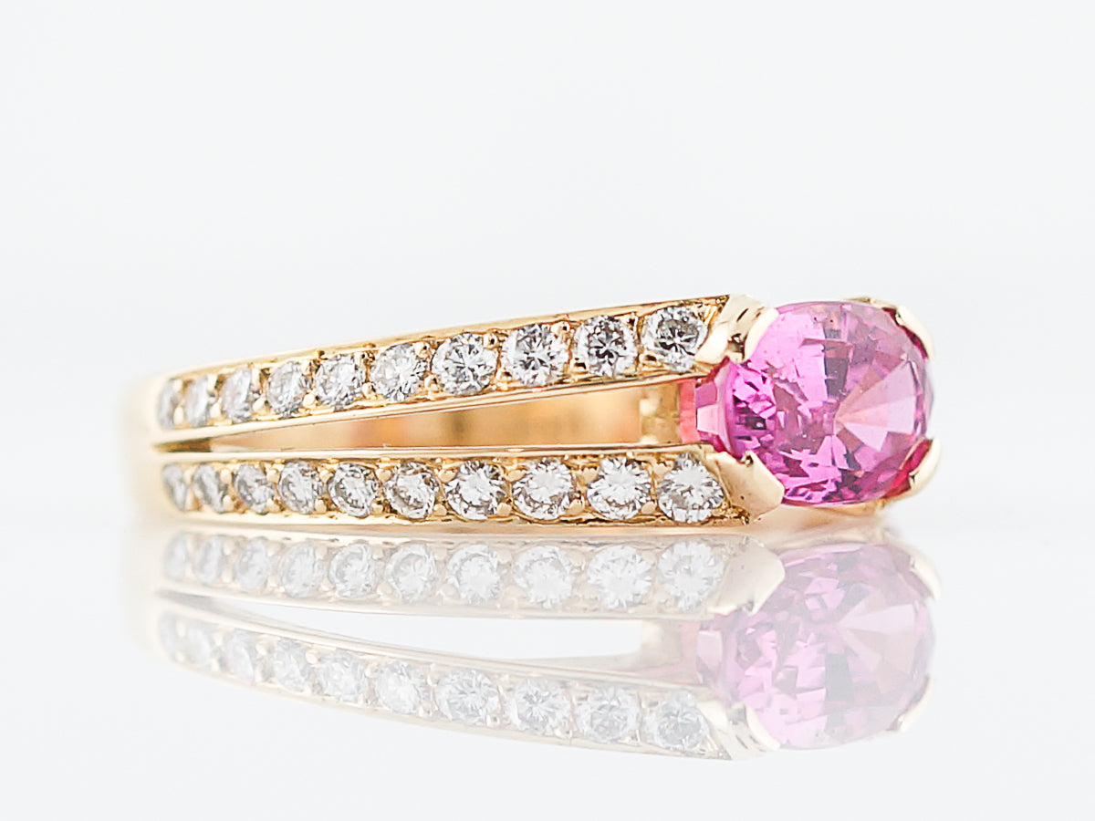 This Modern Era ring is set with a 2.00 carat Oval Cut sapphire, that is such a deliciously saturated pink we could practically eat it up. Set in four (4) wide prongs, the setting has a narrow split and comes up to meet the sapphire give the ring a nice lower profile. The setting is made in 18 karat yellow gold and has bead set round brilliant cut diamonds weighting 0.60 carats total weight.