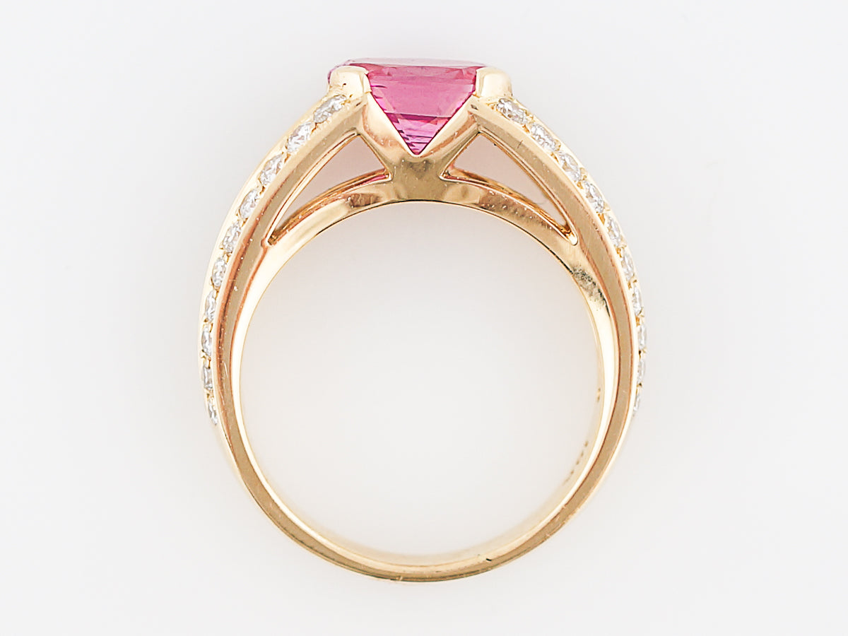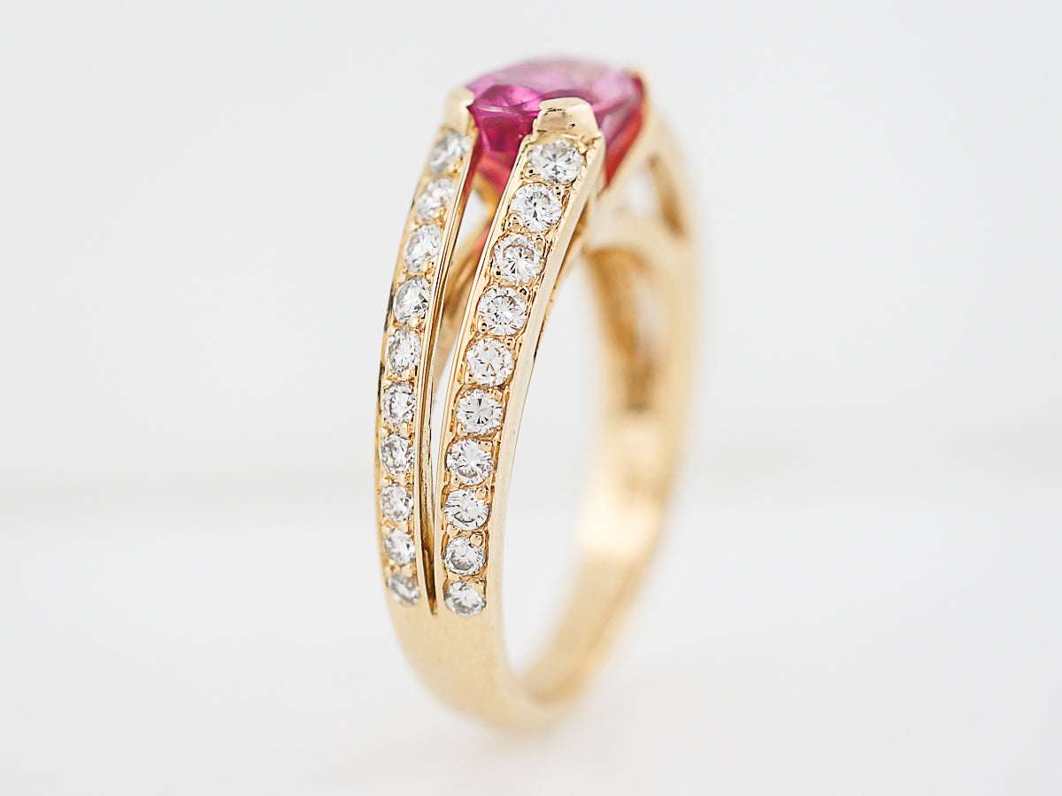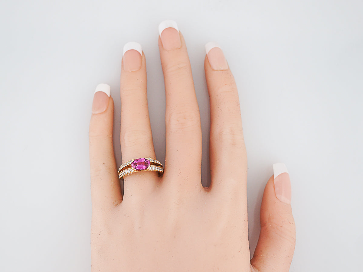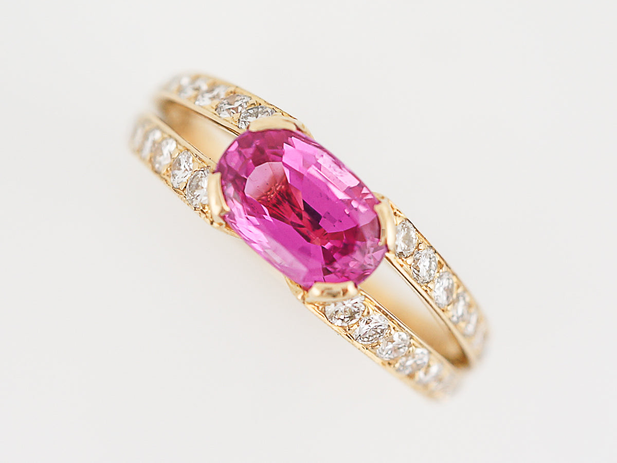This Modern Era ring is set with a 2.00 carat Oval Cut sapphire, that is such a deliciously saturated pink we could practically eat it up. Set in four (4) wide prongs, the setting has a narrow split and comes up to meet the sapphire give the ring a nice lower profile. The setting is made in 18 karat yellow gold and has bead set round brilliant cut diamonds weighting 0.60 carats total weight.
