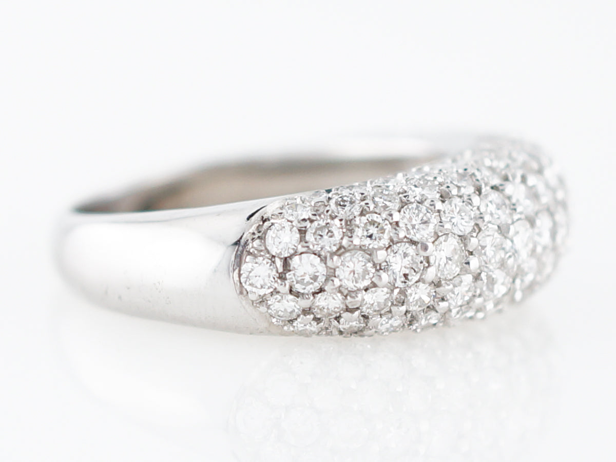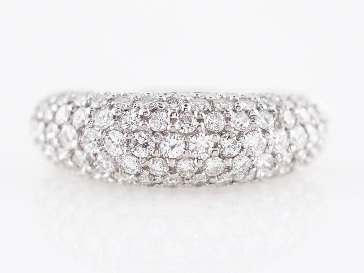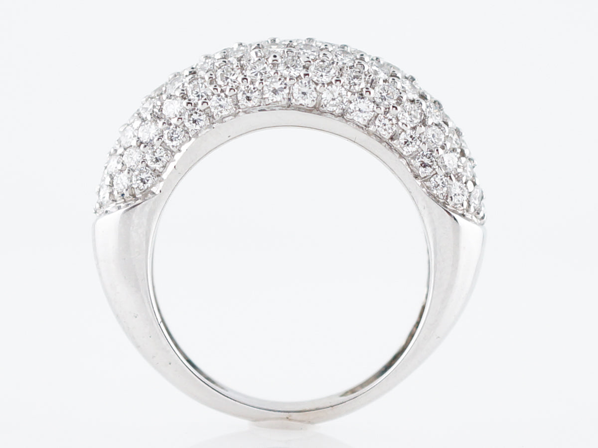 This outstanding diamond band is made with pave set Round Brilliant cut diamonds. A collection of 2.14 total carats of diamonds make this stacking band every jewelry lovers dream. Modern elegant. This dome shaped statement ring features enough dazzle to stand on its own but would also make an impressive addition to a ring stack. Finished in 18 karat white gold.