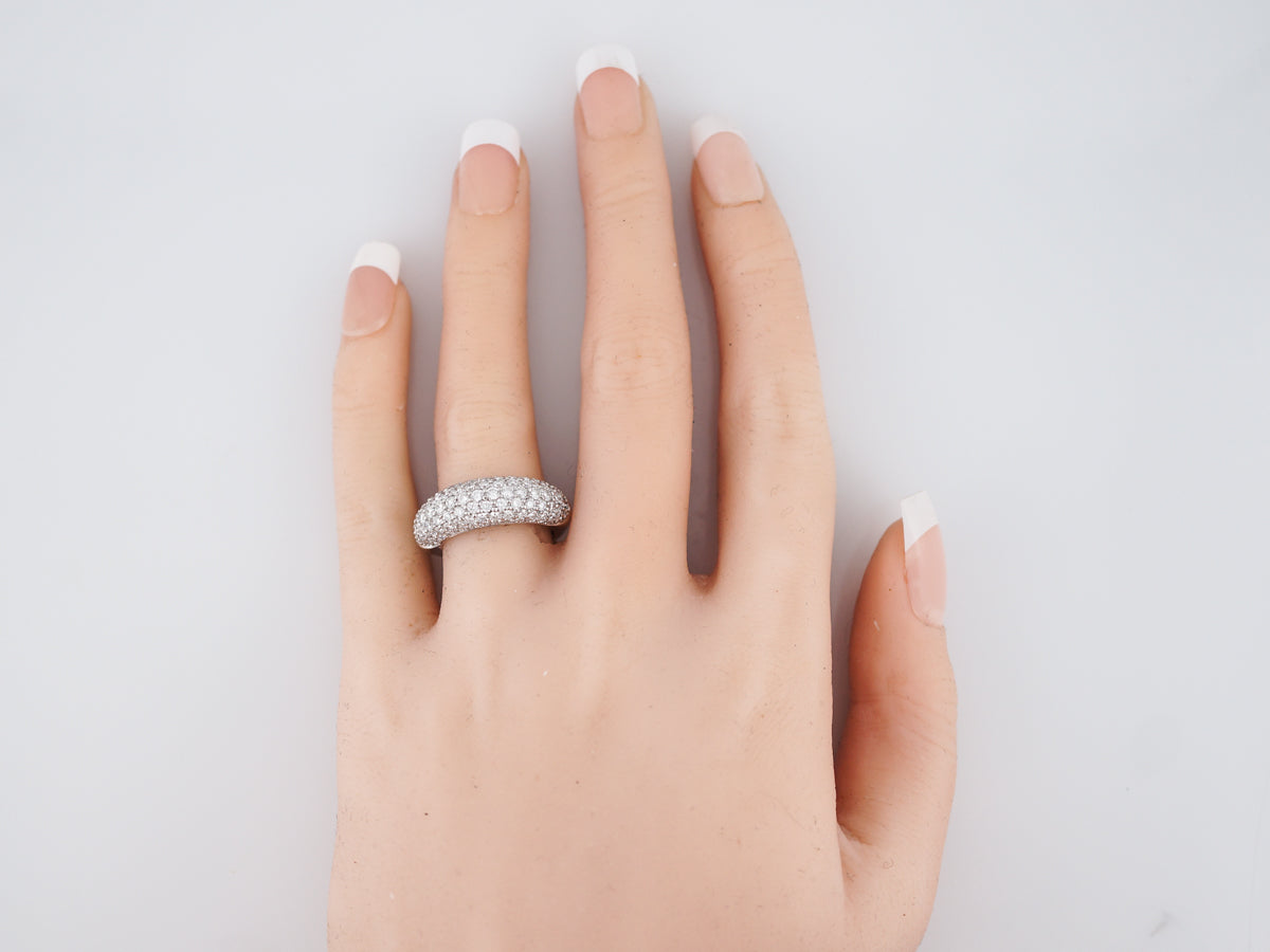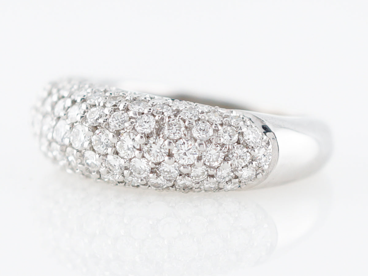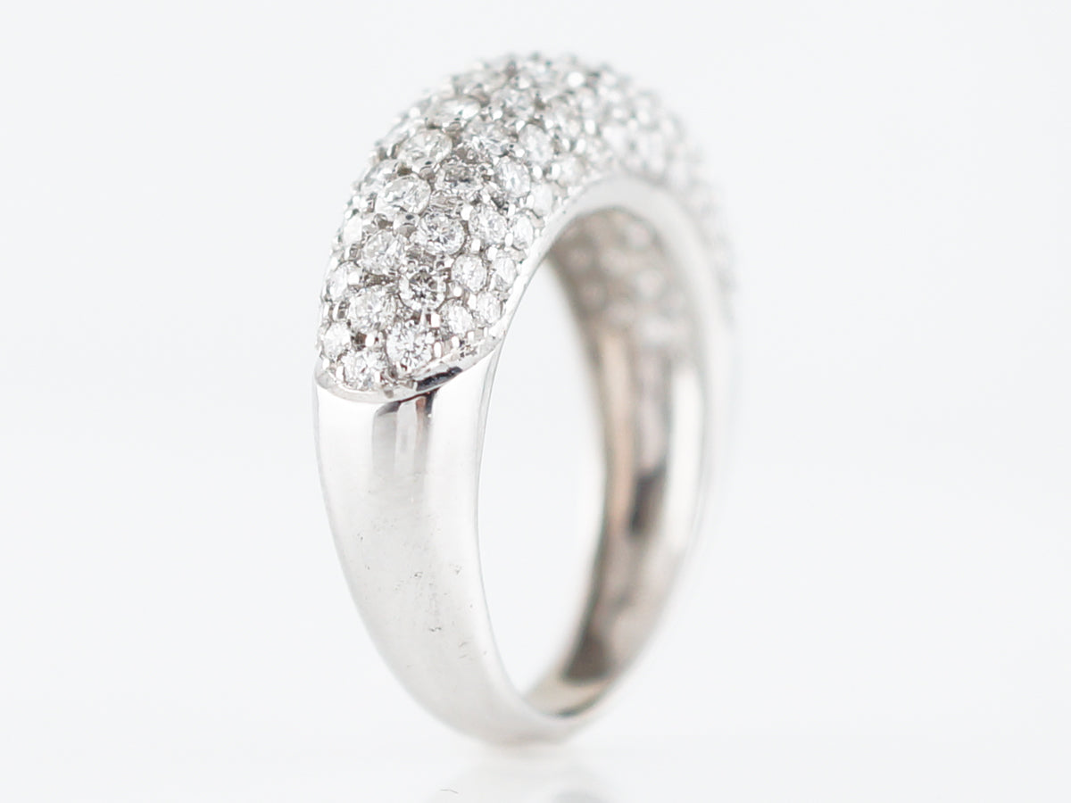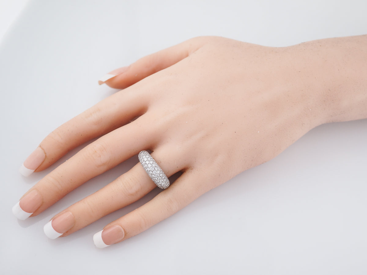 This outstanding diamond band is made with pave set Round Brilliant cut diamonds. A collection of 2.14 total carats of diamonds make this stacking band every jewelry lovers dream. Modern elegant. This dome shaped statement ring features enough dazzle to stand on its own but would also make an impressive addition to a ring stack. Finished in 18 karat white gold.