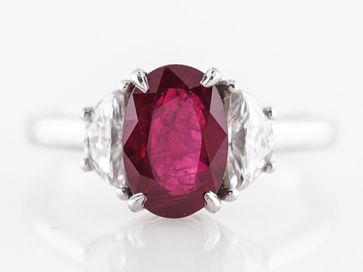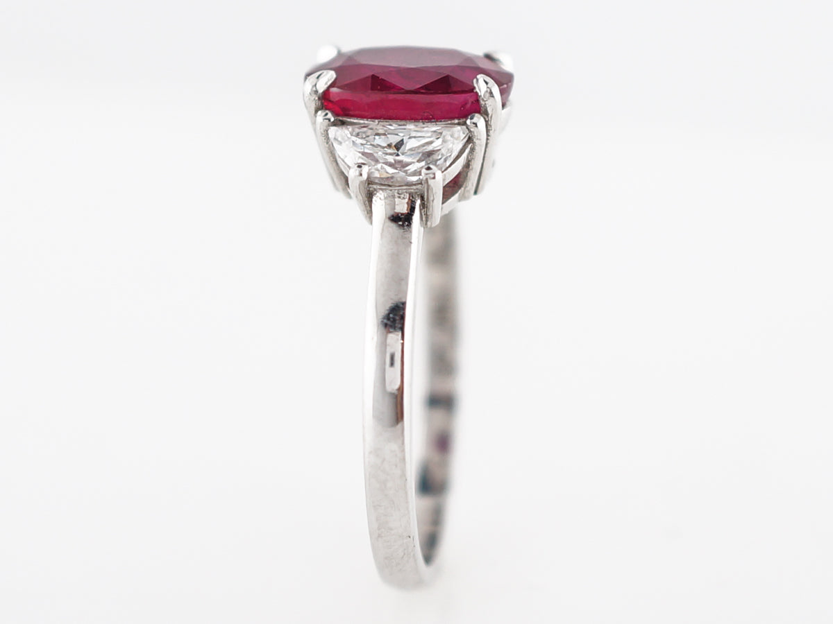 This color of the ruby in this Modern ring is as impressive as its size. This vivacious gemstone weighs 2.19 carats and its flanked by a half moon diamond on each side. The shape of the diamonds are a perfect compliment in shape and size to the oval ruby. The diamonds are I color and VS2 clarity. This prong set ring is made with bright, white platinum that is all polished to a high finish. This ruby ring would make a lovely colored stone engagement ring or a striking right hand ring.