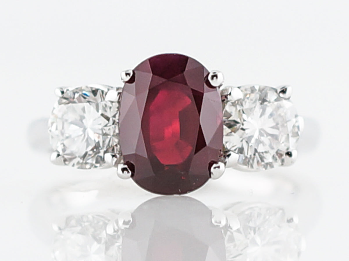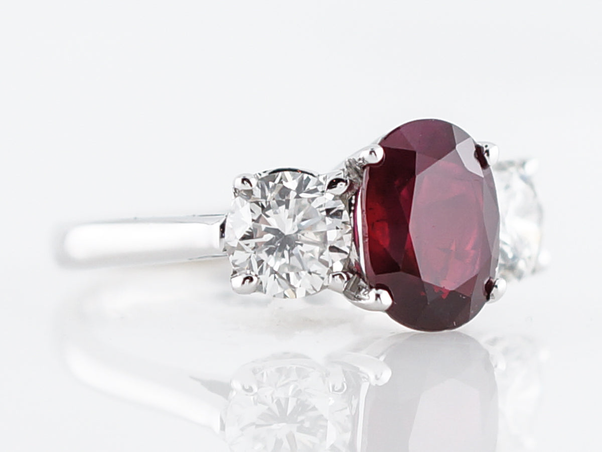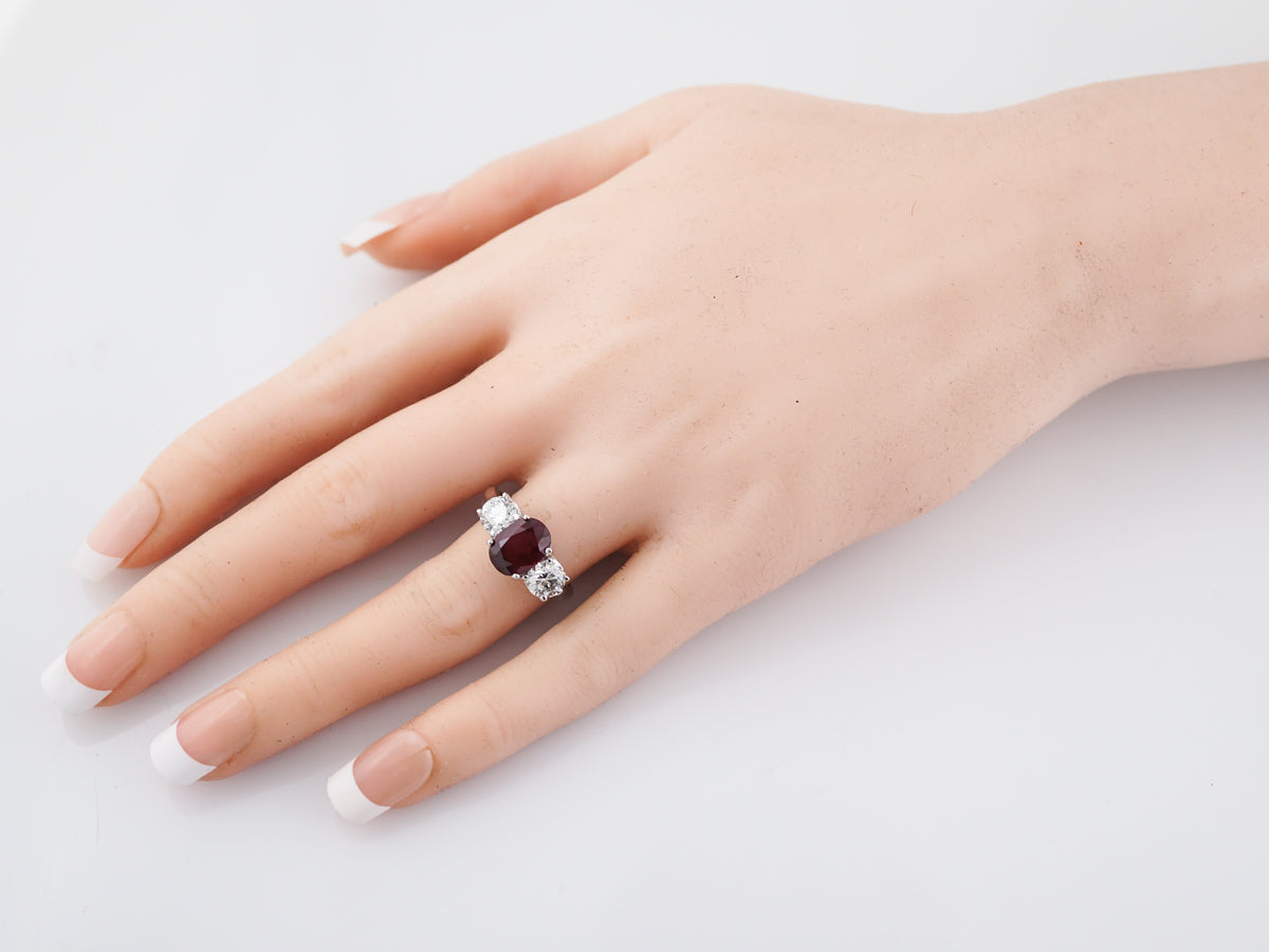 The rich colored ruby that sits in the center of this ring weighs 2.26 carats and its flanked by round brilliant cut diamonds. The true red color of this stunning ruby is both rare remarkable. The round diamonds add a significant amount of sparkle and they total 1.30 carat. This gorgeous ring would be a lovely right hand ring but its also durable enough to work as an engagement ring.