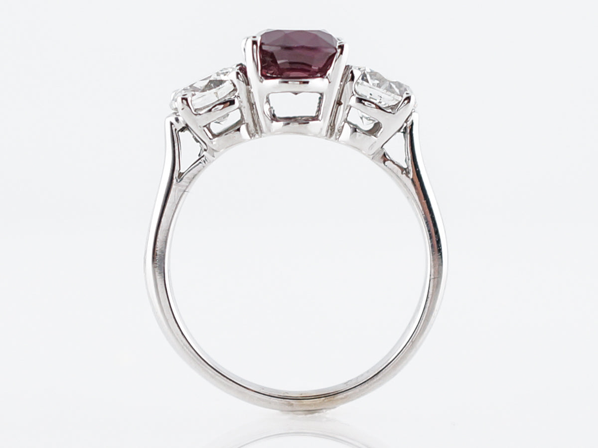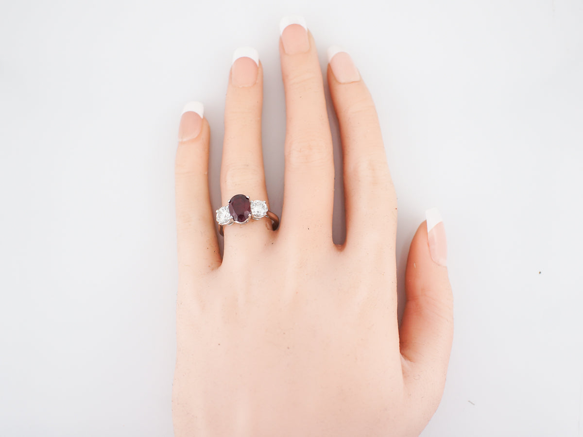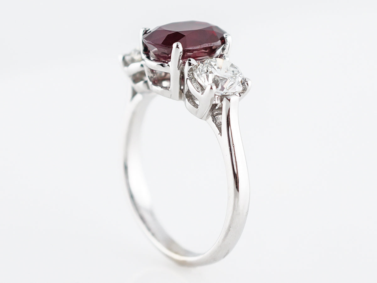The rich colored ruby that sits in the center of this ring weighs 2.26 carats and its flanked by round brilliant cut diamonds. The true red color of this stunning ruby is both rare remarkable. The round diamonds add a significant amount of sparkle and they total 1.30 carat. This gorgeous ring would be a lovely right hand ring but its also durable enough to work as an engagement ring.