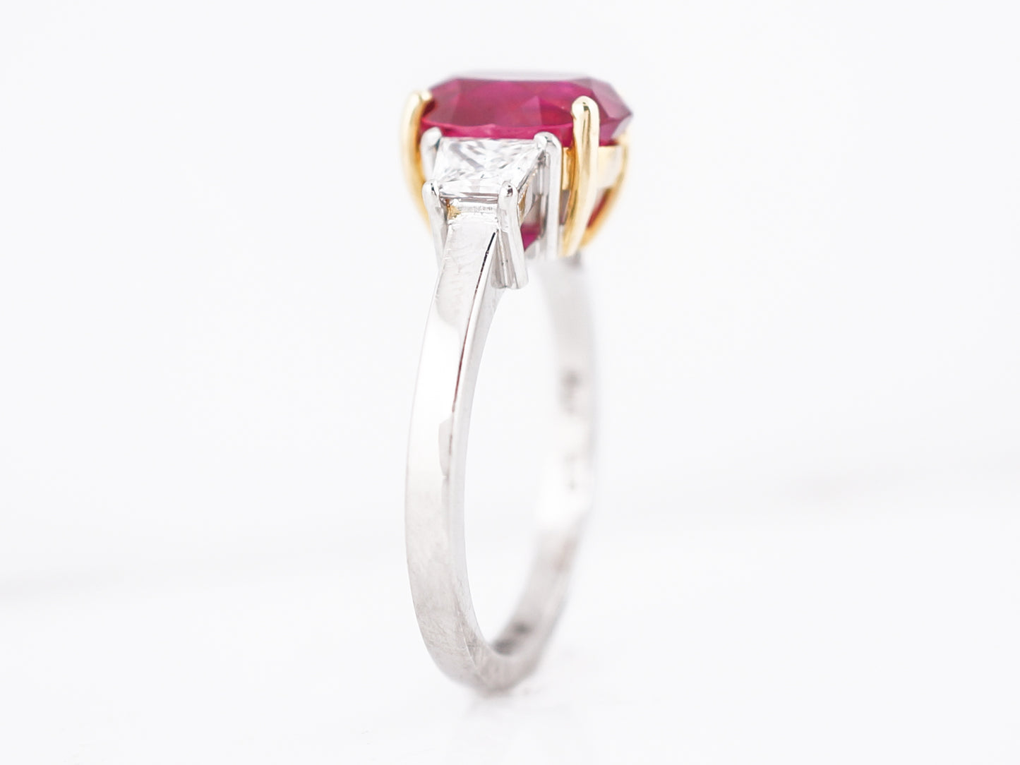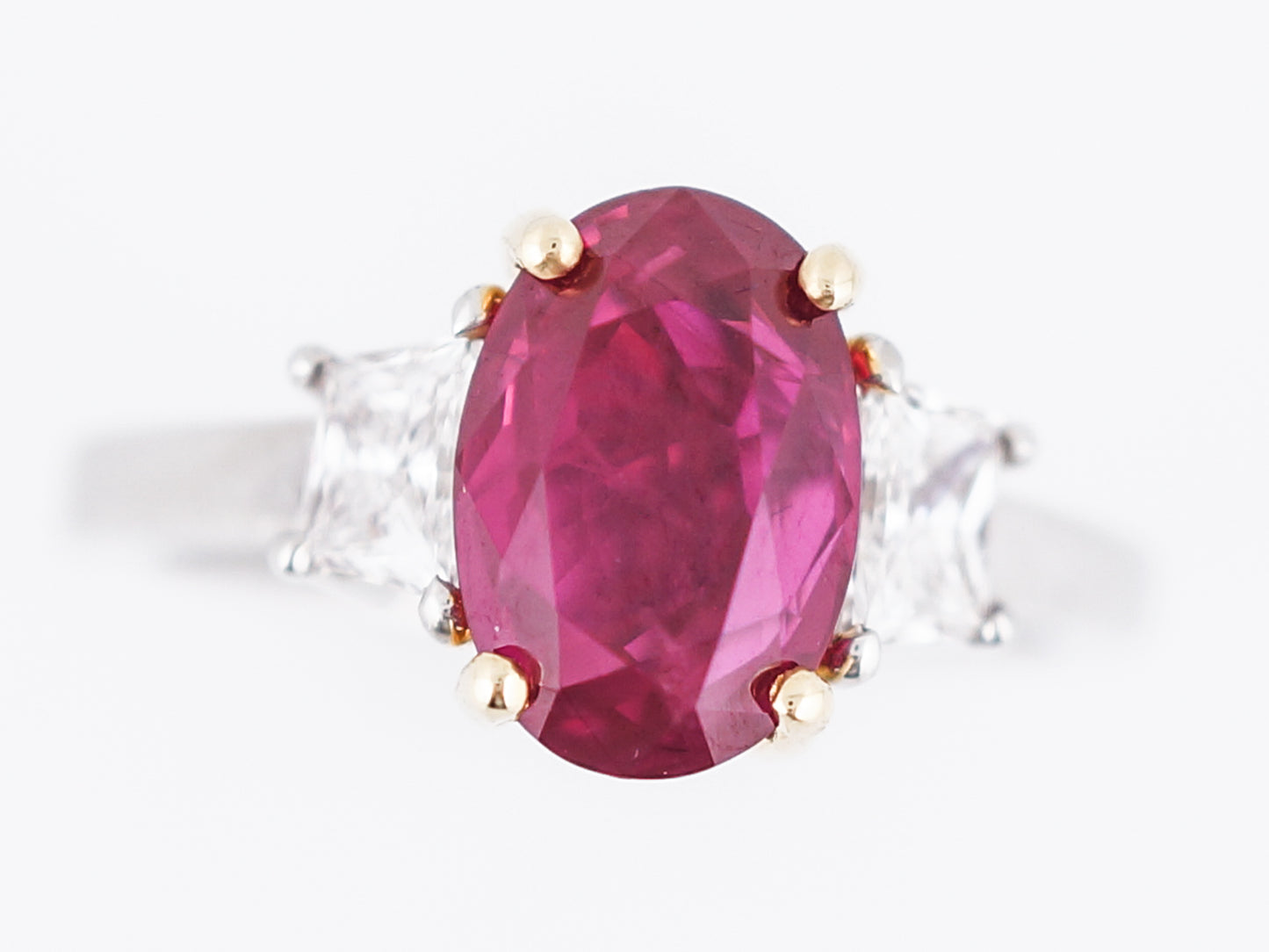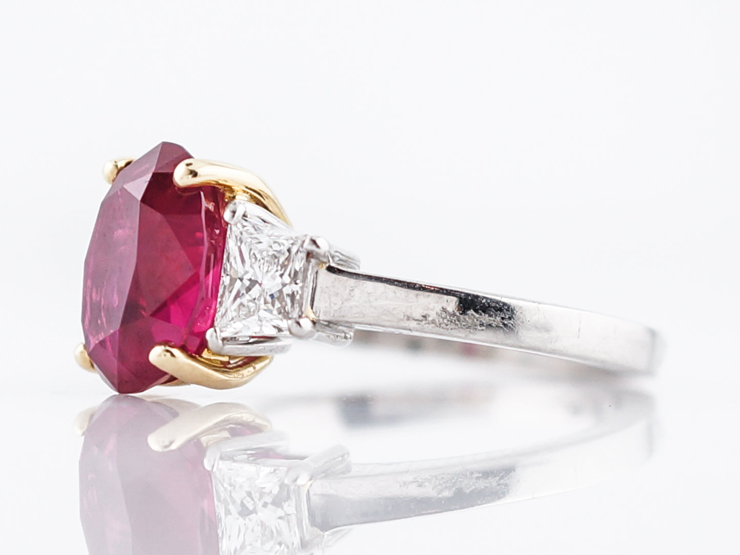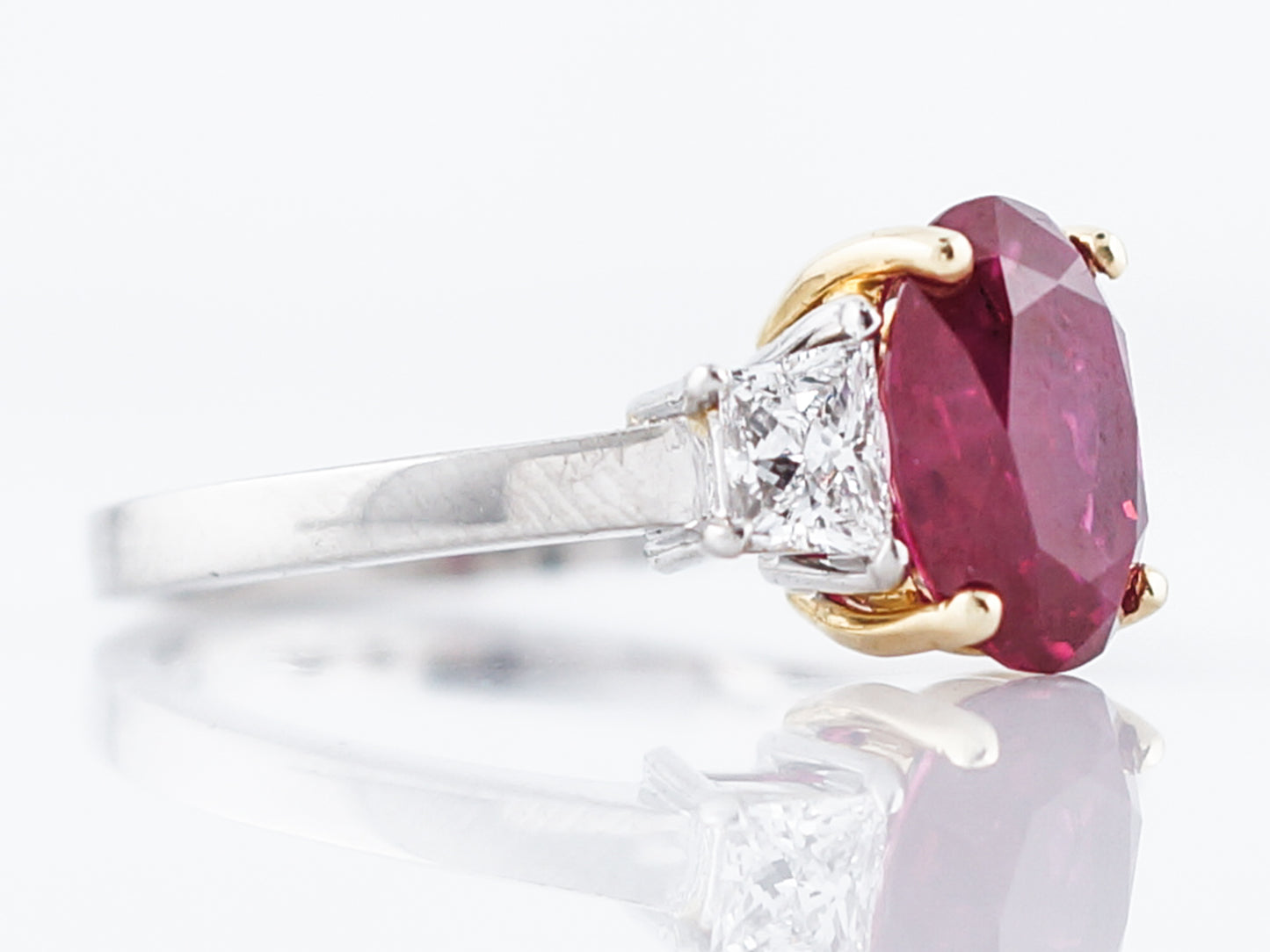 This Modern Era three stone style ring is a forever classic! Set in 18 karat yellow gold prongs, the center stone is an oval shaped Ruby weighing 2.97 carats that has been certified by the Gemological Institute of America (GIA). The rest of the setting is made in platinum, and on each side of the center stone is an F color, VS2 clarity trapezoid cut diamond. This ring is a wonderful way to signify a July birthday or could be used as a gorgeous non traditional engagement ring.