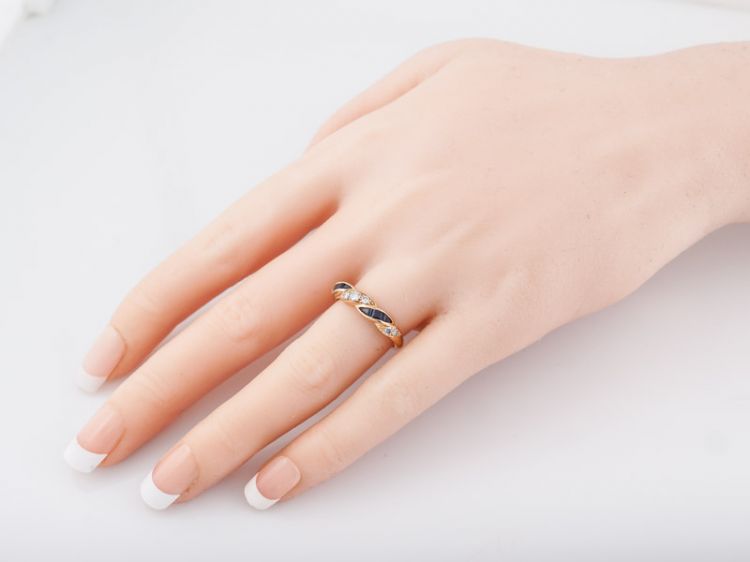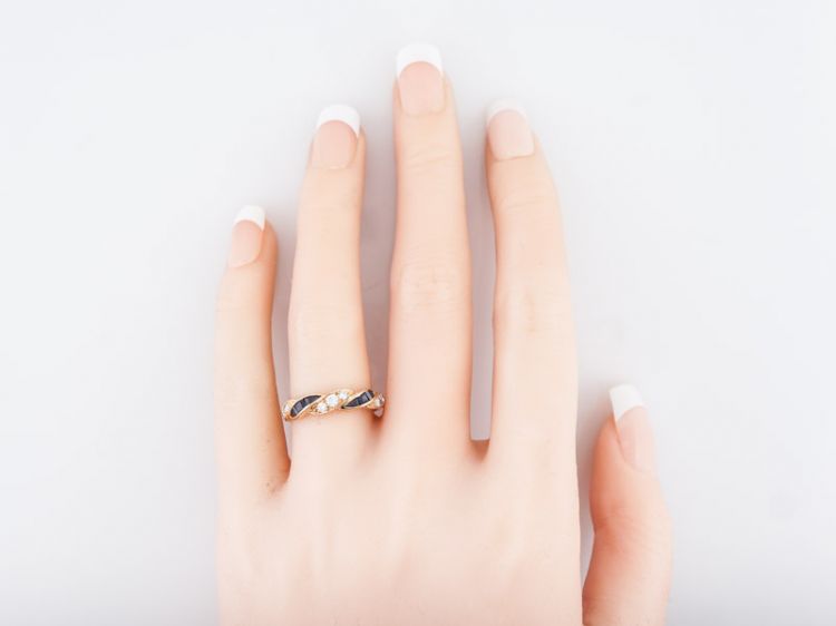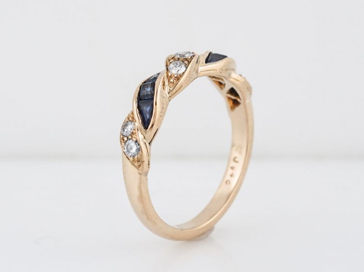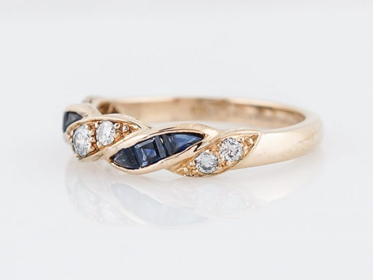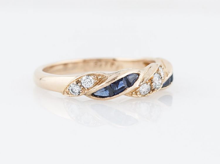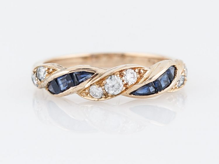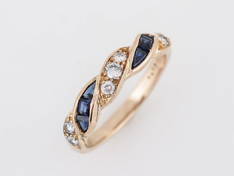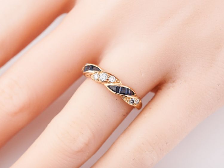 This right hand ring is made by the reputable Oscar Heyman Brothers of New York. Its made of 18k yellow gold and has a twist design on the front half of the band. The band has .24 carat round brilliant cut diamonds that look like they are braided with a ribbon of .38 carat square step cut blue sapphires.