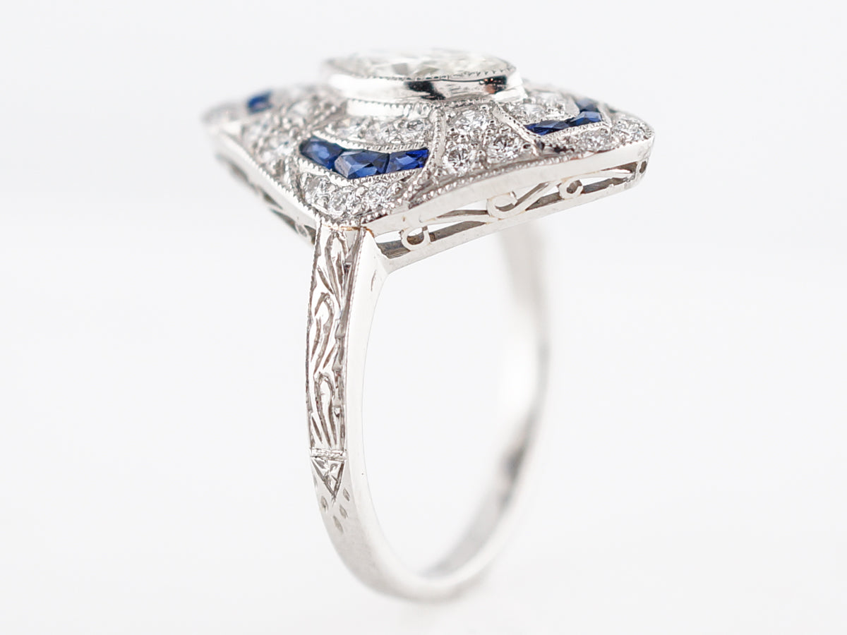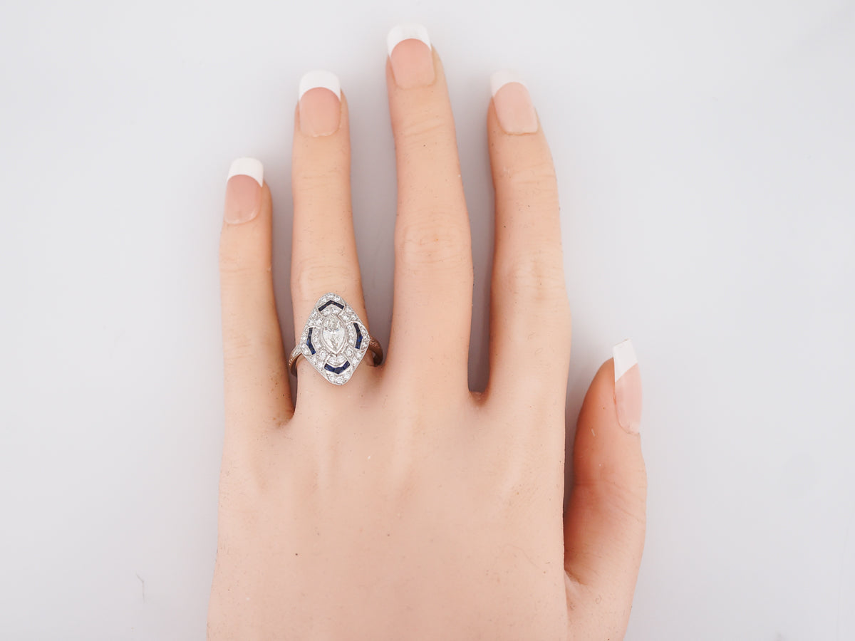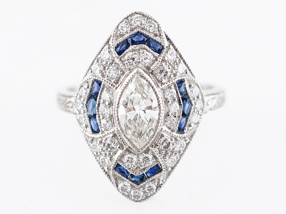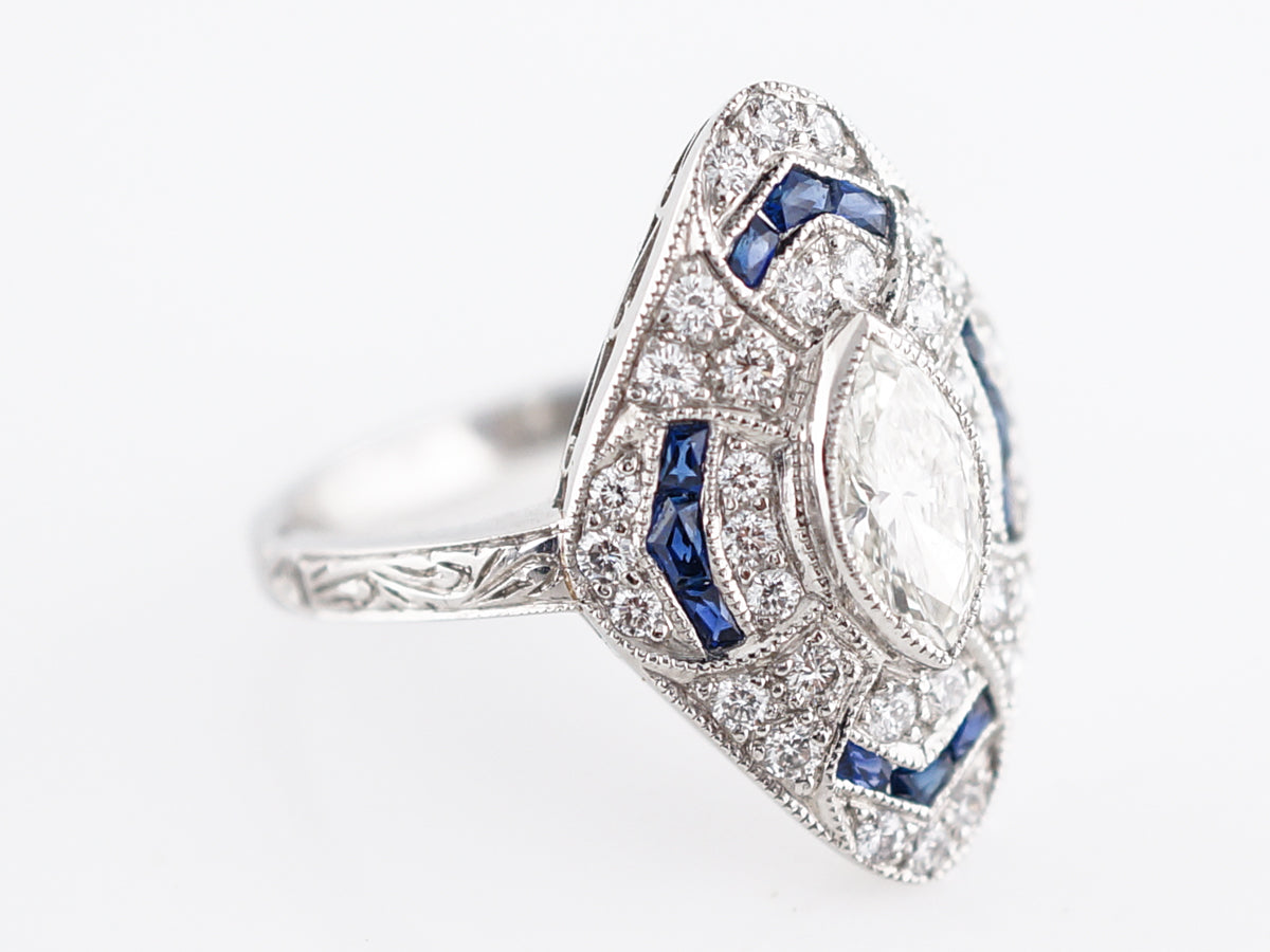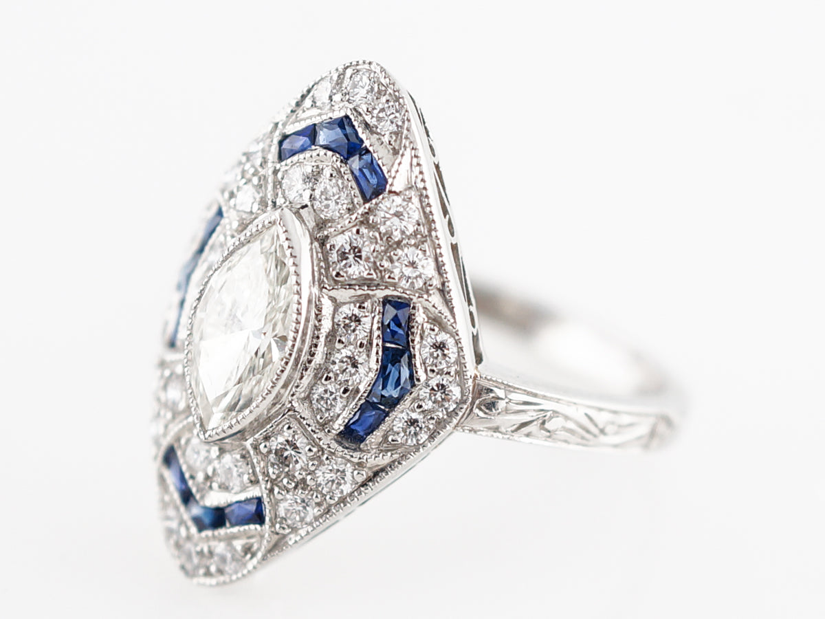 This elegant ring brings together some of our favorite features of both Antique and Modern jewelry. It has so many compelling details but what stands out to us is the many layers that make up this impressive piece. The center diamond is a .54 carat marquise cut diamond and the rest of the ring is a series of diamonds and sapphires outlining and mimicking the shape of the marquise. The milgrain that trims and defines the diamonds and sapphires reminds us of Art Deco baubles even though this ring is new. Its a noticeably large ring even though it has a low profile. This ring is made with sparkling white platinum.