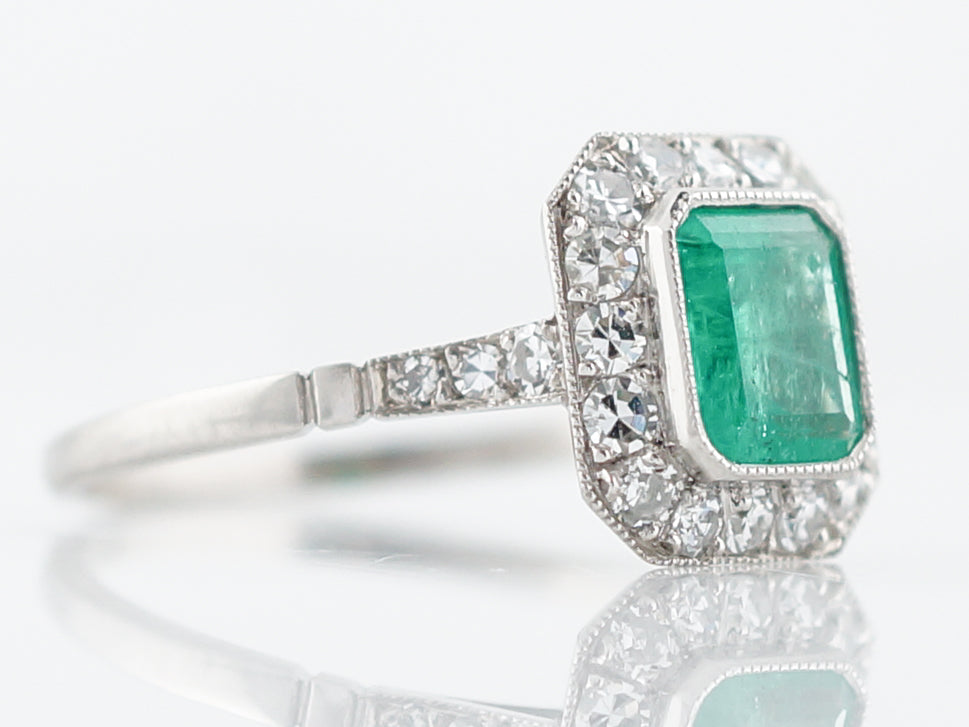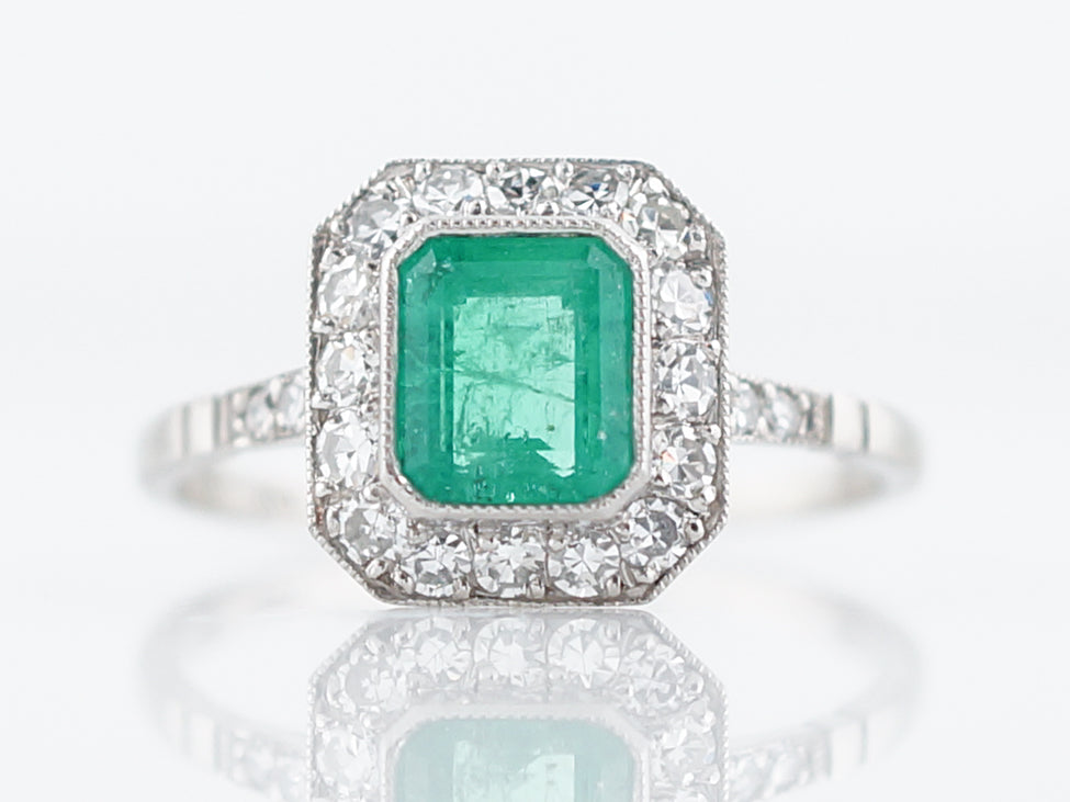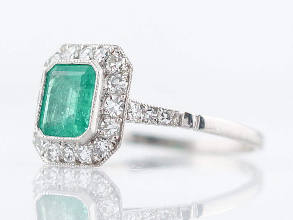 Were convinced the vivid green Emerald in this Modern Platinum ring will bring you all the luck! The Emerald cut Emerald in the center is bezel set and surrounded by a halo of bead set diamonds with more diamonds running down the delicate shank for a total .42 carat of diamonds. A great way to celebrate your favorite May birthday or just for someone who goes gaga for green, this piece will make anyone smile.