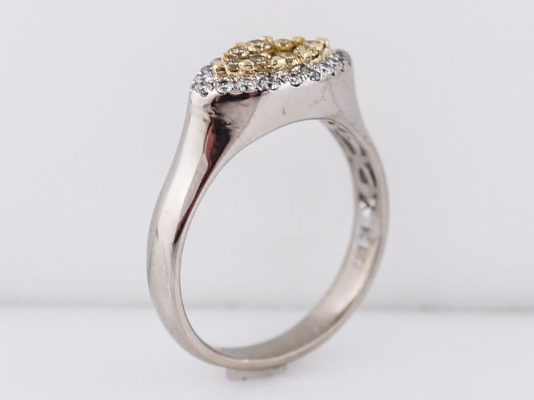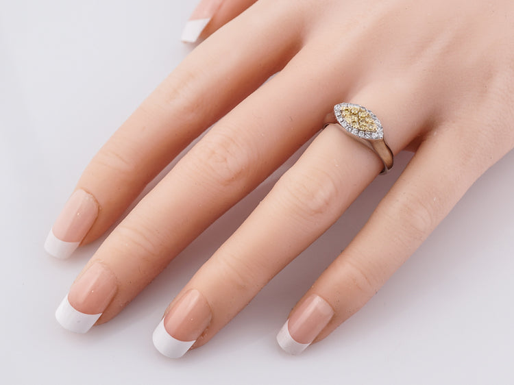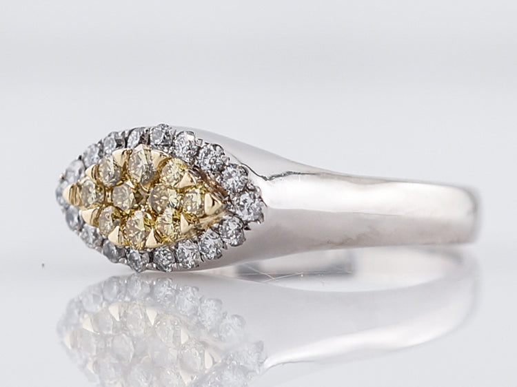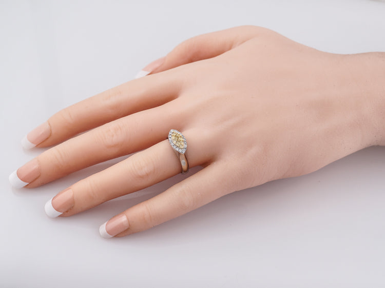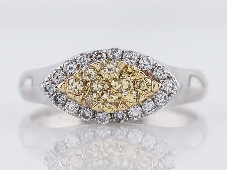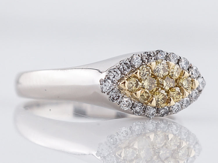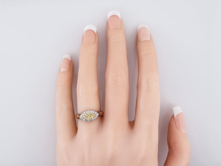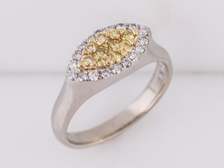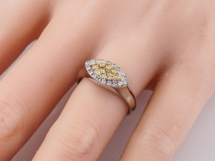 This Modern 18 karat gold right-hand ring is finely crafted in brightly polished two-tone style. It features a marquise shaped section of round brilliant cut yellow diamonds set in 18k yellow gold surrounded by a marquise shaped halo of bright white round brilliant cut diamonds set in 18k white gold. The simplicity of the crown transitioning into the shank mixed with the two-tone metals and diamonds give it a wonderful Modern appeal.
