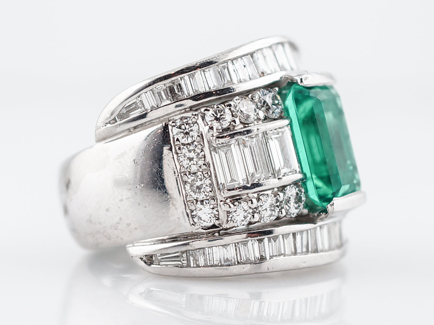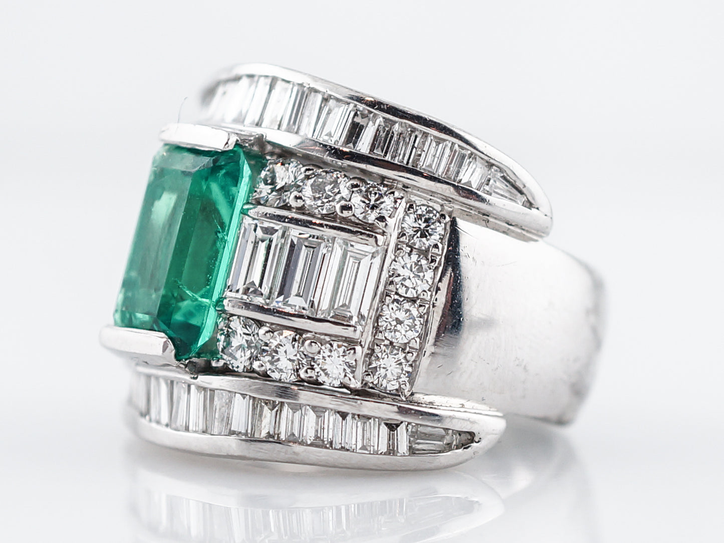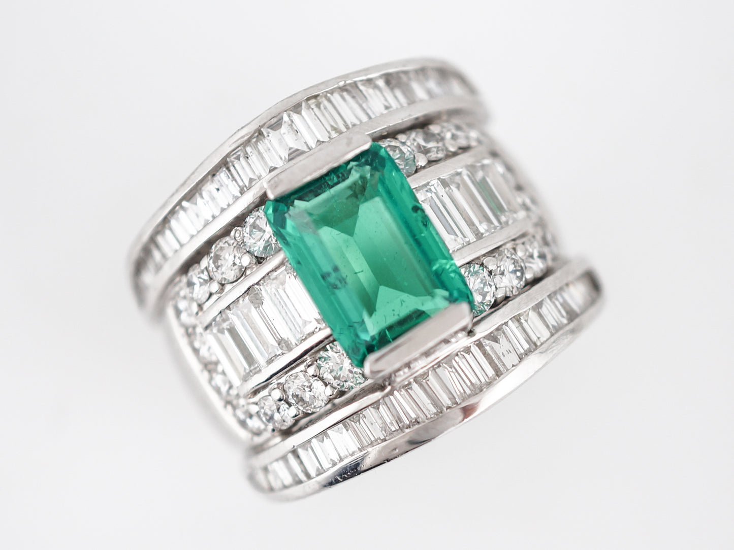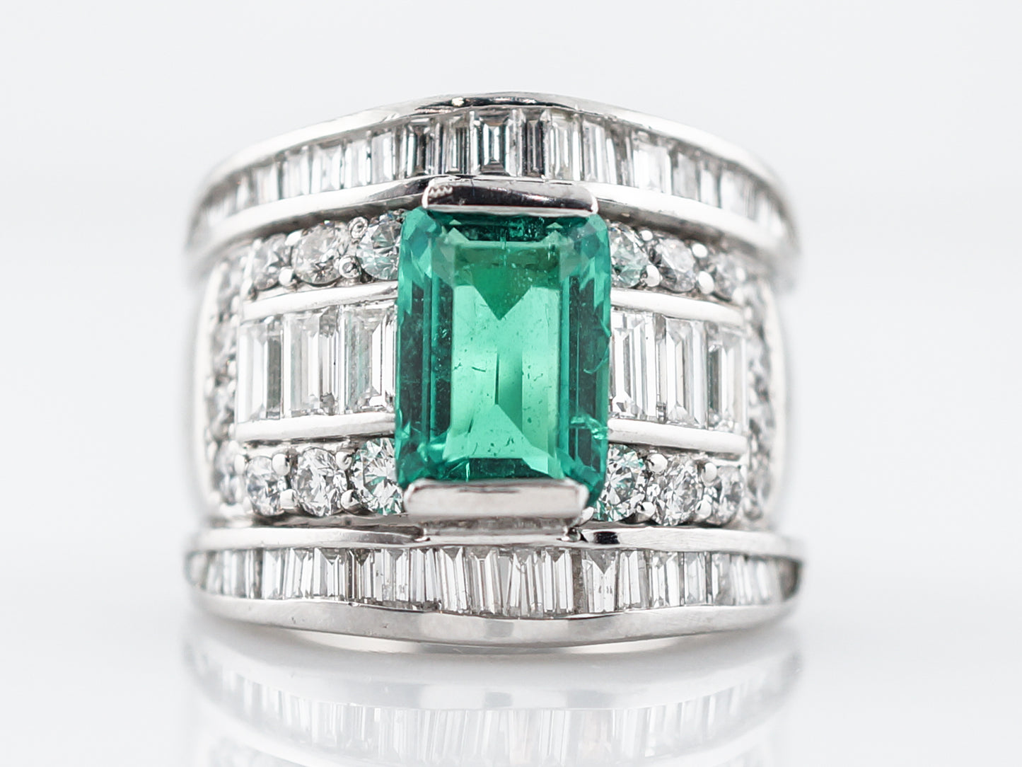 This modern right hand ring features a 3.06 carat GIA certified emerald. The emerald is an emerald cut with a vibrant green translucent transparency. The emerald is flanked by three (3) baguette diamonds in a channel setting on each side of the center stone. Around the channel of baguette cut diamonds are twenty (20) bead set round brilliant diamonds. The exterior diamond channels are set with forty-two (42) baguette diamonds tapering in size. The total diamond weight is 3.25 carats. This platinum wide band measures 20.33 mm in width.