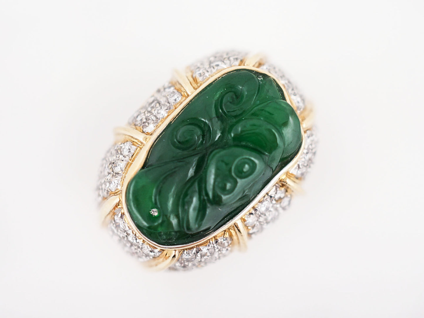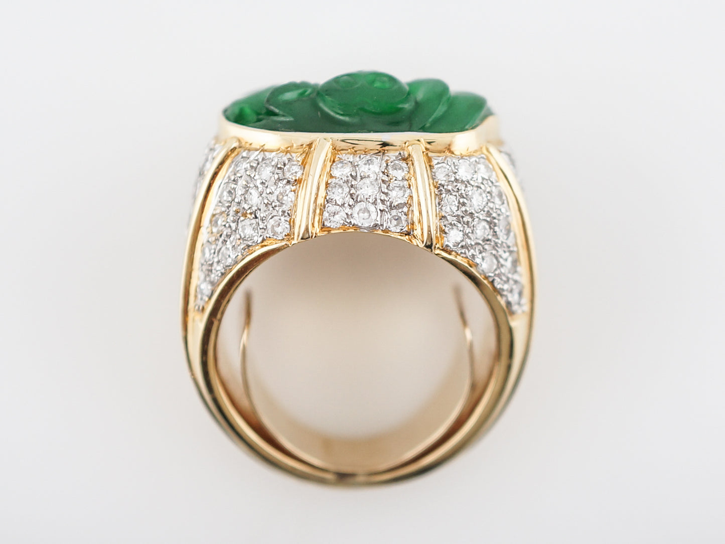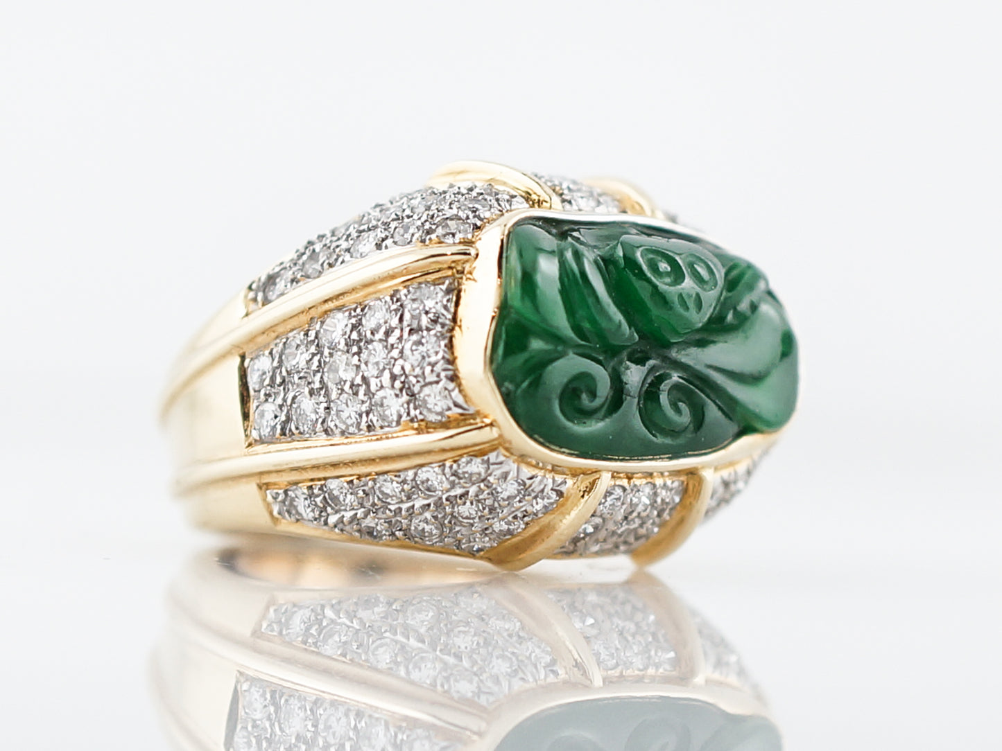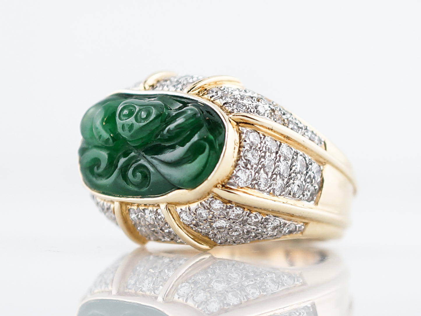 This Modern era jade and diamond ring is an extremely rare find. The GIA certified piece of jade is an exceptional specimen with its strong color and translucency. Its evident from the pierced carving that the gemstone was carved by a highly skilled craftsperson. The 14k yellow gold setting is filled with .92 carat in diamonds separated by stripes of metal. This ring is a striking piece that is sure to be noticed.