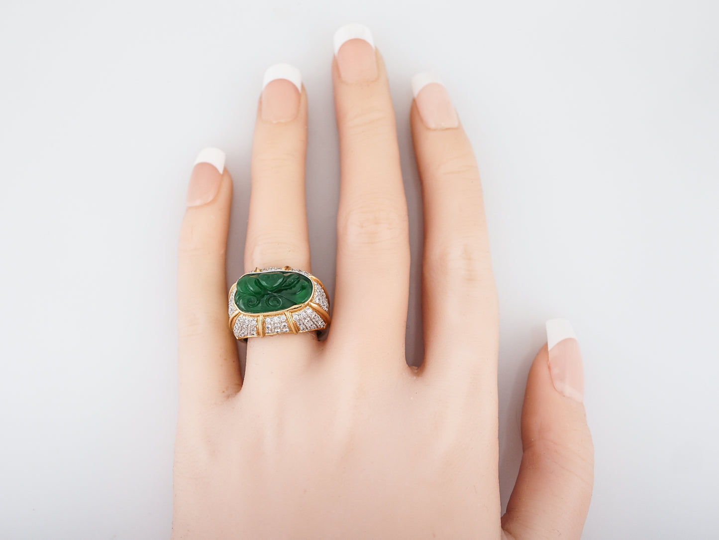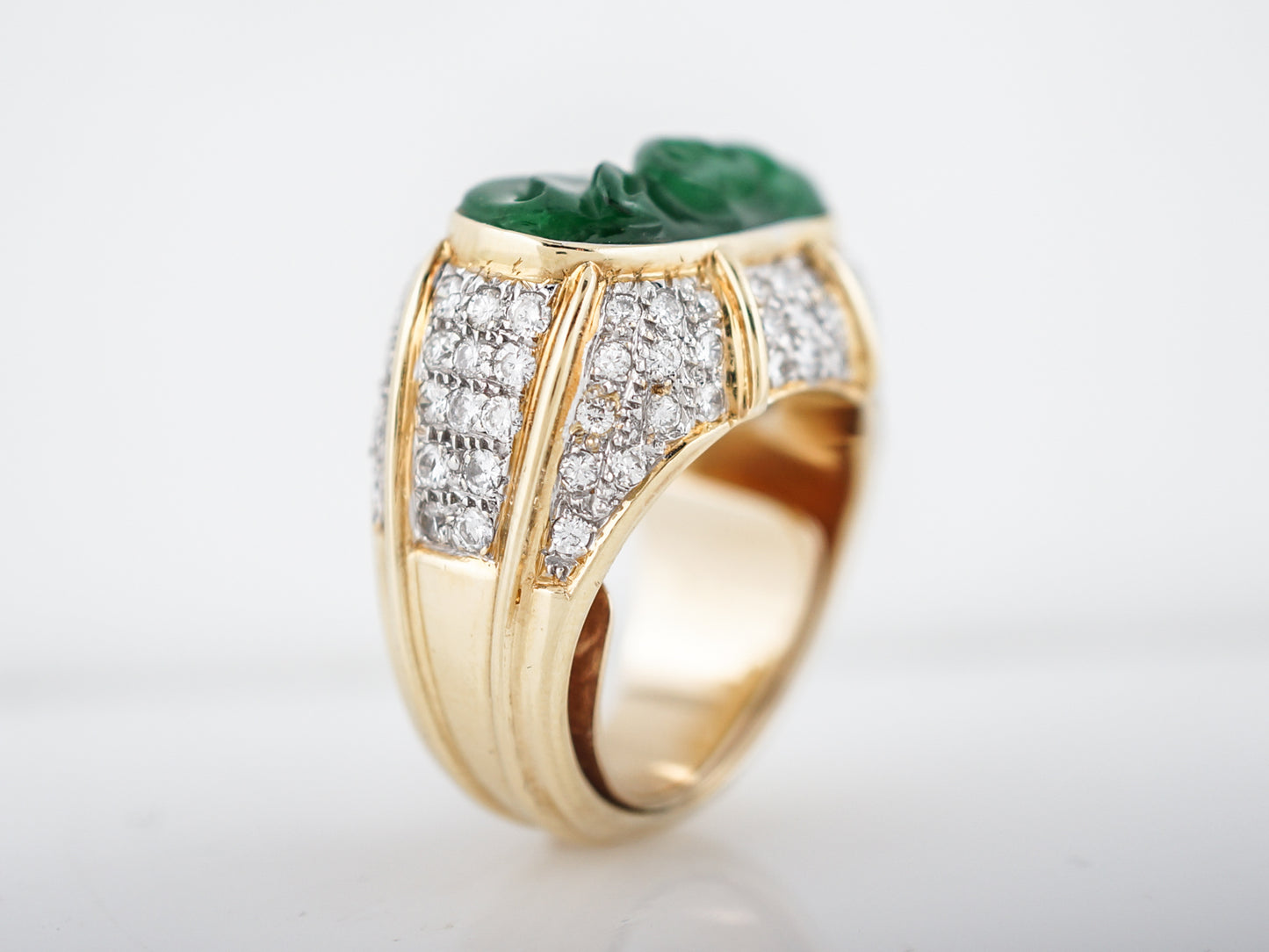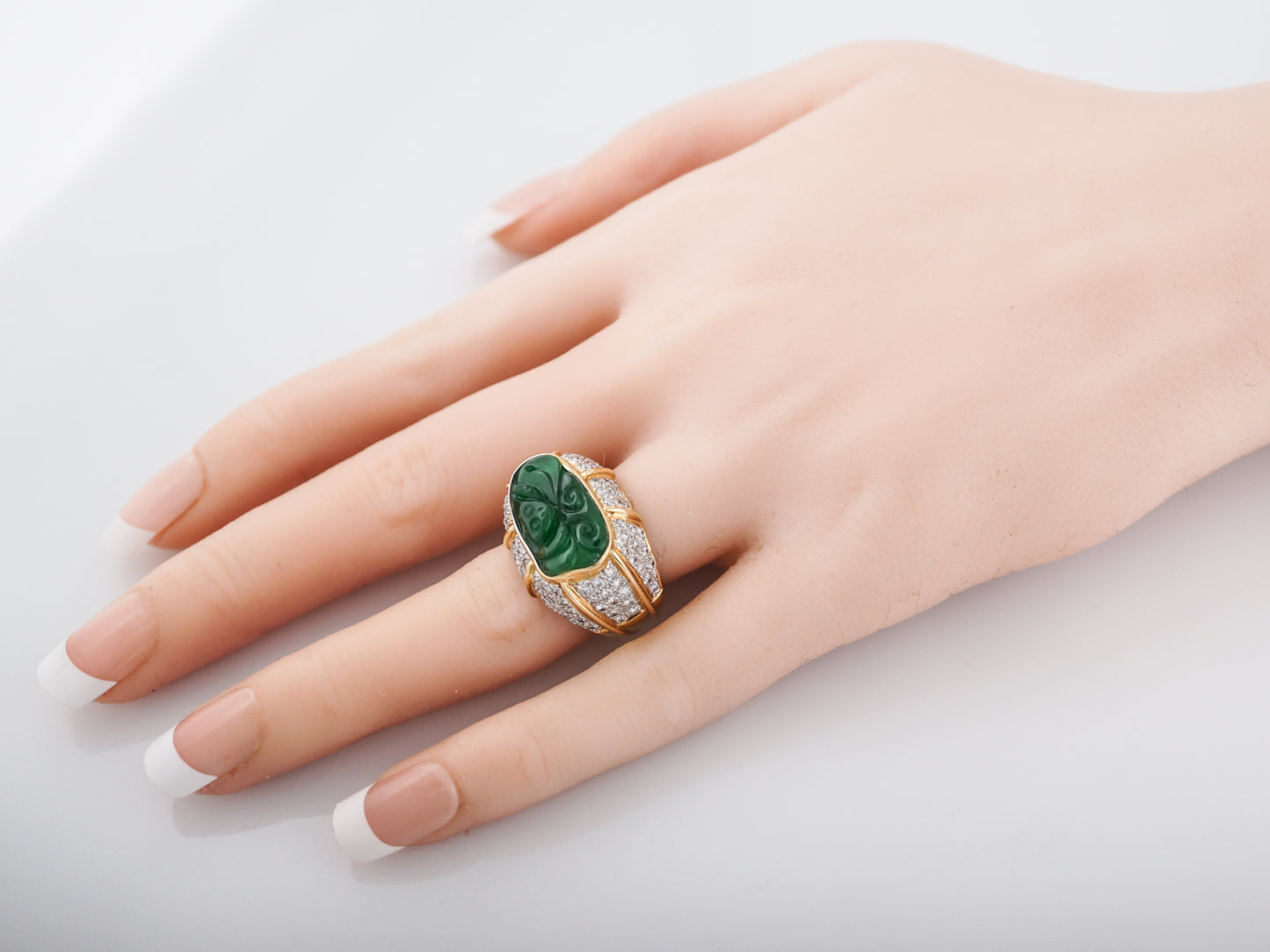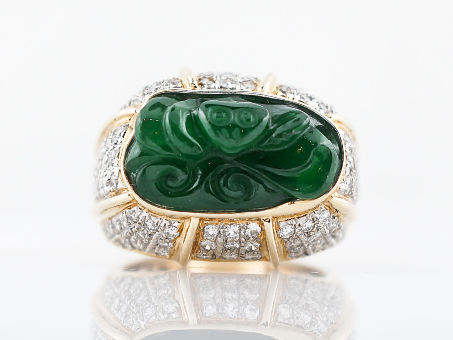 This Modern era jade and diamond ring is an extremely rare find. The GIA certified piece of jade is an exceptional specimen with its strong color and translucency. Its evident from the pierced carving that the gemstone was carved by a highly skilled craftsperson. The 14k yellow gold setting is filled with .92 carat in diamonds separated by stripes of metal. This ring is a striking piece that is sure to be noticed.