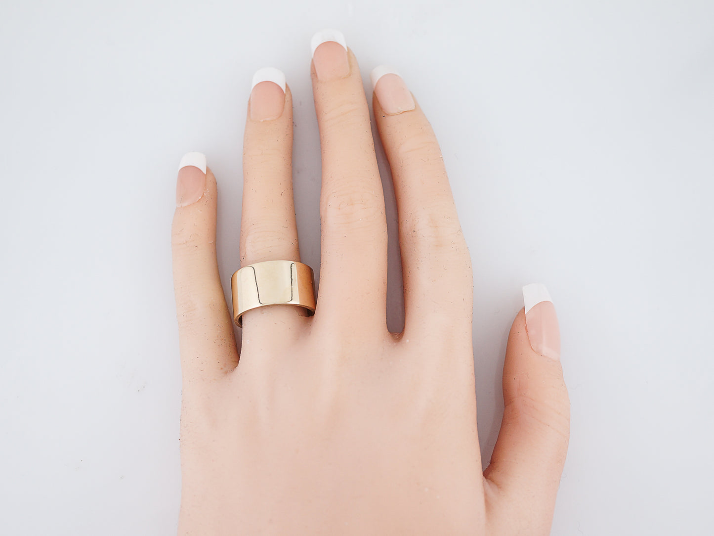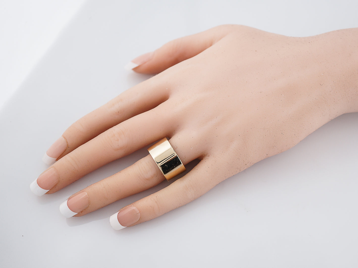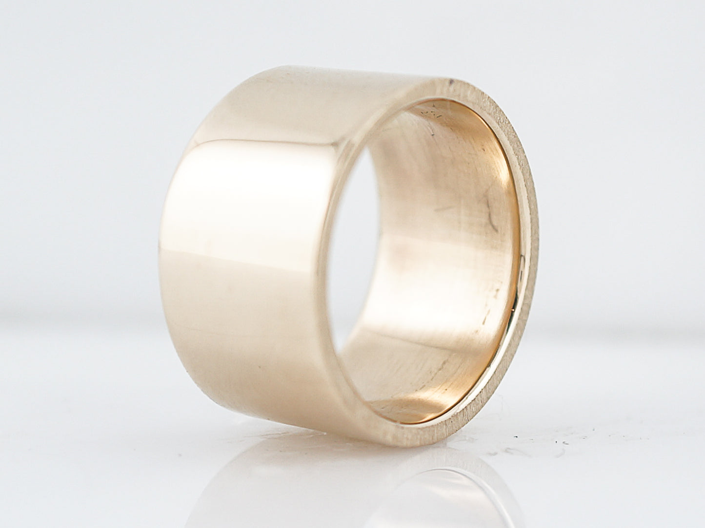 This Modern Era Cigar Style band is a sleek and stylish statement. Measuring 11mm in width and cast in 14 karat yellow gold, this high polish, flat band has a look that will stay classic forever. We imagine paring it with other stacked bands for an on trend look.