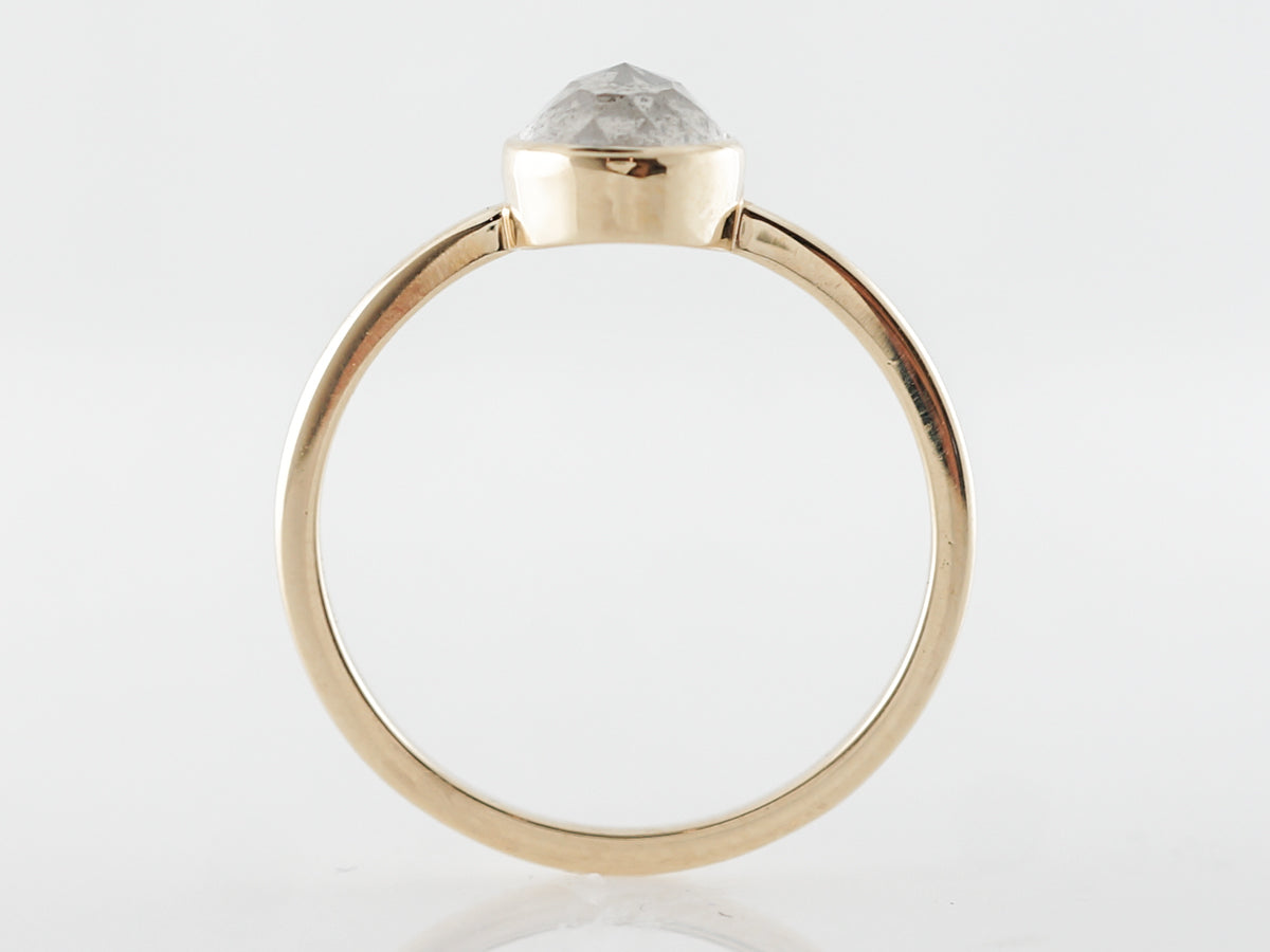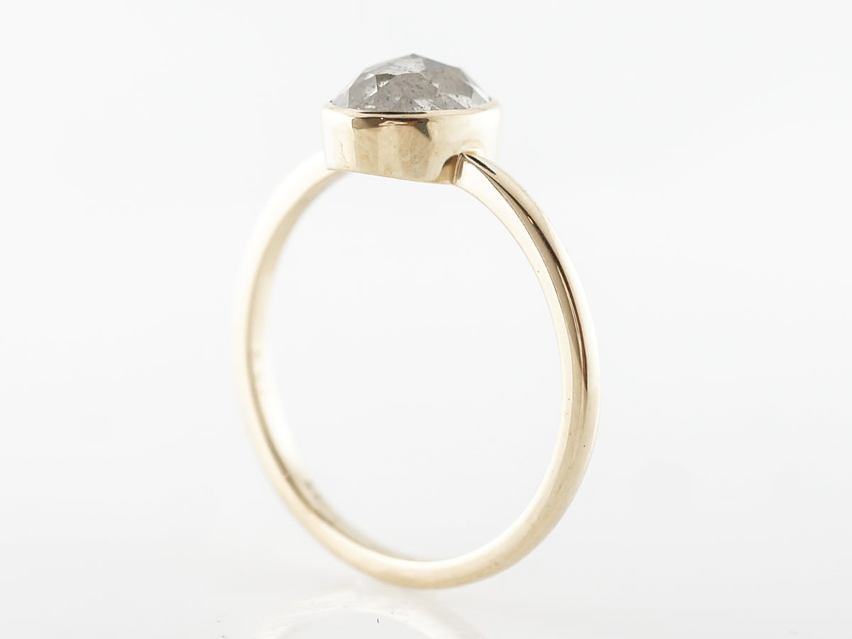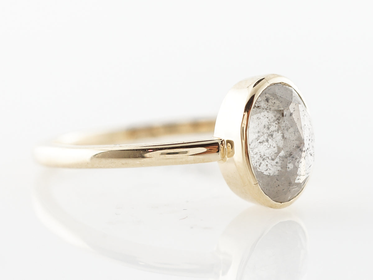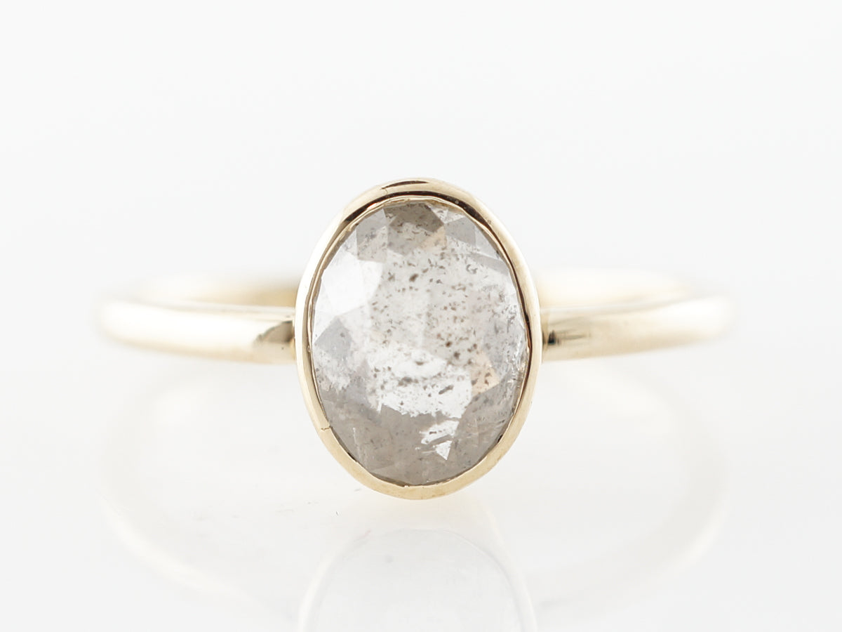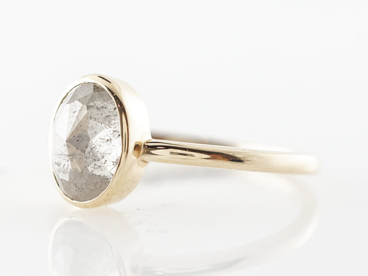 Rose Cut Grey Diamond Engagement Ring in Yellow Gold. This bezel set solitaire diamond engagement ring features a very interesting grey colored 1.65 carat Rose Cut diamond in 14 karat yellow gold. The Rose Cut with its flat underside and domed top is an interesting cut for an interesting diamond, and it being done in yellow gold allows the contrast for it to be noticed. If you make this yours youll have a very unique look!