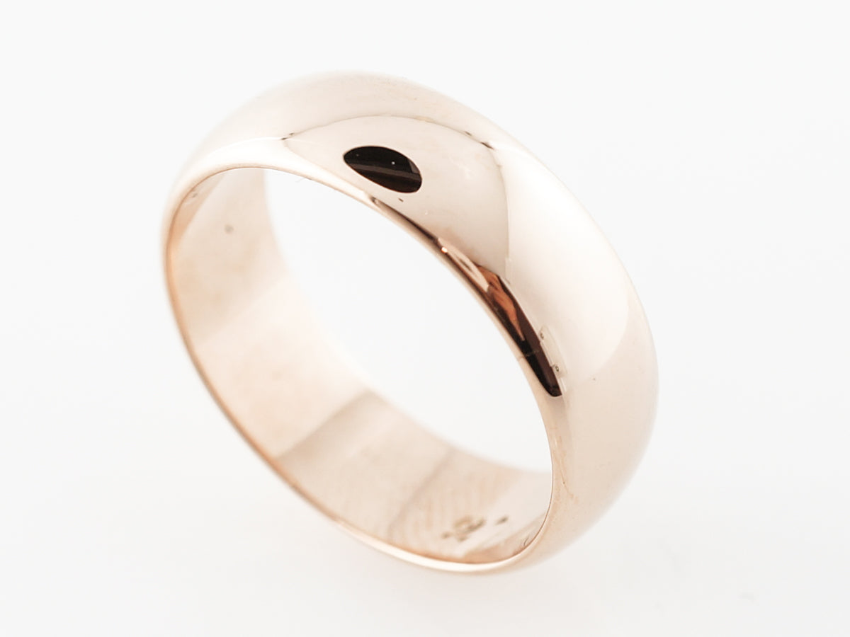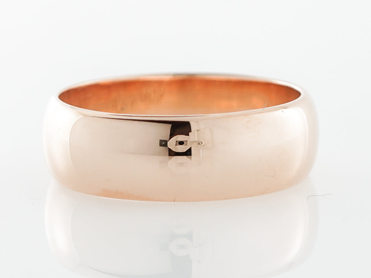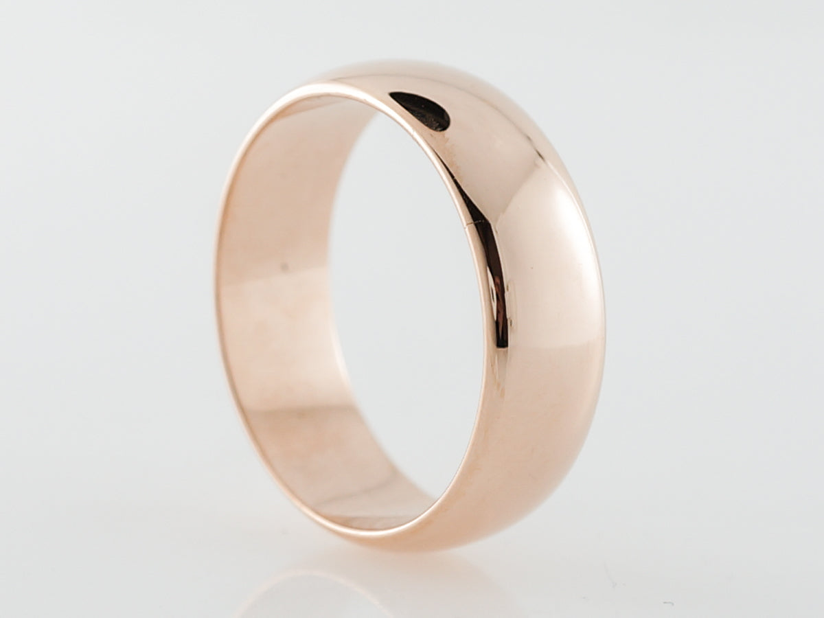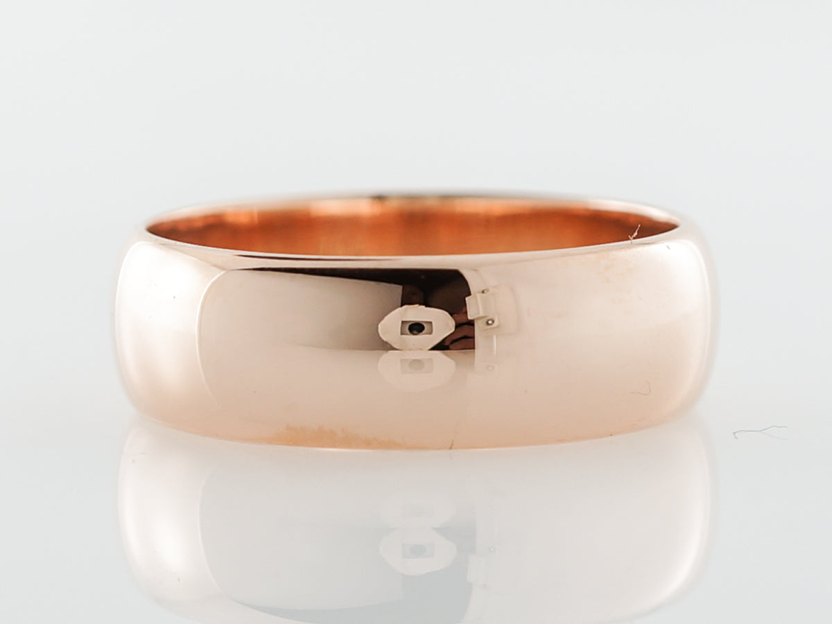 Rose Gold Comfort Fit Wedding Band 14k. This men’s wedding band is finished in 14 karat rose gold. The ring has a high polish and a classic wide look of a men’s band.