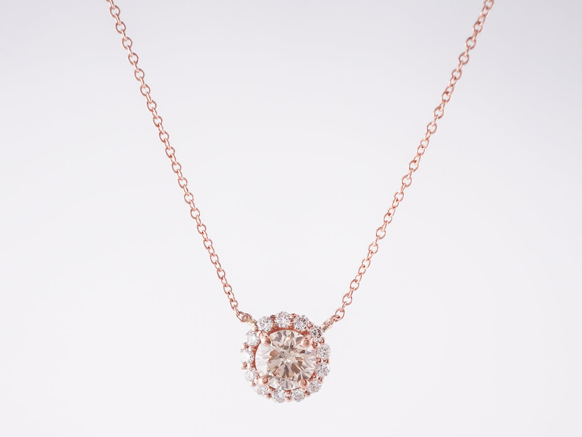 Rose Gold Necklace w/ 1.00 Carat Diamond. This halo style pendant necklace features a warm, champagne colored diamond as its focal point. The one carat round brilliant cut diamond has a halo of white diamonds framing it for added sparkle. The entire necklace is made with warm 14k rose gold that compliments the color of the center diamond. This pendant would make a distinctive signature piece.