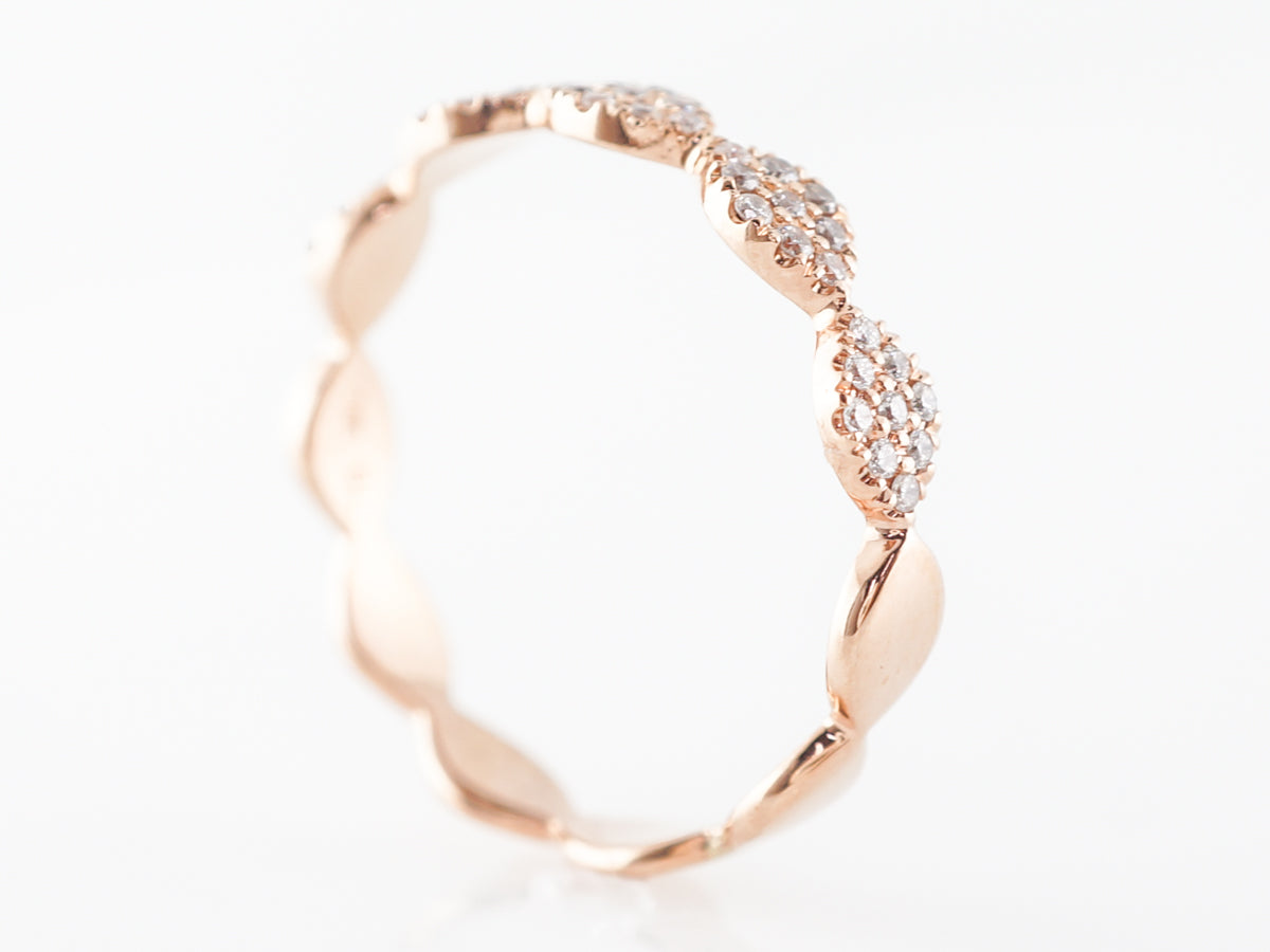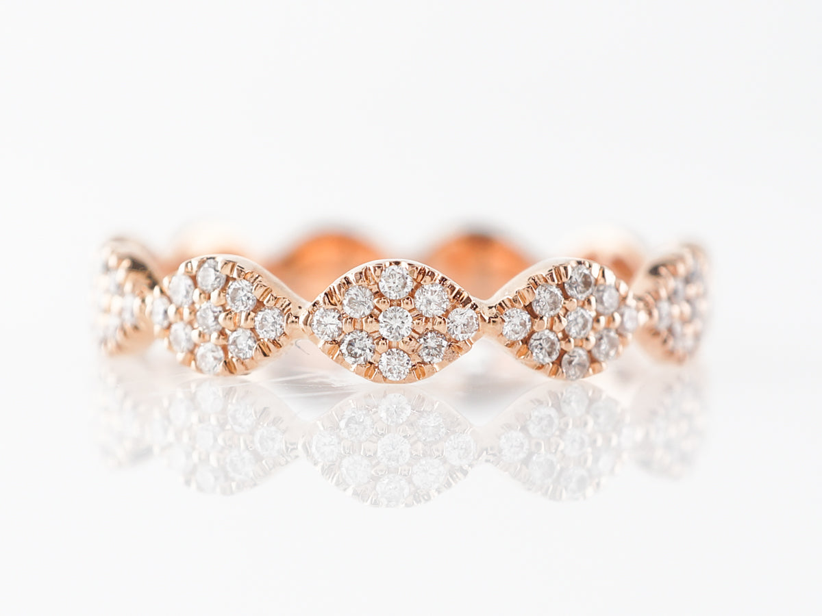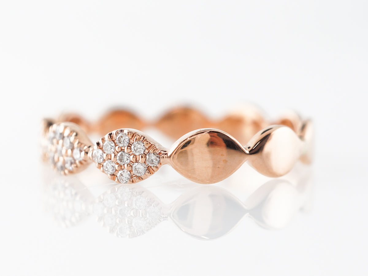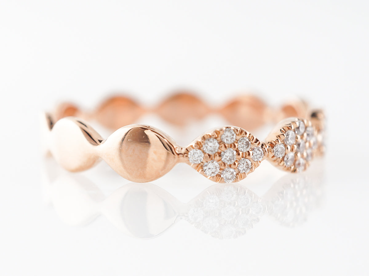 Rose Gold Pave Diamond Cluster Ring in 18k. This pave cluster ring is finished in 18 karat rose gold and features .18 carats of small diamonds. The ring is sectioned into repeating circles that are bordered by light milgrain detail to give them some further texture. The top half of theses sections contain clusters of nine (9) small diamonds that contrast beautifully with the warm rose gold. This would make a perfect ring for stacking!
