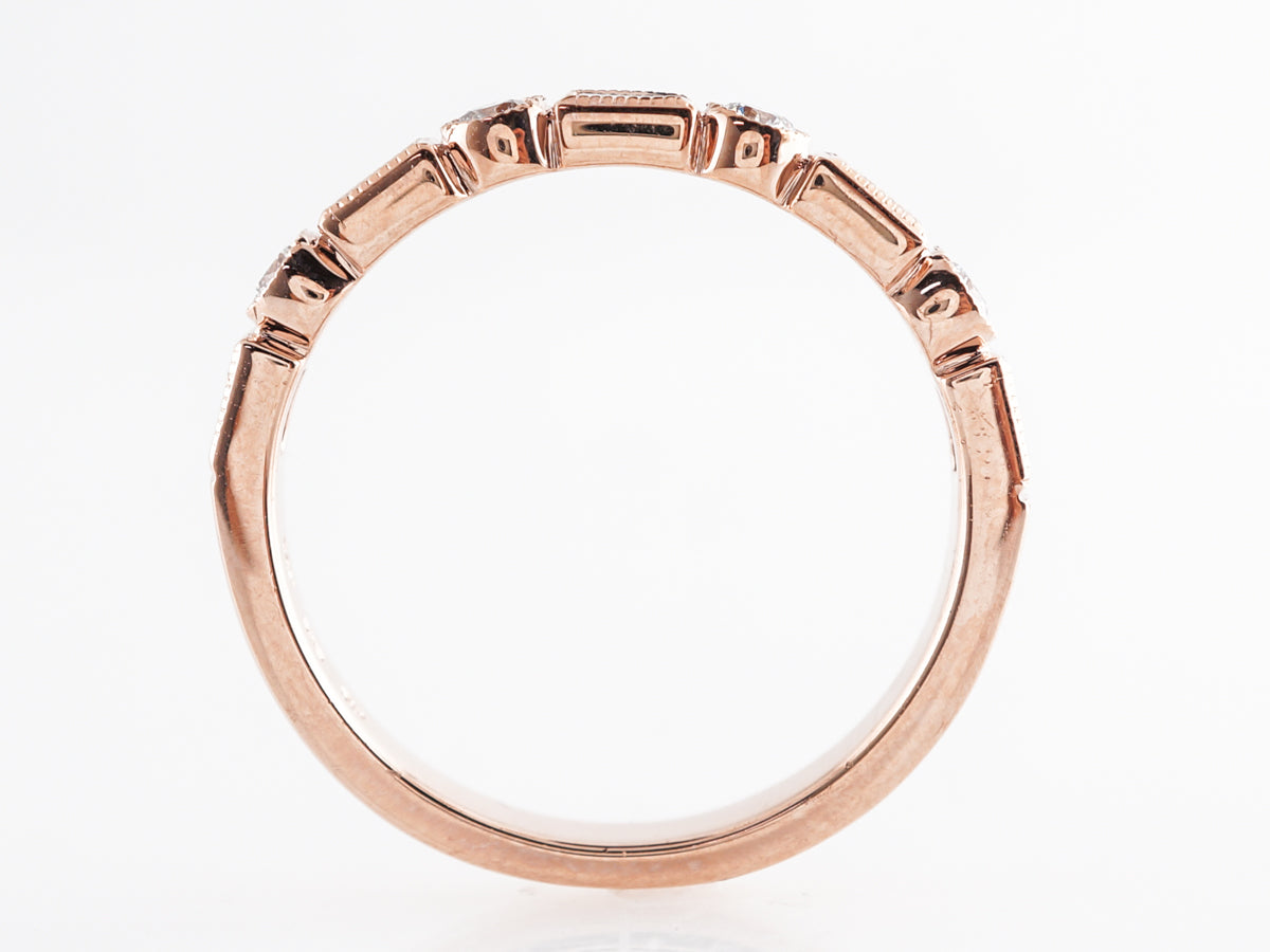 Round Baguette Diamond Wedding Band in Rose Gold. This 14 karat rose gold ring features .30 carats of round and baguette cut diamonds across the top half of the band. Each diamond is bezel set with milgrain detail to bring out just a little more sparkle. This ring would look great in a stack on the right hand.