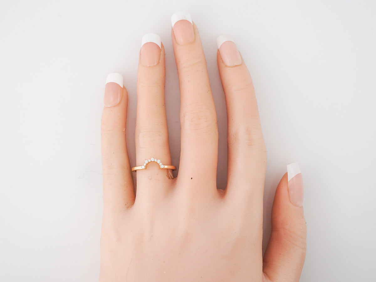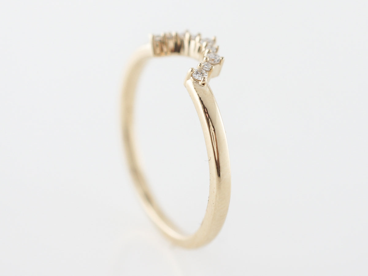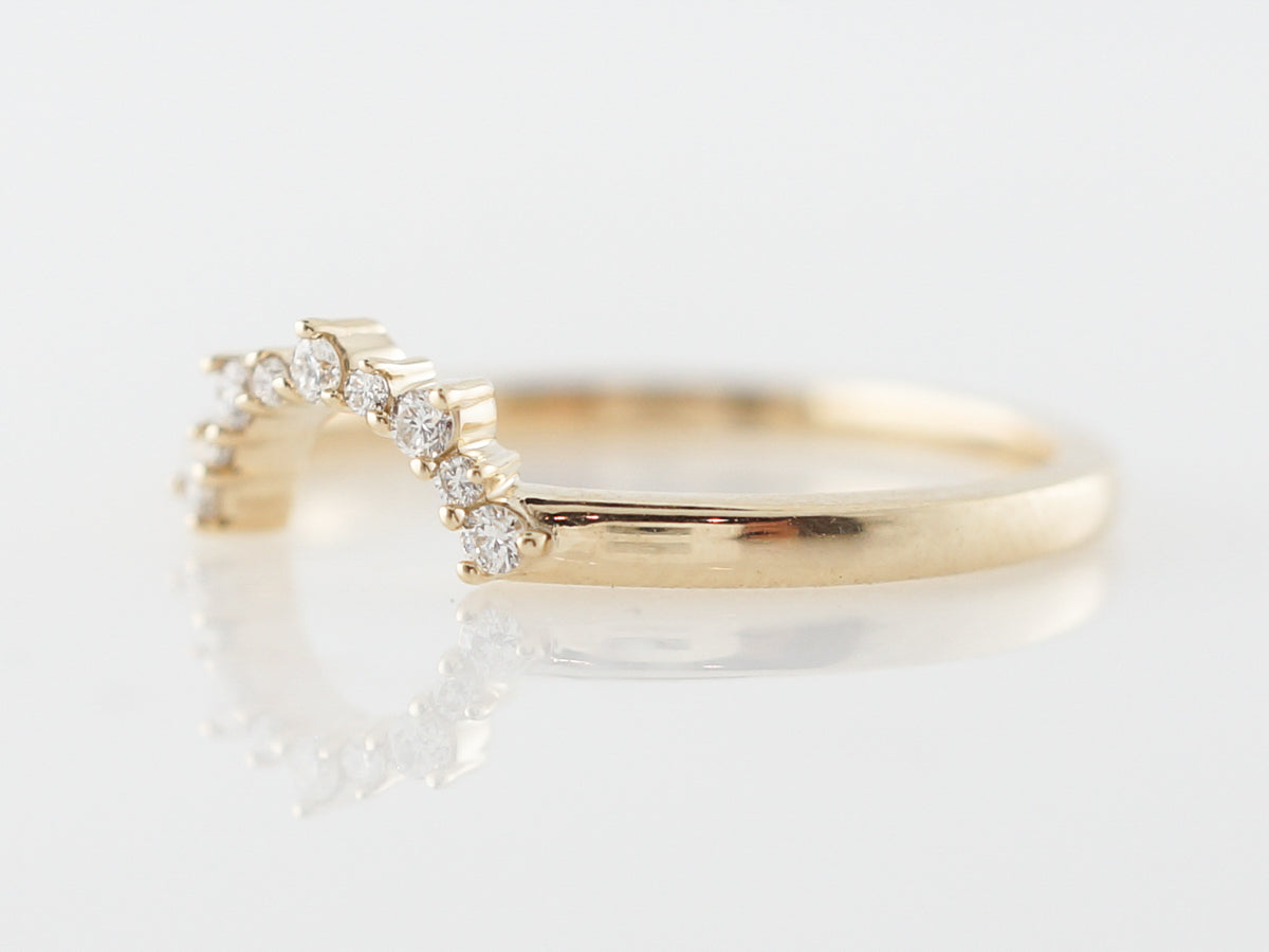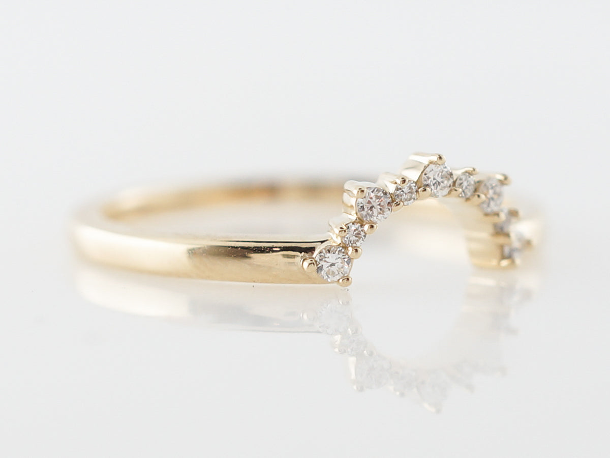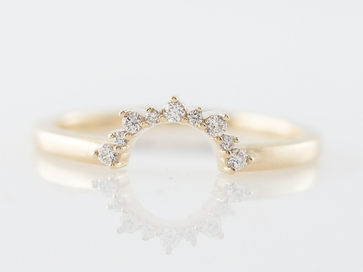 This curved diamond wedding band features .10 carats of round brilliant cut diamonds. The diamonds are set across the face and have brilliant life and sparkle from every angle. The band is finished in 14k yellow gold and is curved so that it can snuggle perfectly next to an engagement ring.
