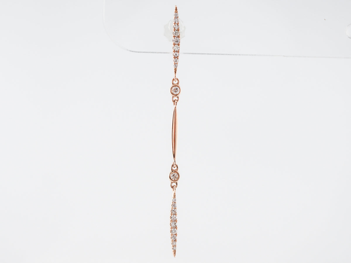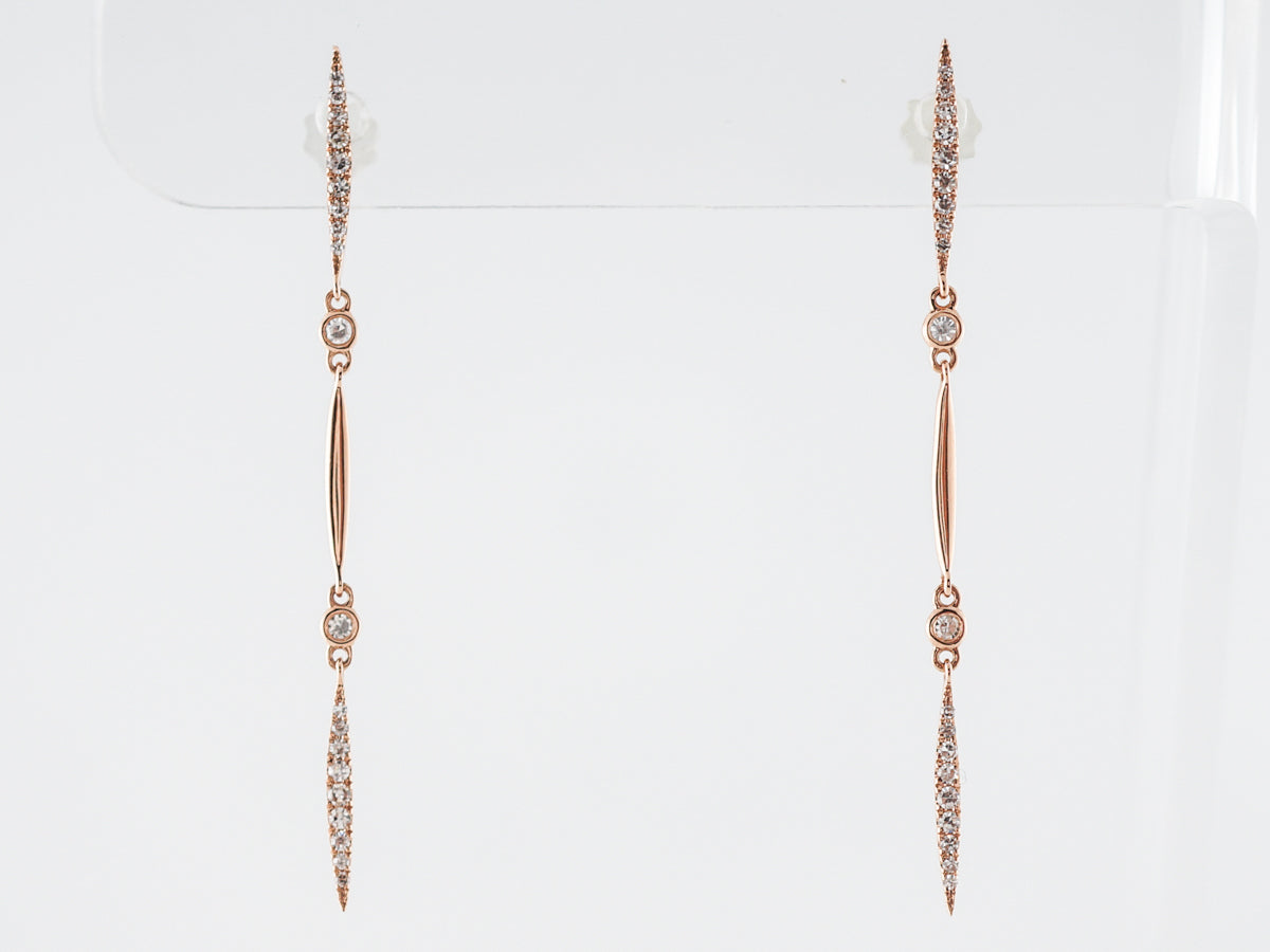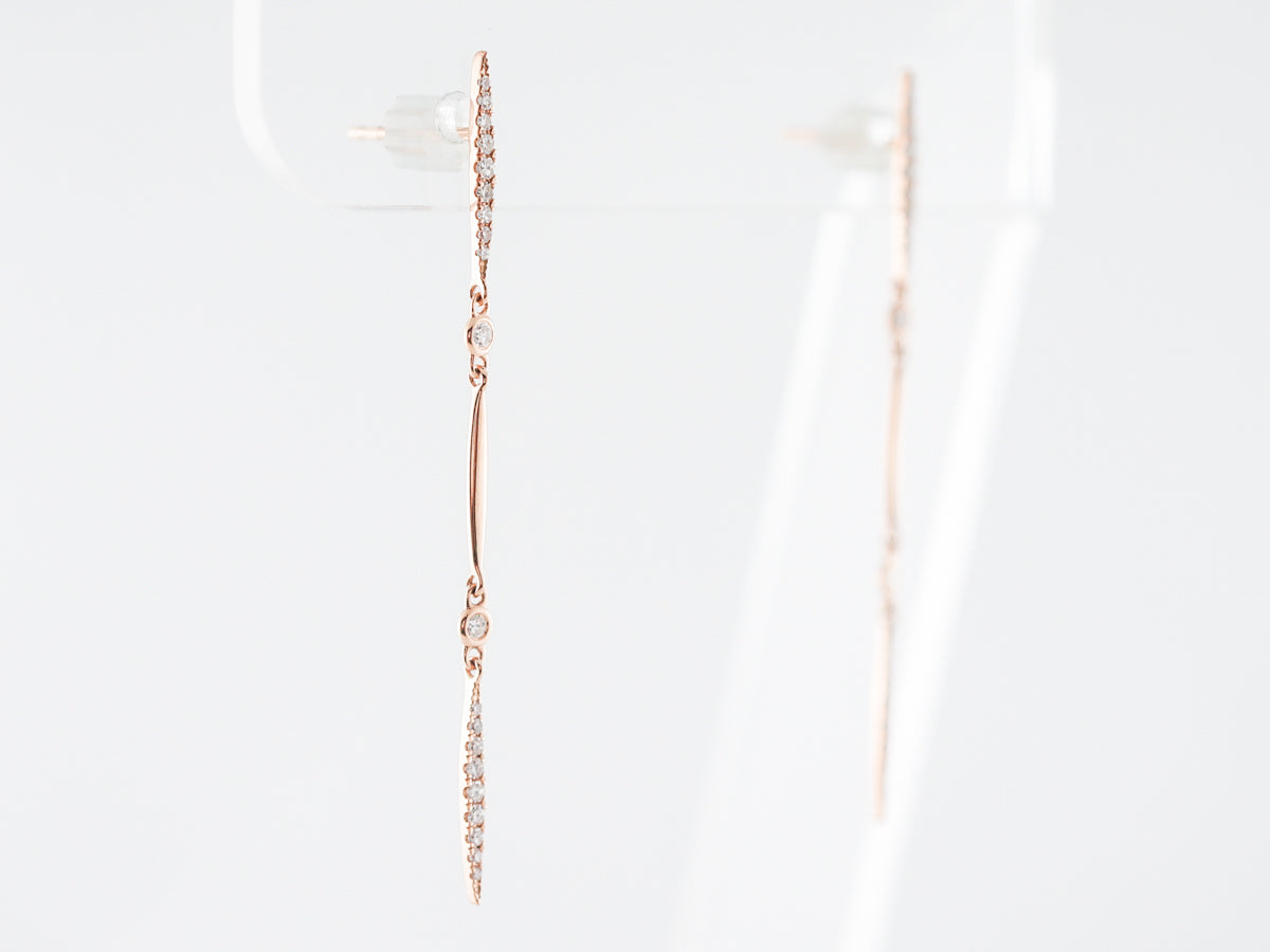 These modern diamond dangle earrings are perfect for everyday wear. Thin and lightweight, the 18k rose gold earrings are lined with round brilliant cut diamonds from top to bottom. Each earring dangles nicely off the ear and has great movement and sparkle!