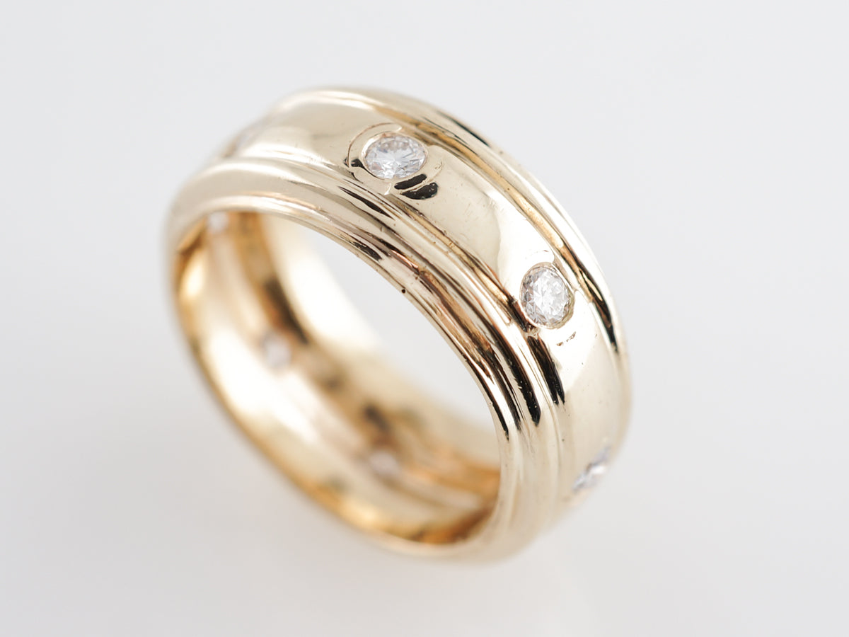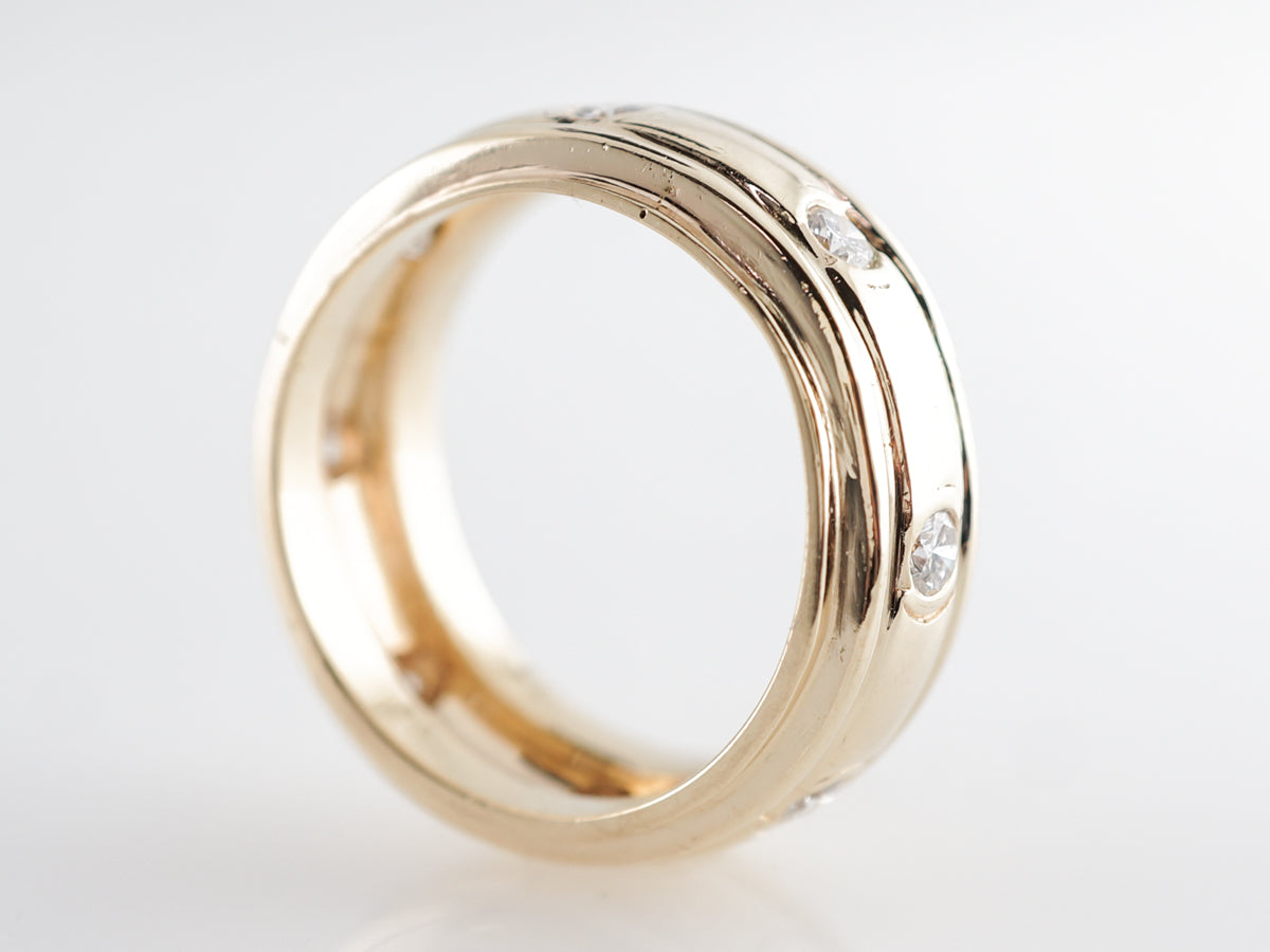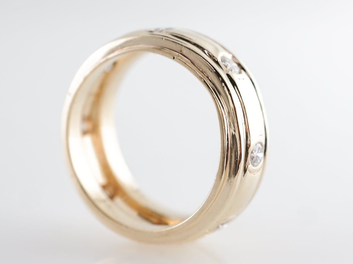 Round Brilliant Diamond Eternity Band in 18k Yellow Gold. This large modern wedding band features .40 carats of round brilliant cut diamonds set in a wide 18 karat yellow gold mounting. The highly polished yellow gold has light engravings bordering the central diamond section. The diamonds are spaced apart in a repeating pattern that gives the ring nice order.