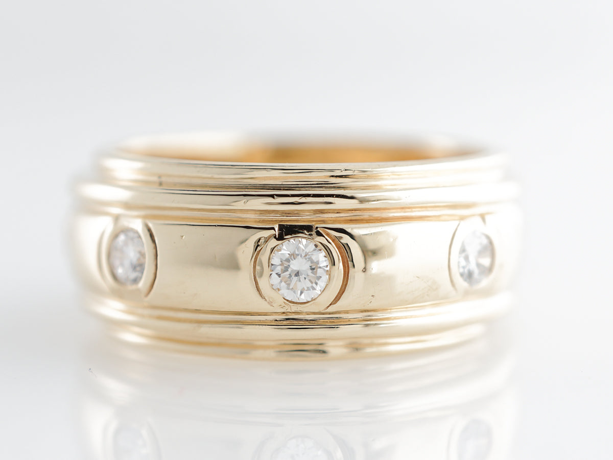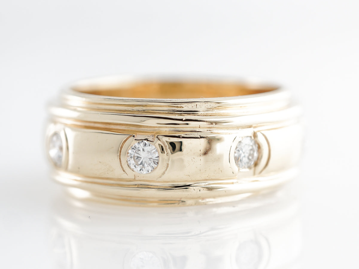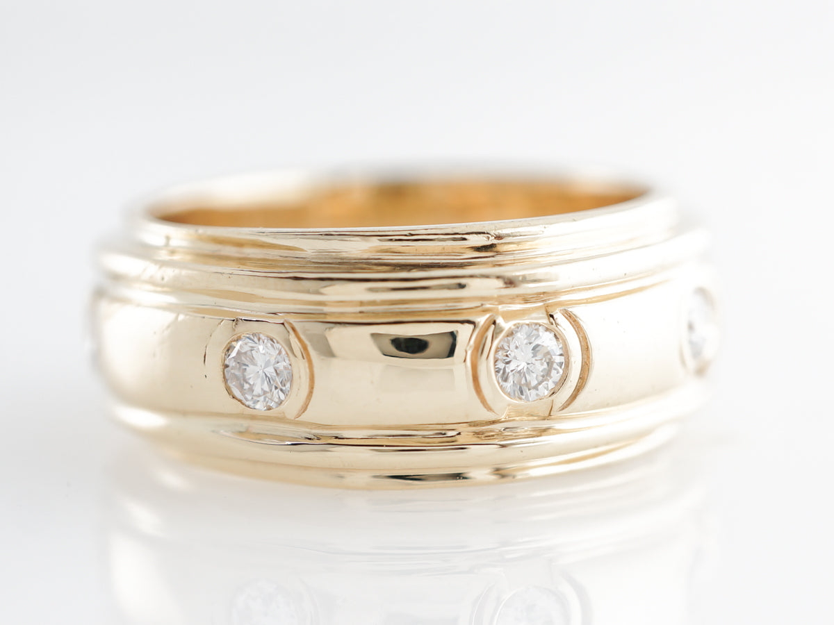 Round Brilliant Diamond Eternity Band in 18k Yellow Gold. This large modern wedding band features .40 carats of round brilliant cut diamonds set in a wide 18 karat yellow gold mounting. The highly polished yellow gold has light engravings bordering the central diamond section. The diamonds are spaced apart in a repeating pattern that gives the ring nice order.