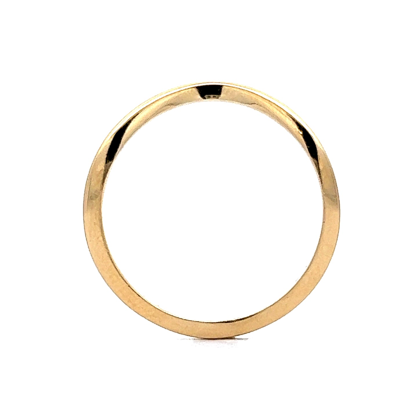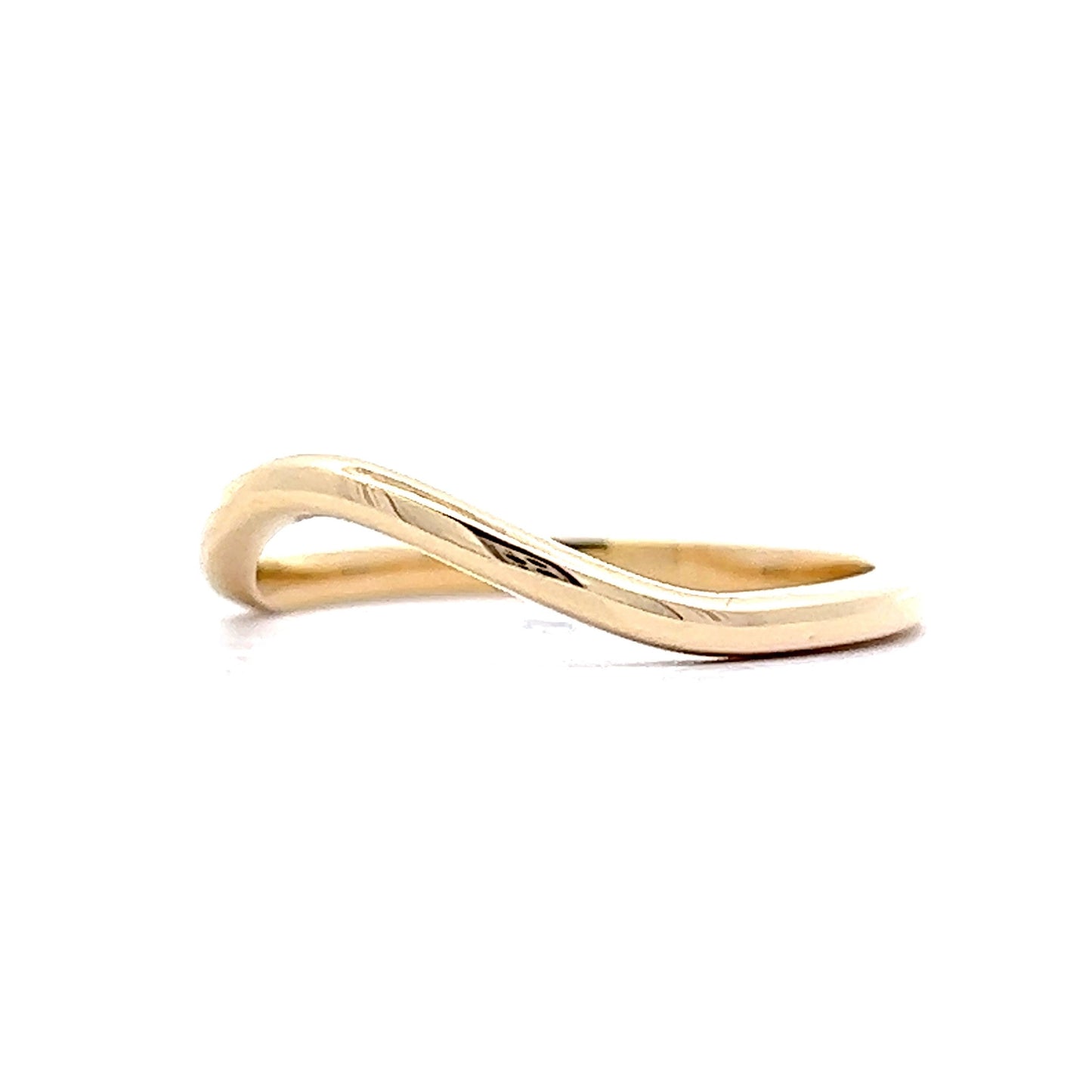 This effortlessly chic and stackable wedding band features a soft curve in 14 karat yellow gold. The notch in the band leaves room for the stone in an engagement ring. Measuring 3.54mm wide, this modern and minimal wedding band pairs well with most yellow gold engagement rings and can easily be worn on the end of right hand stack of rings. A classic and inspiring design By Filigree! Shop More Curved Wedding Bands.
