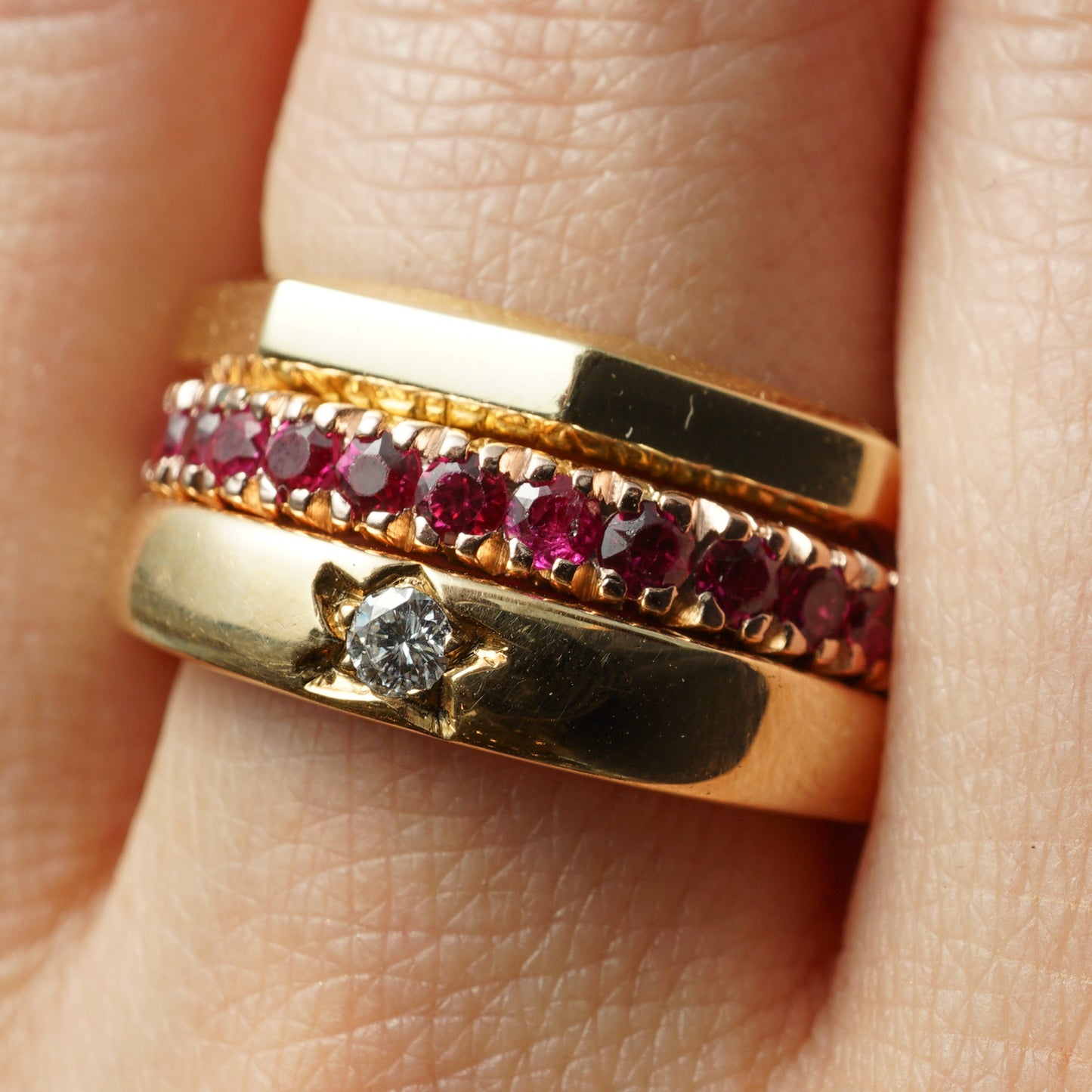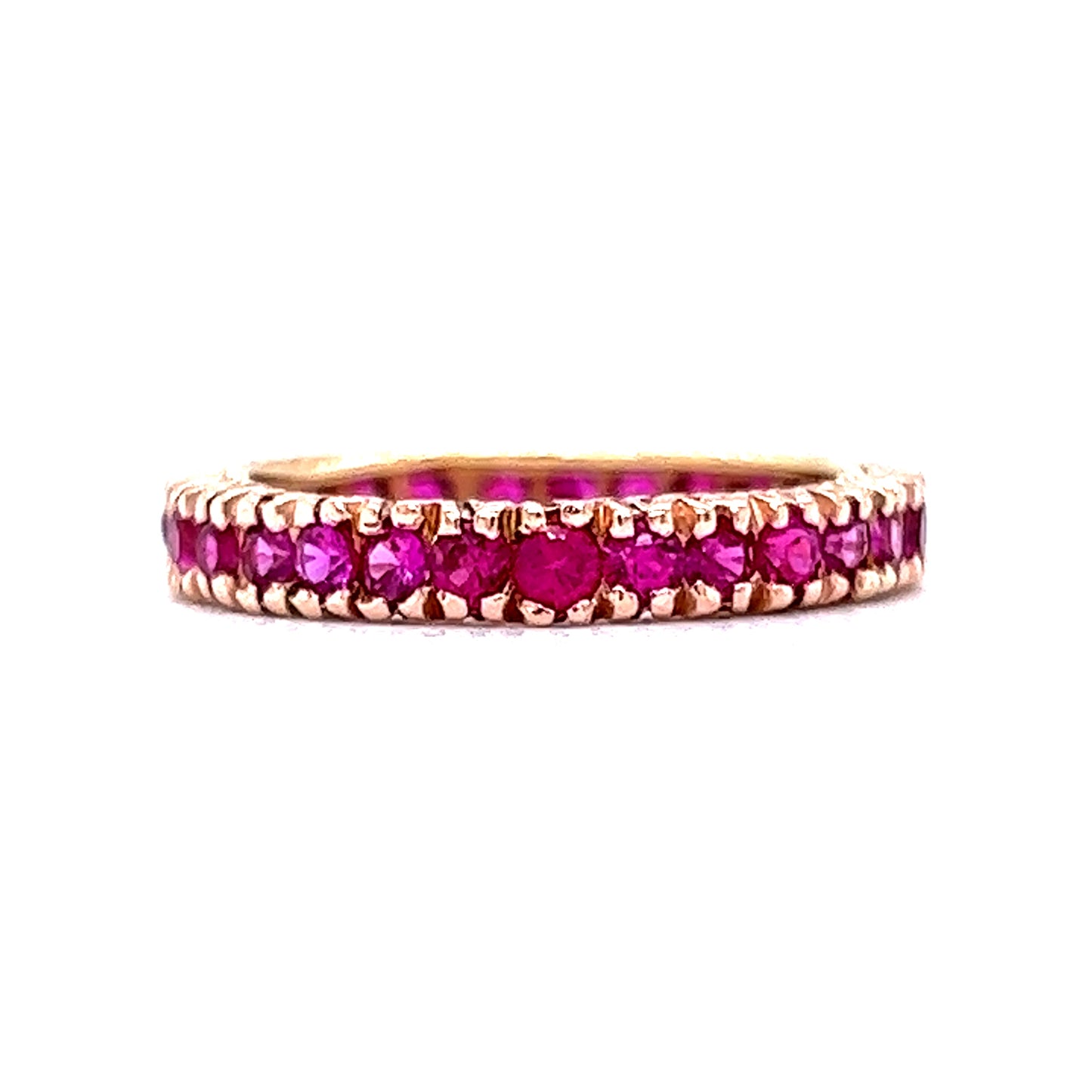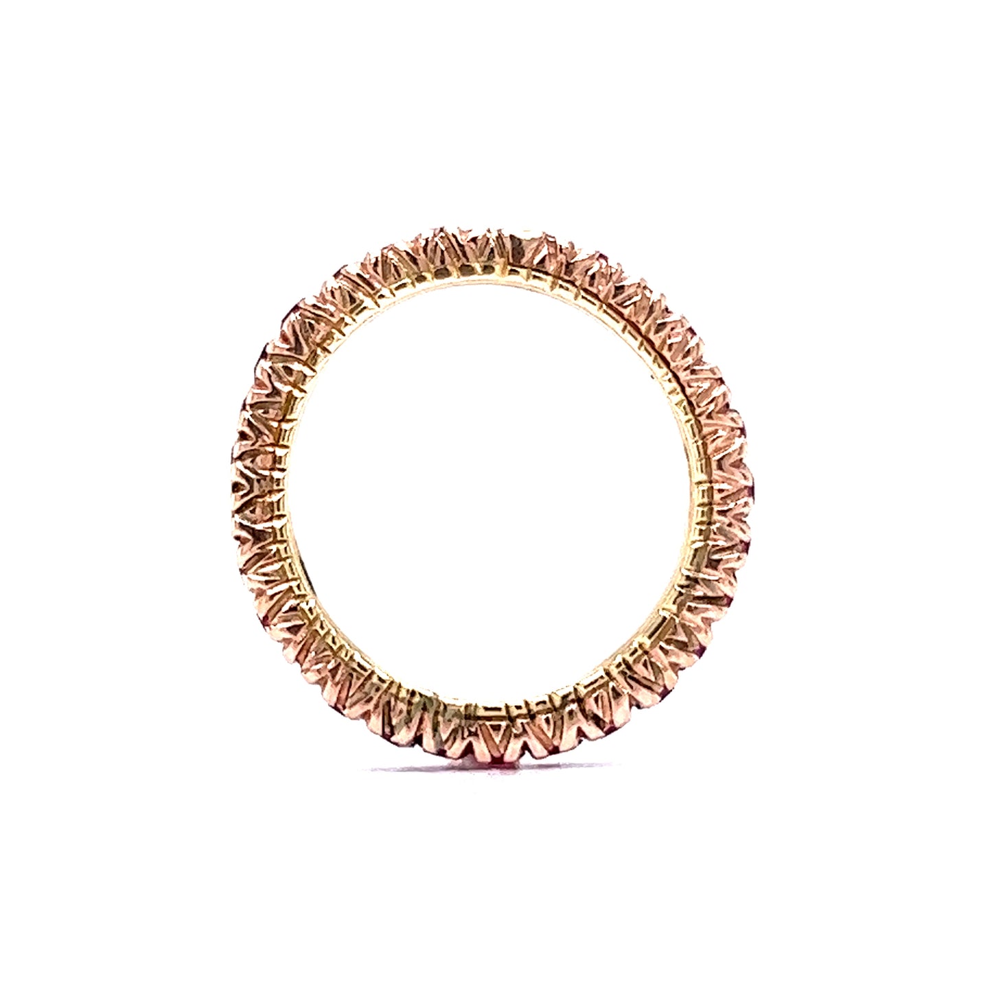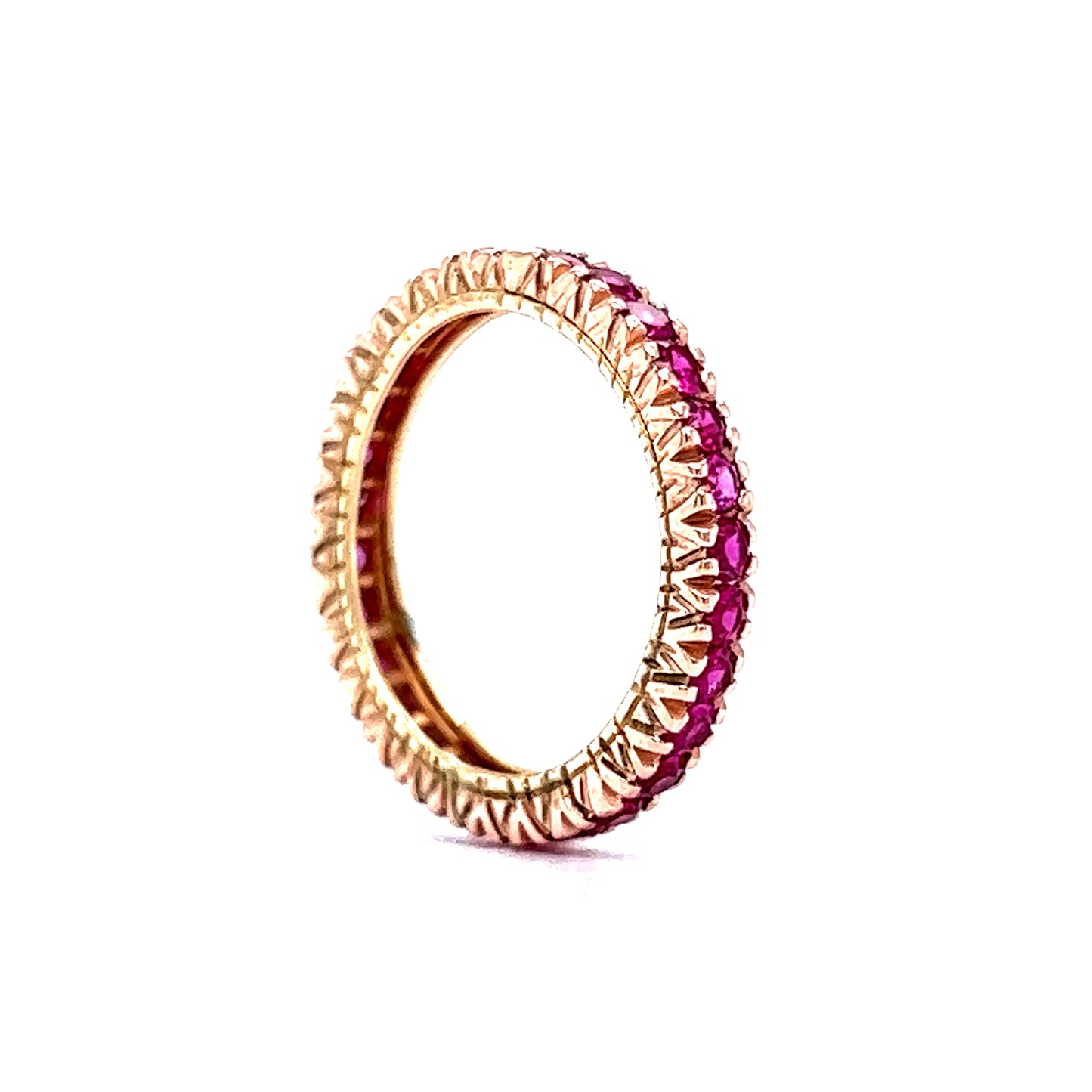 For a special, one of a kind gemstone wedding ring, this modern eternity band features 2.10 carats of round cut rubies in 14 karat yellow gold. Thirty (30) .07 carat rubies with a red-magenta hue are set in shared V prongs around the entire ring. Elegant and practical, this stackable band will bring a depth of color and shine to an engagement ring or can be worn in a right hand stack.