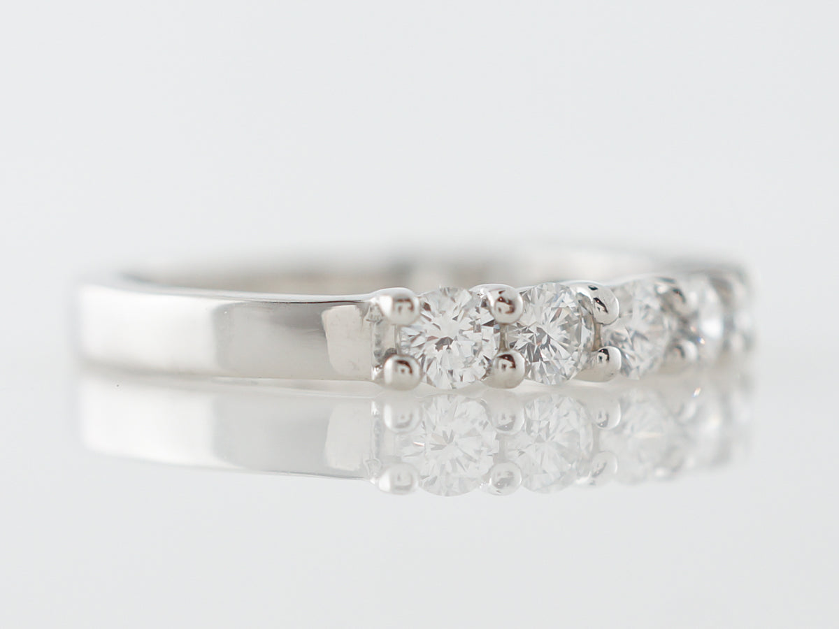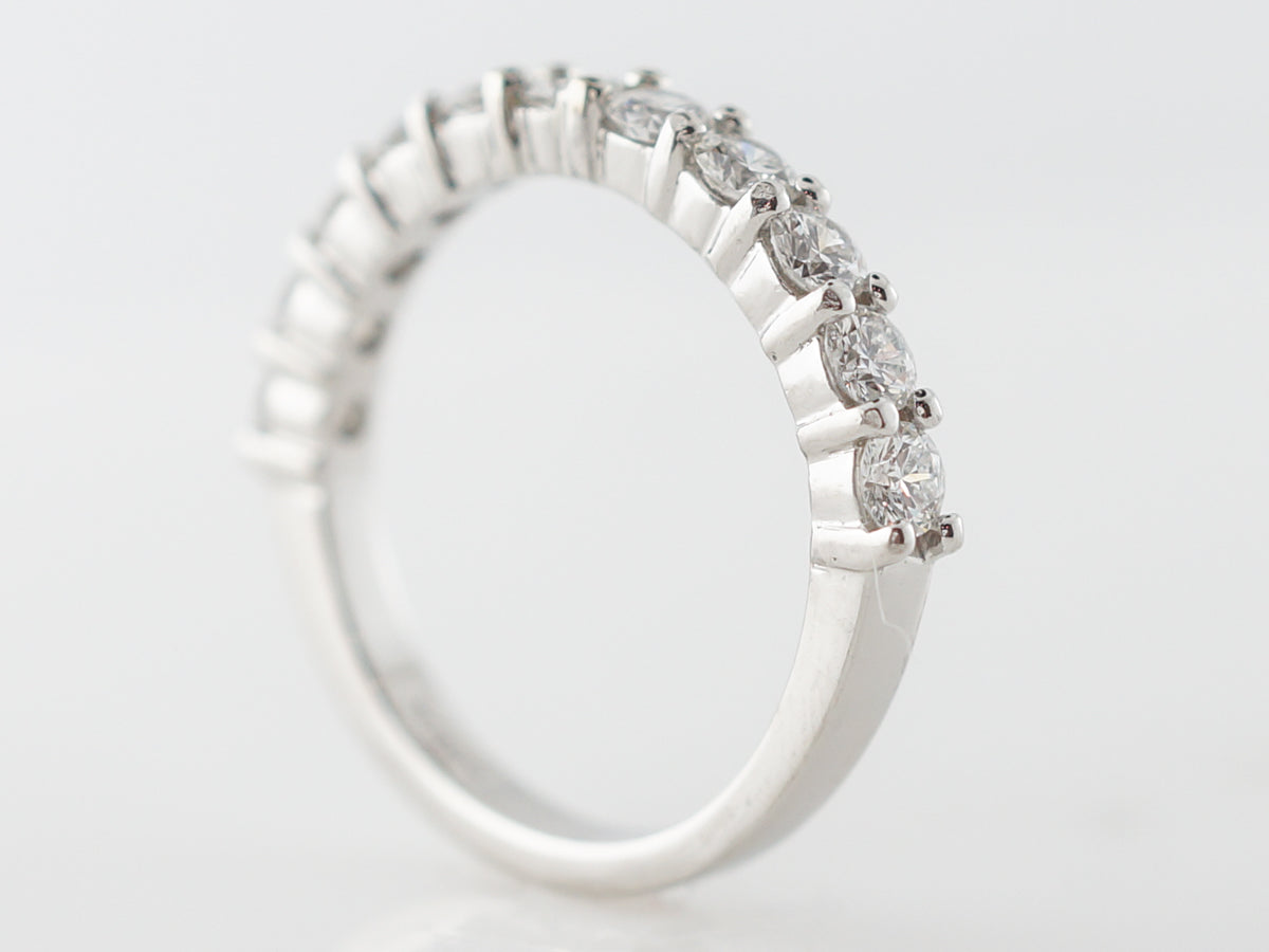 Round Diamond Wedding Band 1.21 Carat in Platinum. This Modern platinum and diamond wedding band features eleven (11) round brilliant diamonds in a shared prong setting. The round brilliant diamonds are set across the bridge of the finger and are fairly low in the platinum setting. Perfect match for a Modern engagement ring or as a right hand stackable band.