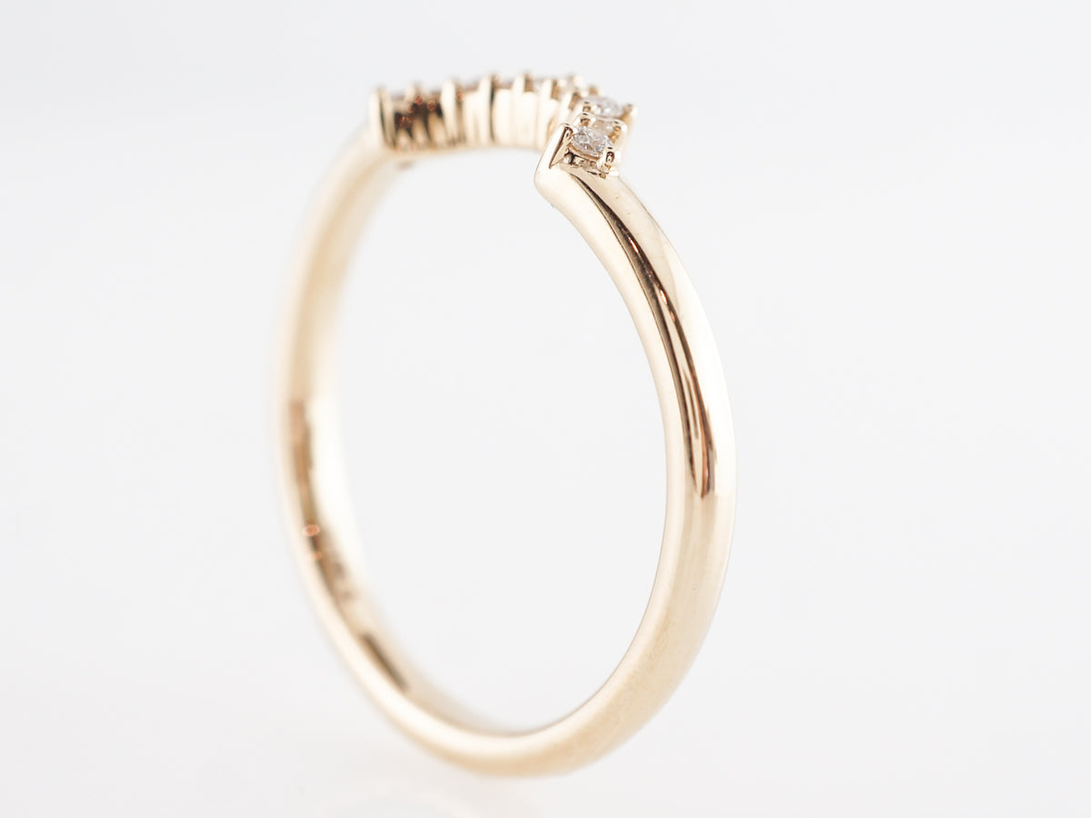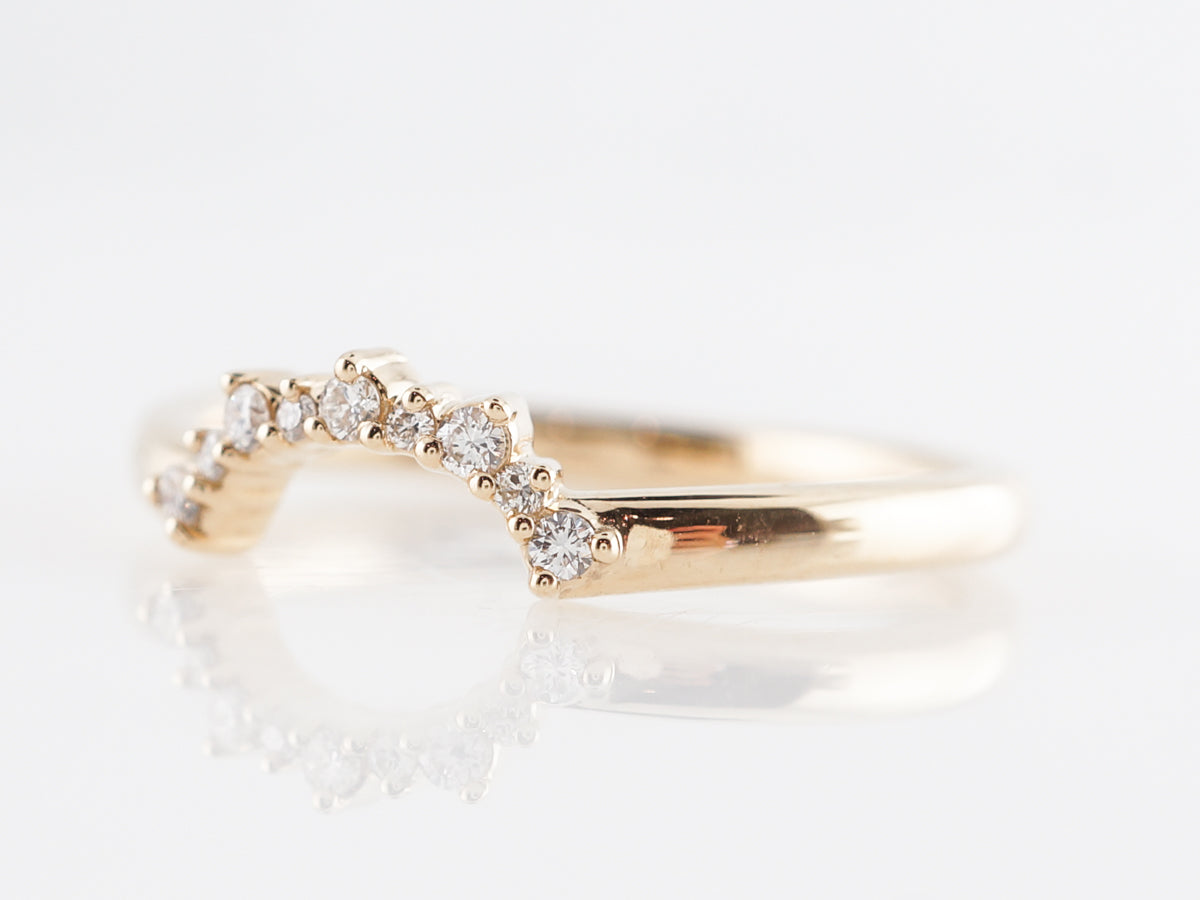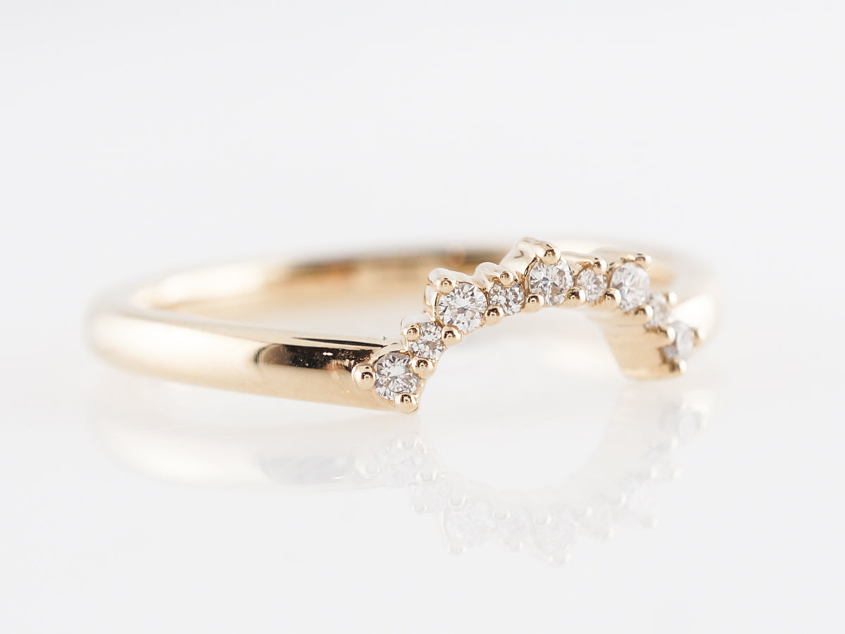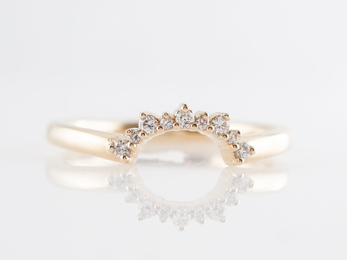Rounded Wedding Band w/ Diamonds in 14k Yellow Gold. This rounded diamond wedding band features .07 carats of round brilliant cut diamonds. The diamonds are set across the face and have brilliant life and sparkle from every angle. The band is finished in 14k yellow gold and is curved so that it can snuggle perfectly next to an engagement ring.