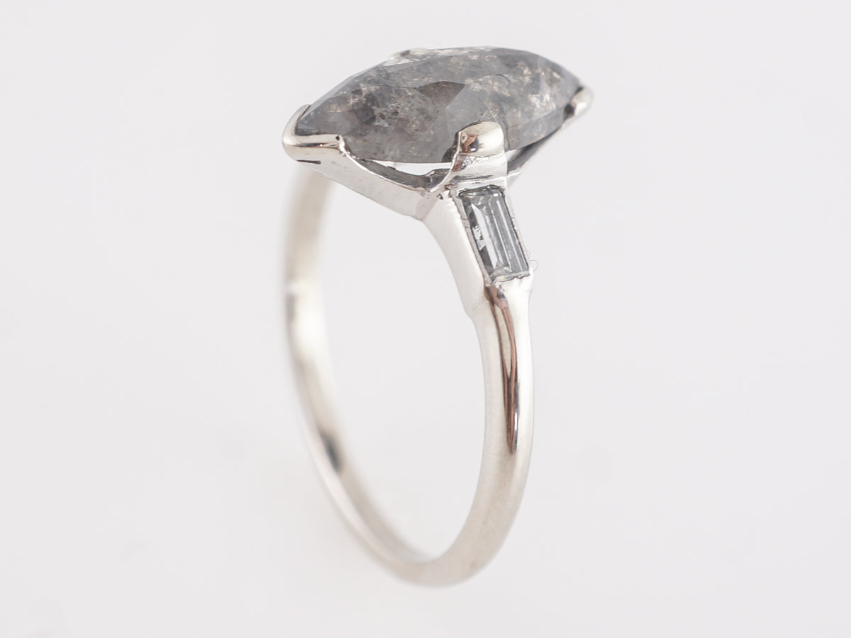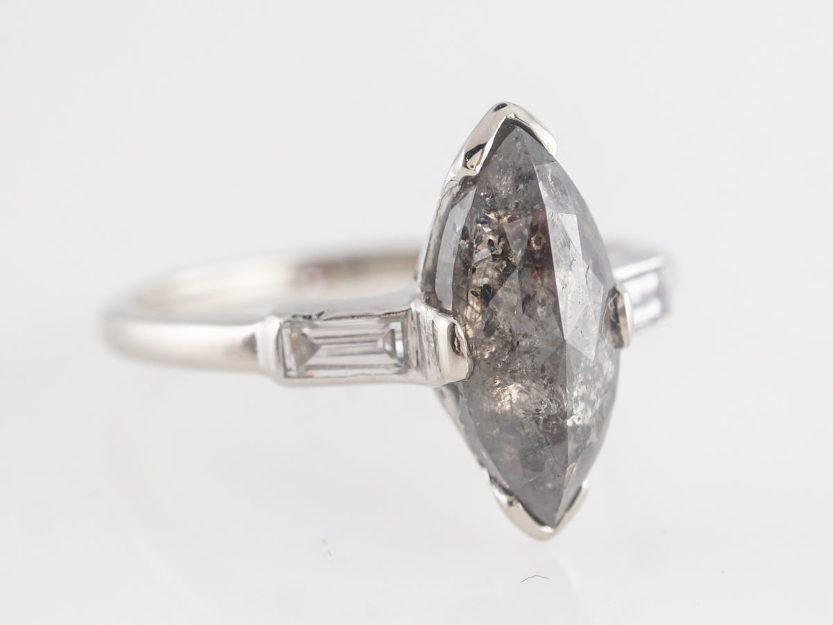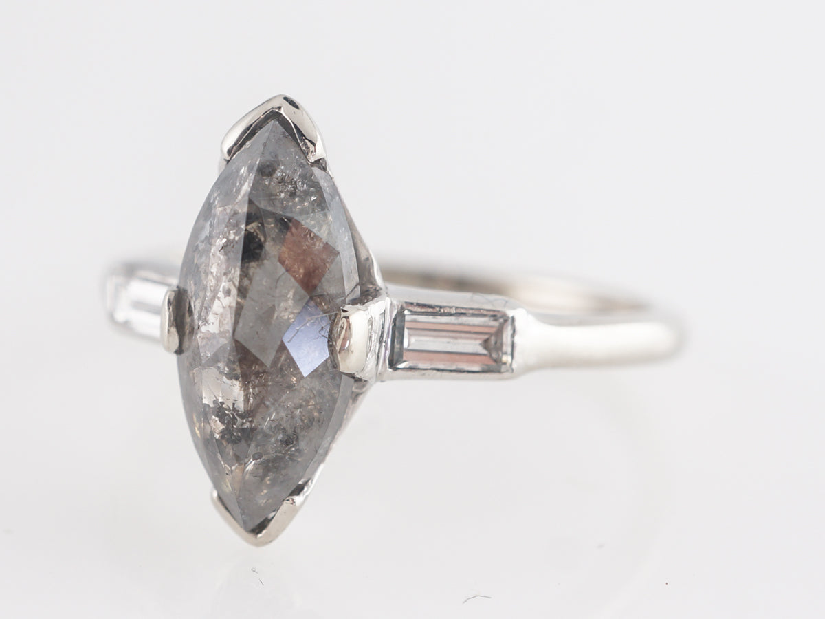 Rustic Marquise Diamond Engagement Ring in Platinum. This fascinating and very unique modern engagement ring features a 1.92 carat rustic colored marquise cut diamond set in platinum. The marquise is rather wide, and presents a very large diamond look for its weight. The rust diamond offers a maze of beautiful grey gradients that contrast well with the white baguette accents on the shoulders. This is a fabulous option for someone in search of a unique, large diamond, at a very attractive price point!