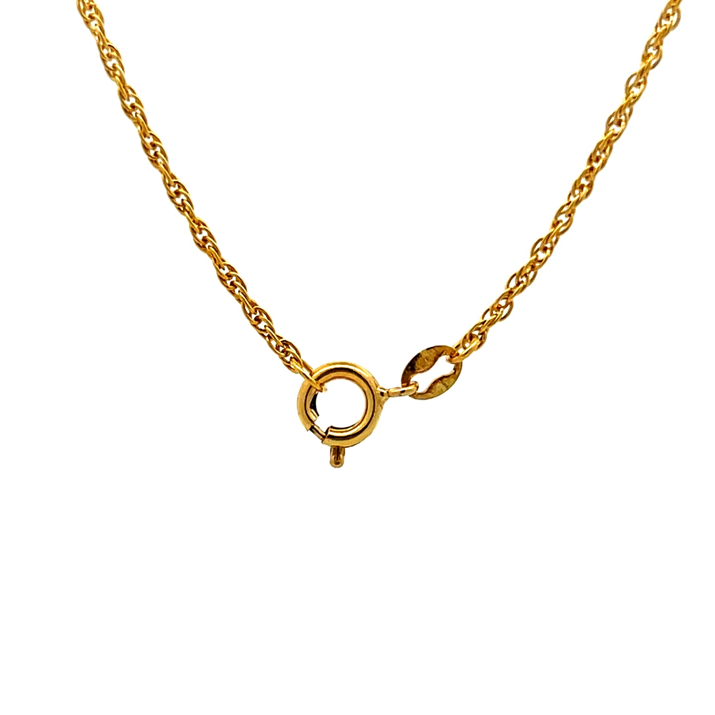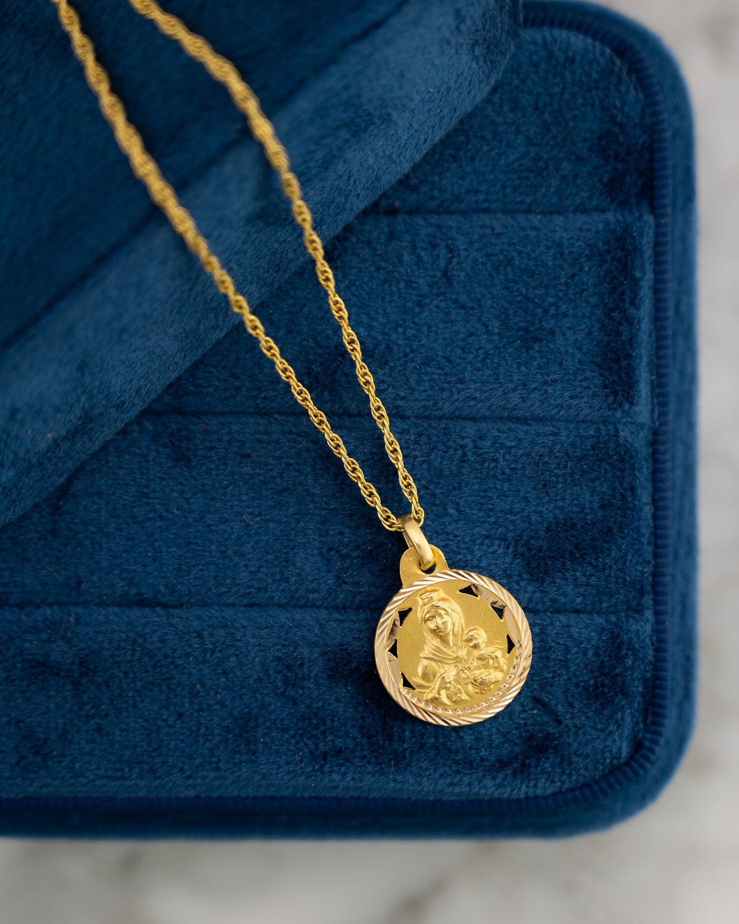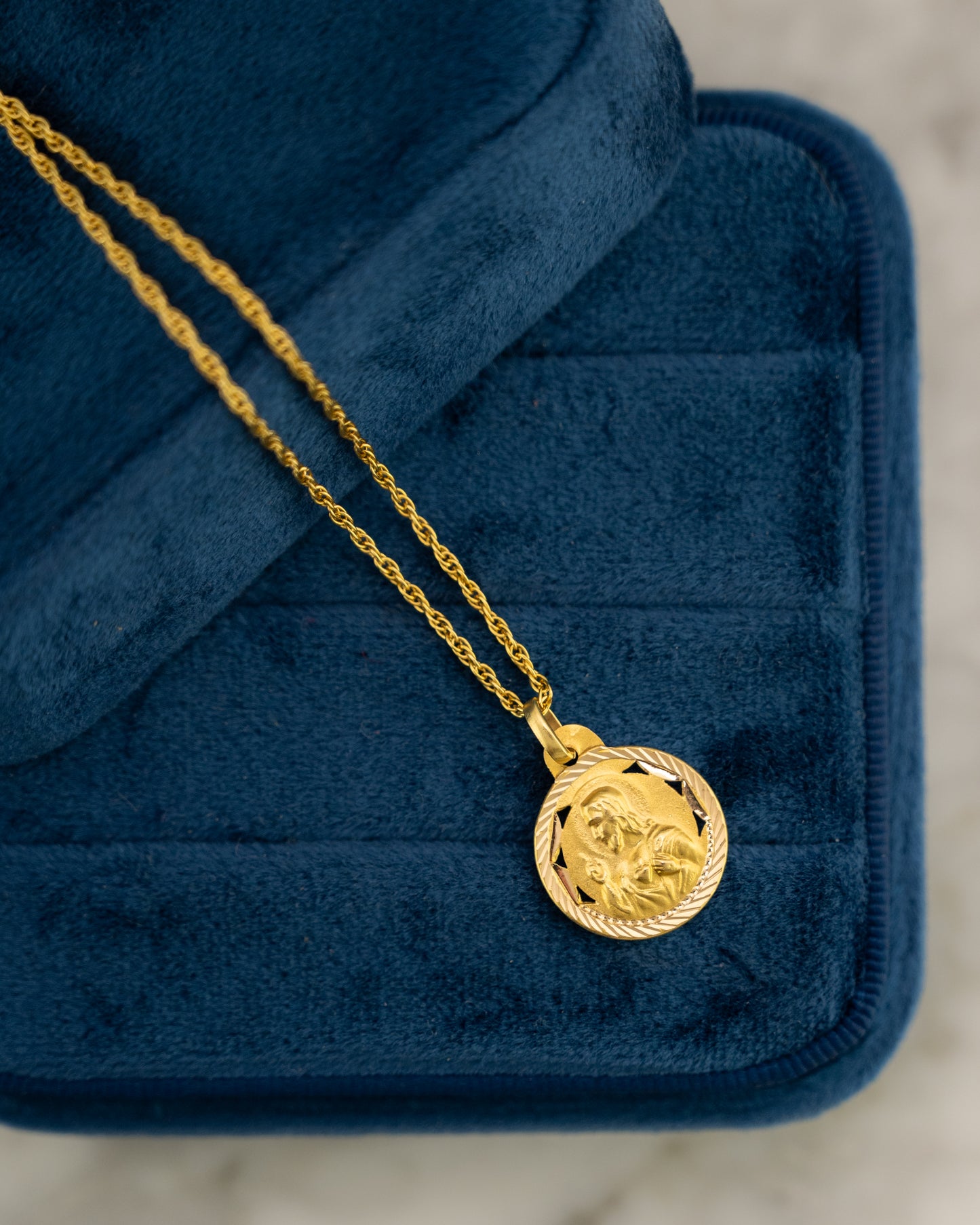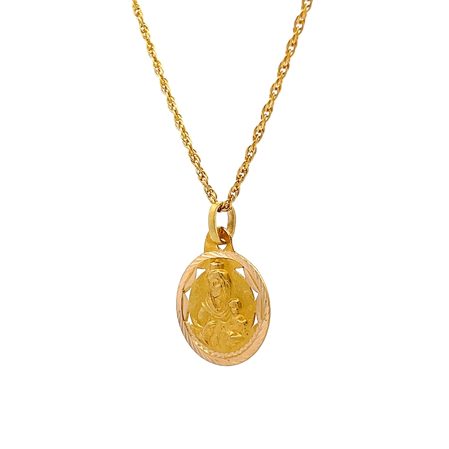This pendant necklace features a religious medallion showing Mother Mary, Baby Jesus, and Joseph cast in 18 Karat Yellow Gold. The coin-shaped pendant hangs from a sturdy 15-inch rope chain that provides both security and a textured look that complements the detailed religious imagery. The gold has a warm tone that highlights the sacred family depicted on the medallion. This piece combines religious symbolism with wearable jewelry design, making it suitable for both devotional purposes and everyday fashion. The relatively short 15-inch chain length positions the medallion higher on the chest where it remains visible rather than hanging lower as longer chains would.