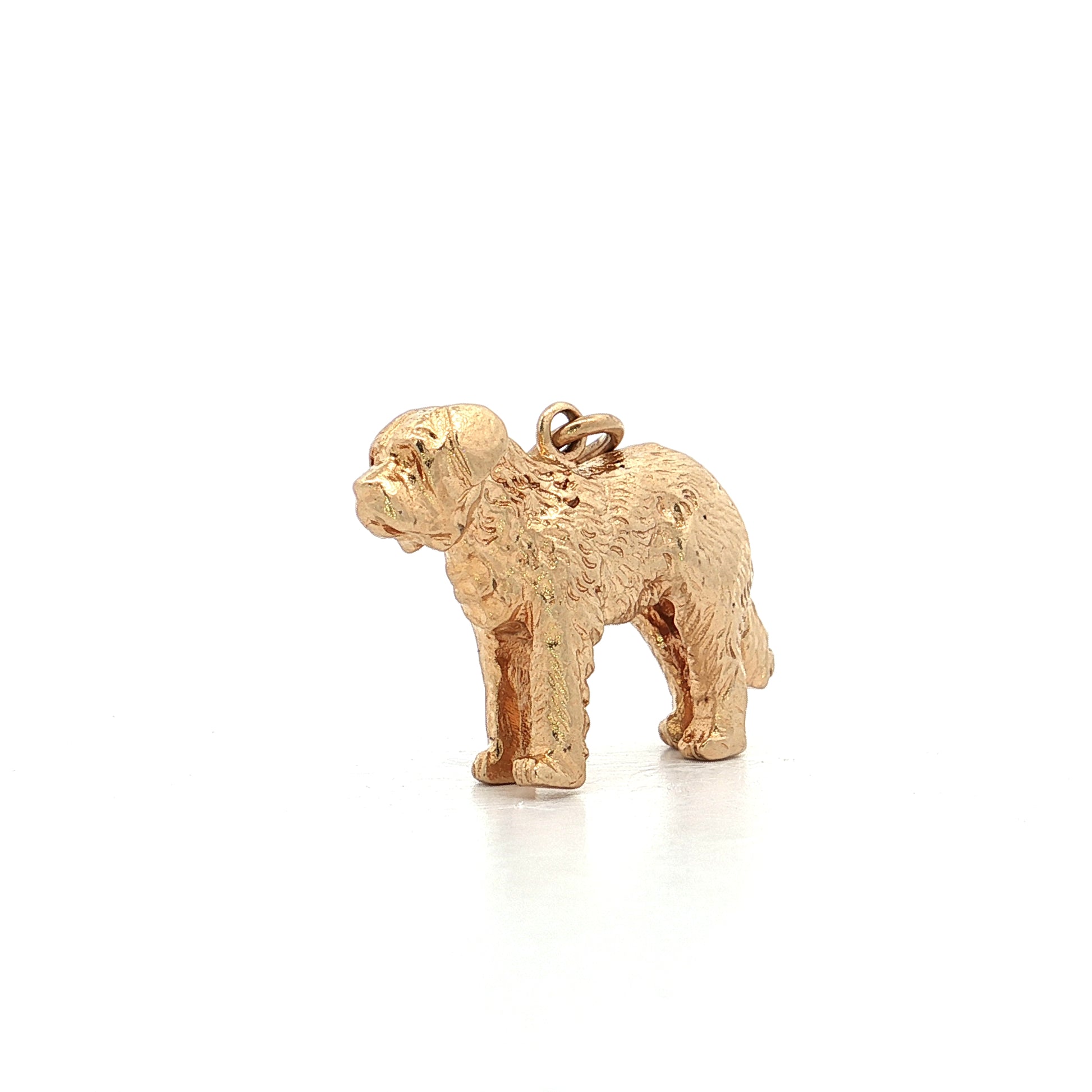This 14 karat yellow gold St. Bernard charm measures 25.8mm x 17.10mm and depicts the breed in three-dimensional detail. The solid gold construction gives the charm weight and durability—it won't dent or bend like hollow charms. The size makes it substantial enough to stand out on a charm bracelet or wear as a pendant without overwhelming smaller wrists or chains. Yellow gold's rich color complements the St. Bernard's warm coloring and creates good contrast against the detailed fur texturing. The charm includes a soldered bail that accommodates chains up to 3mm wide.