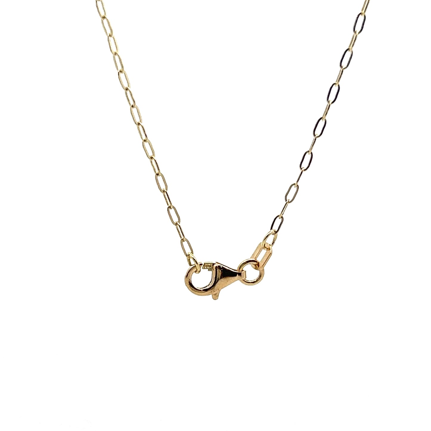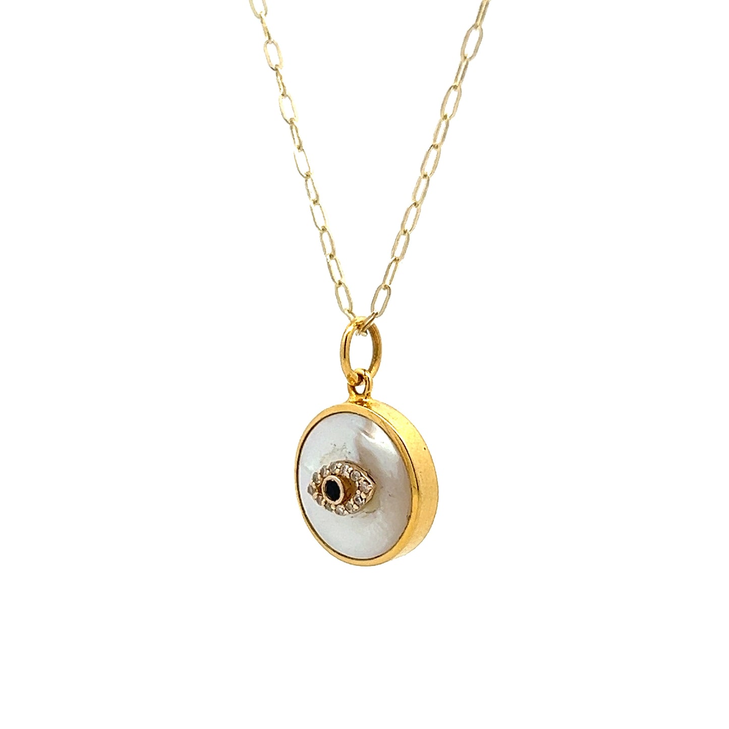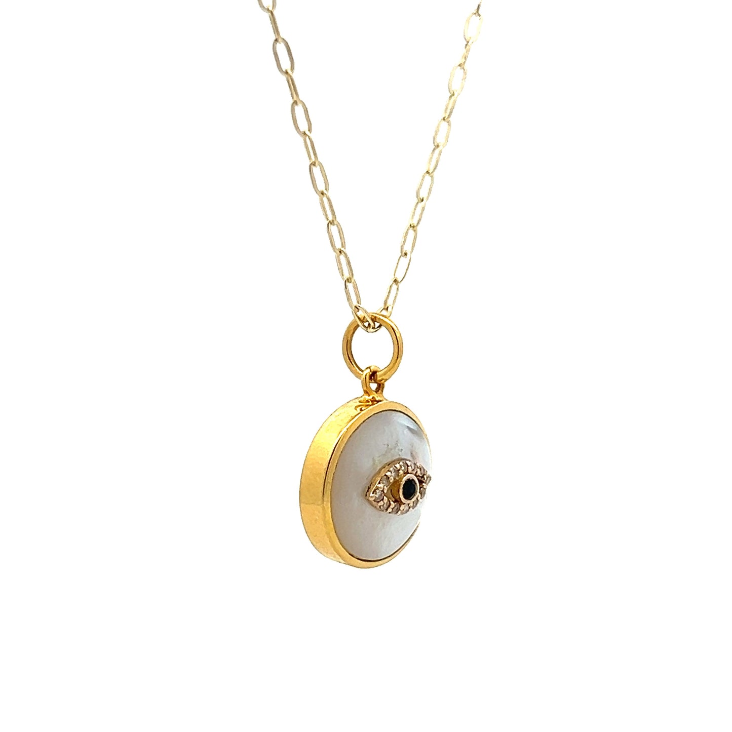This unique Evil Eye pendant necklace combines traditional symbolism with modern flair. Crafted from 14 karat yellow gold, it features a striking blue sapphire at its center, weighing .02 carats and measuring 1.75 mm in diameter. The sapphire is bezel set in the heart of the pendant, which is surrounded by a luminous mother of pearl. Enhancing the design are twelve brilliant diamonds, each weighing .005 carats and measuring 1.0 mm in diameter. These diamonds are meticulously set to frame the sapphire beautifully, adding a subtle sparkle. The pendant is suspended from a trendy paperclip chain, giving it a contemporary look. With a polished finish, this necklace shines brightly, making it a versatile addition to any outfit.