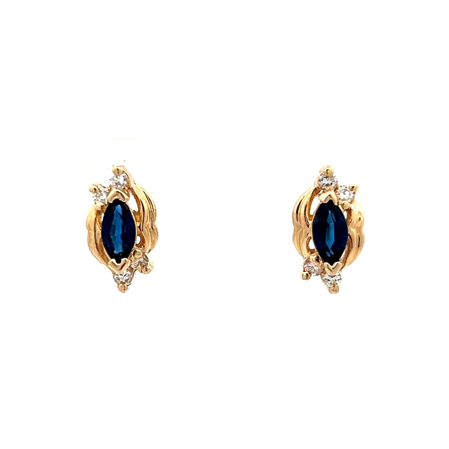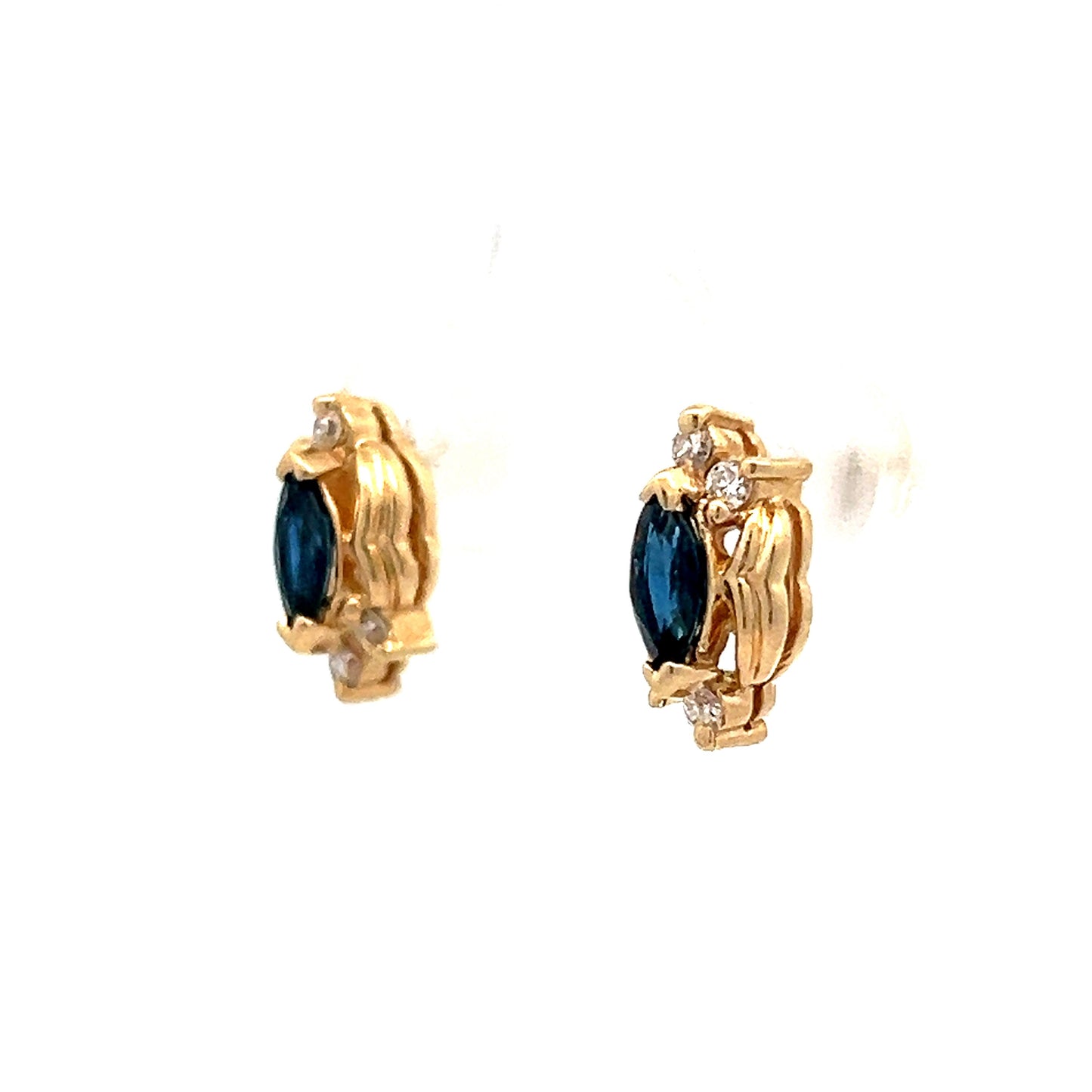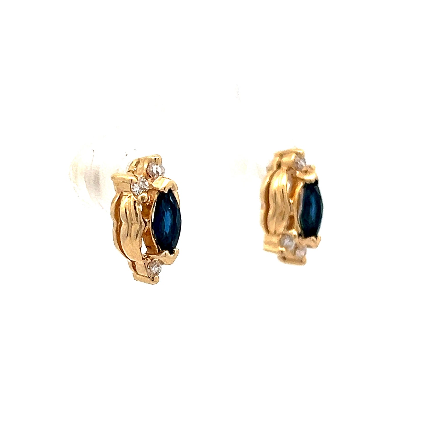 These modern earrings are studs with a twist. The marquise-cut blue sapphires are the stars of the show, weighing .48 carats. Each sapphire is accented by four round brilliant cut diamonds, each measuring 1.8mm and weighing .025 carats for a total of .20 carats. The yellow gold has slight embellishments and add a little extra texture.