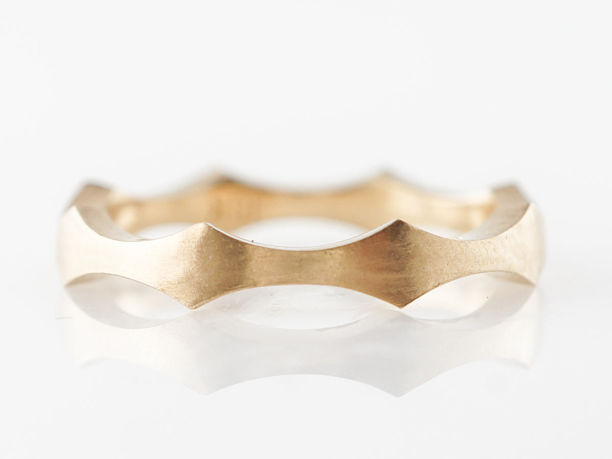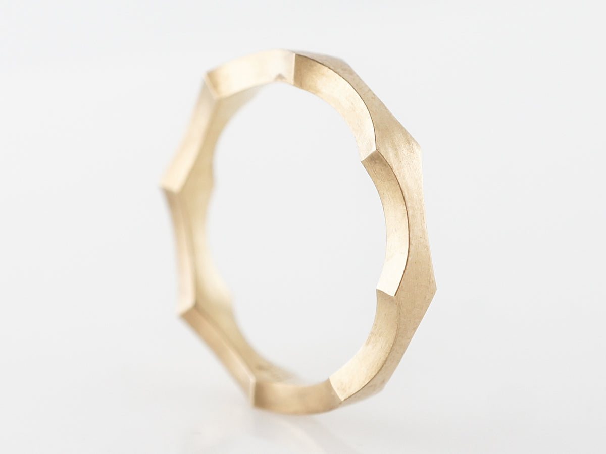 Scalloped Yellow Gold Ring w/ Brushed Finish. This scalloped wedding band in 18 karat yellow gold features a brushed finish. This dramatic look can be done in any metal and any finish and will pair nicely with your engagement ring.