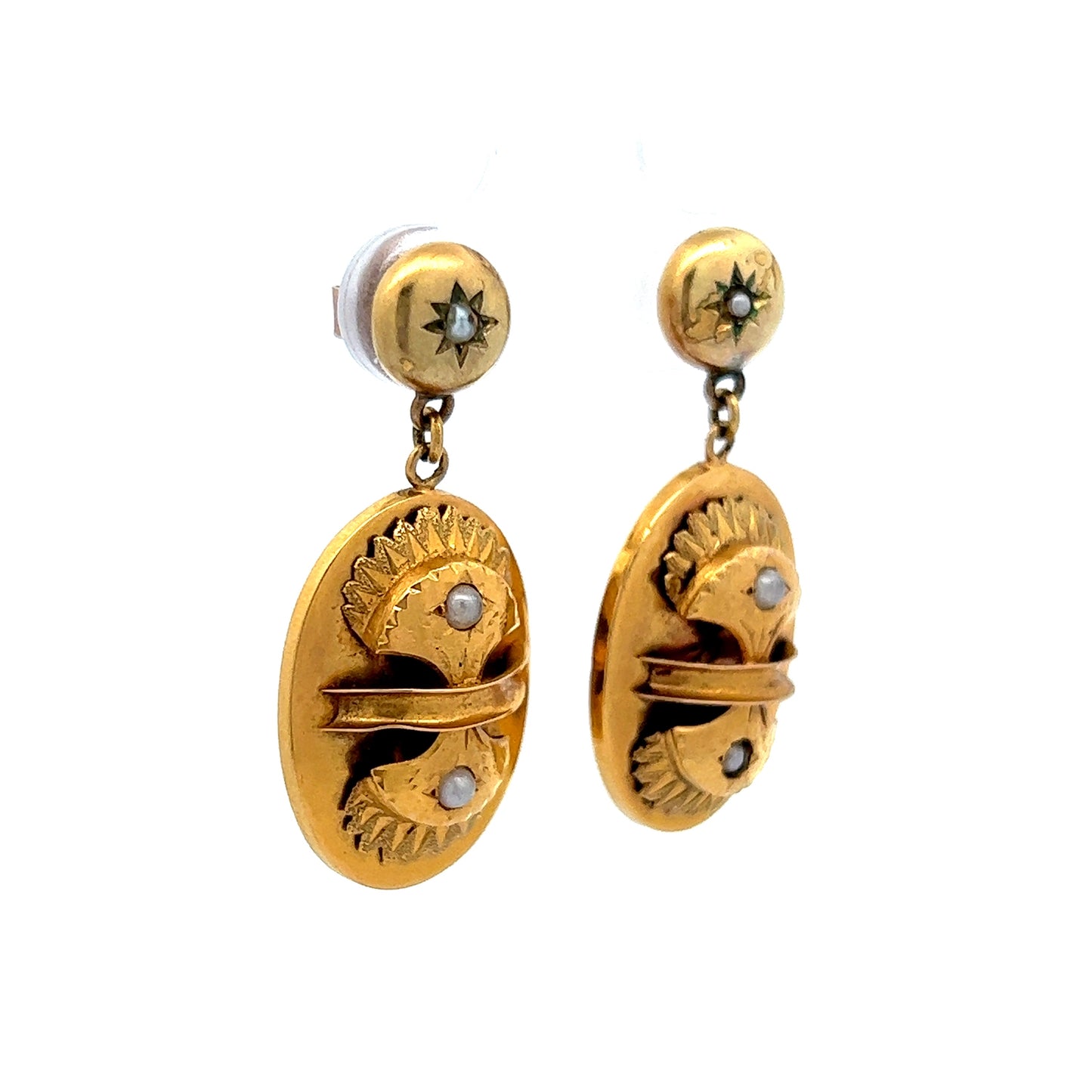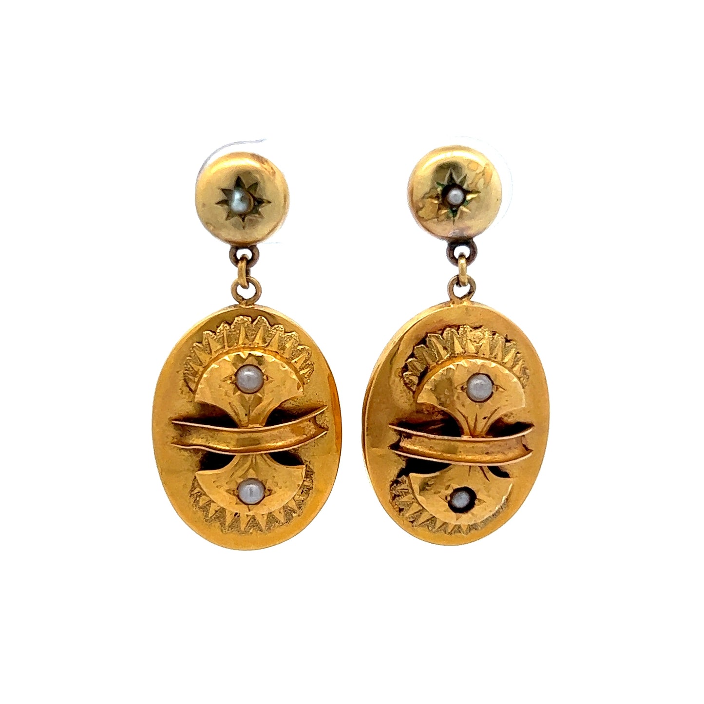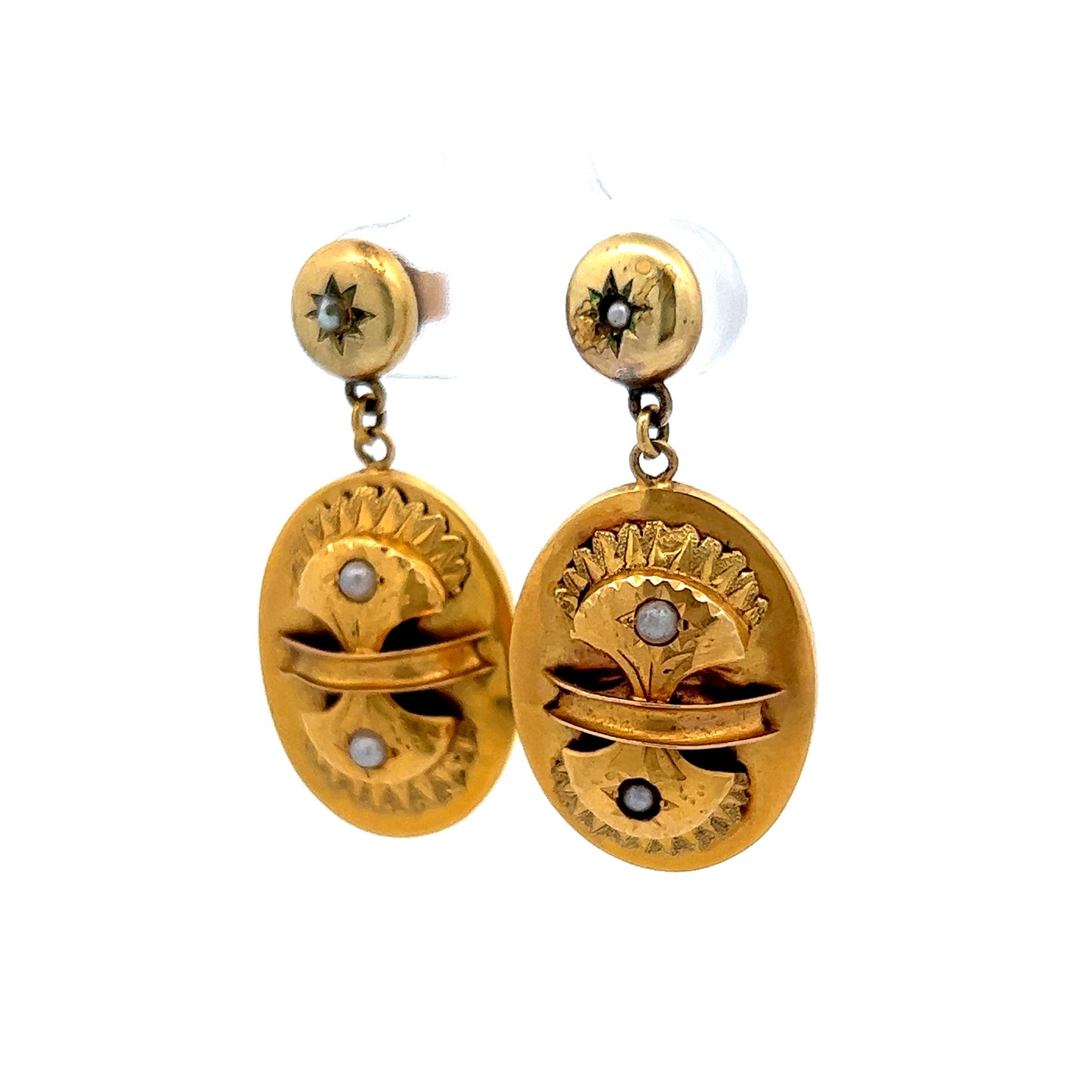 These oval-shaped Victorian Pearl Amulet Shield Drop Earrings in 14K Yellow Gold are a true work of art! Crafted with 14 karat yellow gold, these ornate earrings feature seed pearls that are intricately arranged in a classic, antique style. The pearls decorate the starburst stud backings and engraved oval shields that dangle softly below. These earrings are a perfect way to bring a goddess touch to any ensemble. The seed pearls reflect a soft and subtle light, giving a romantic and luxurious feel to the earrings. The vintage Victorian earrings have a tribal meets Grecian appeal. Antiquity at its finest. These earrings are the perfect addition to any jewelry collection and a great way to honor the iconic Victorian era.