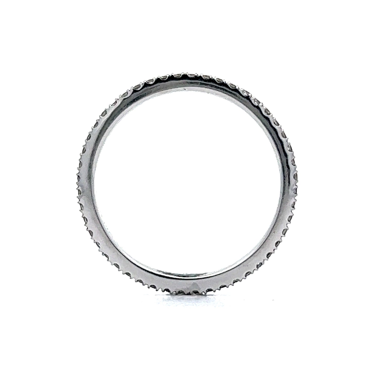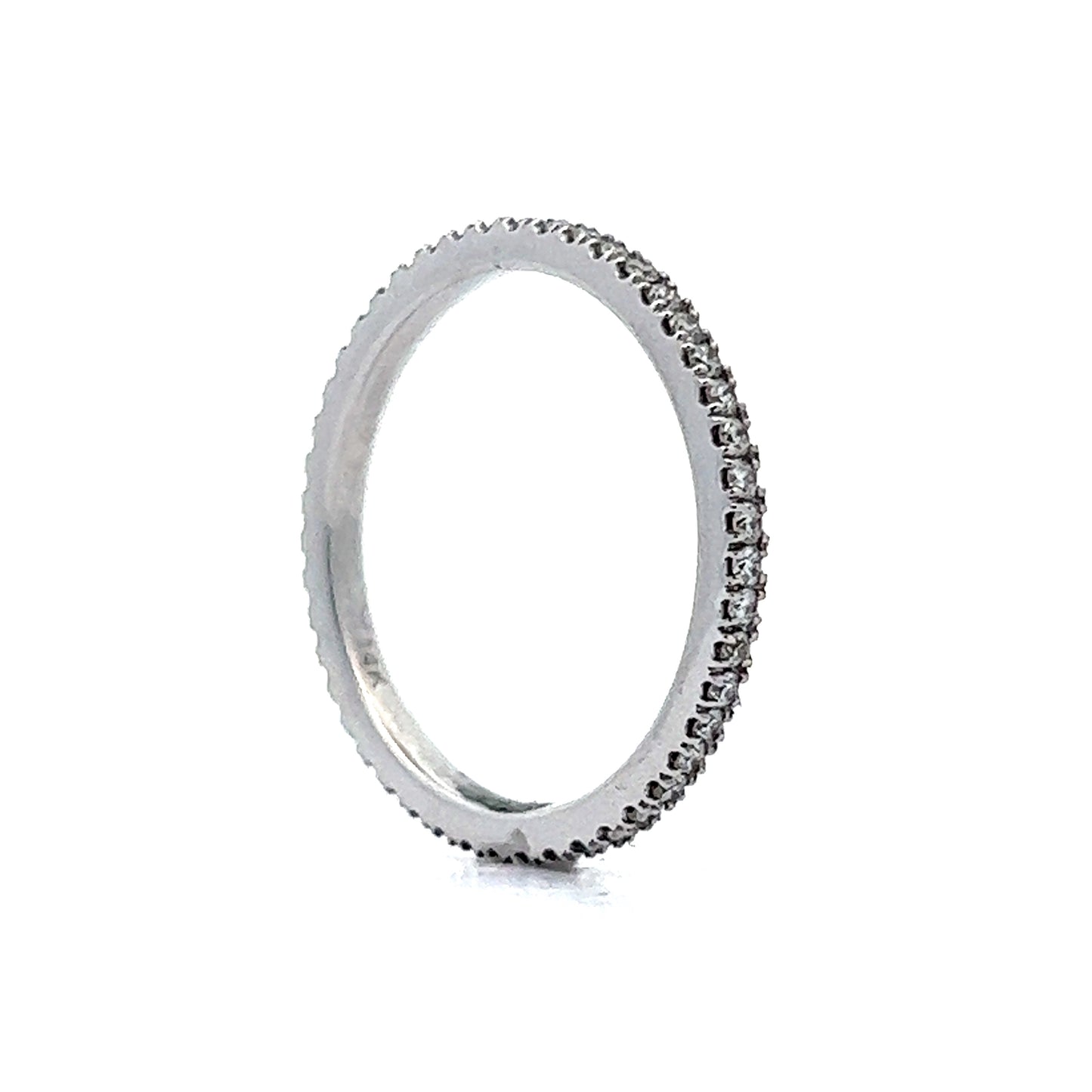 This thin eternity wedding band features .72 carats of Round Brilliant cut diamonds set in 14 karat white gold. A wonderful choice to add some bright sparkle to your engagement ring with these F color diamonds! A stacking band with style. Dainty forever timeless in design.