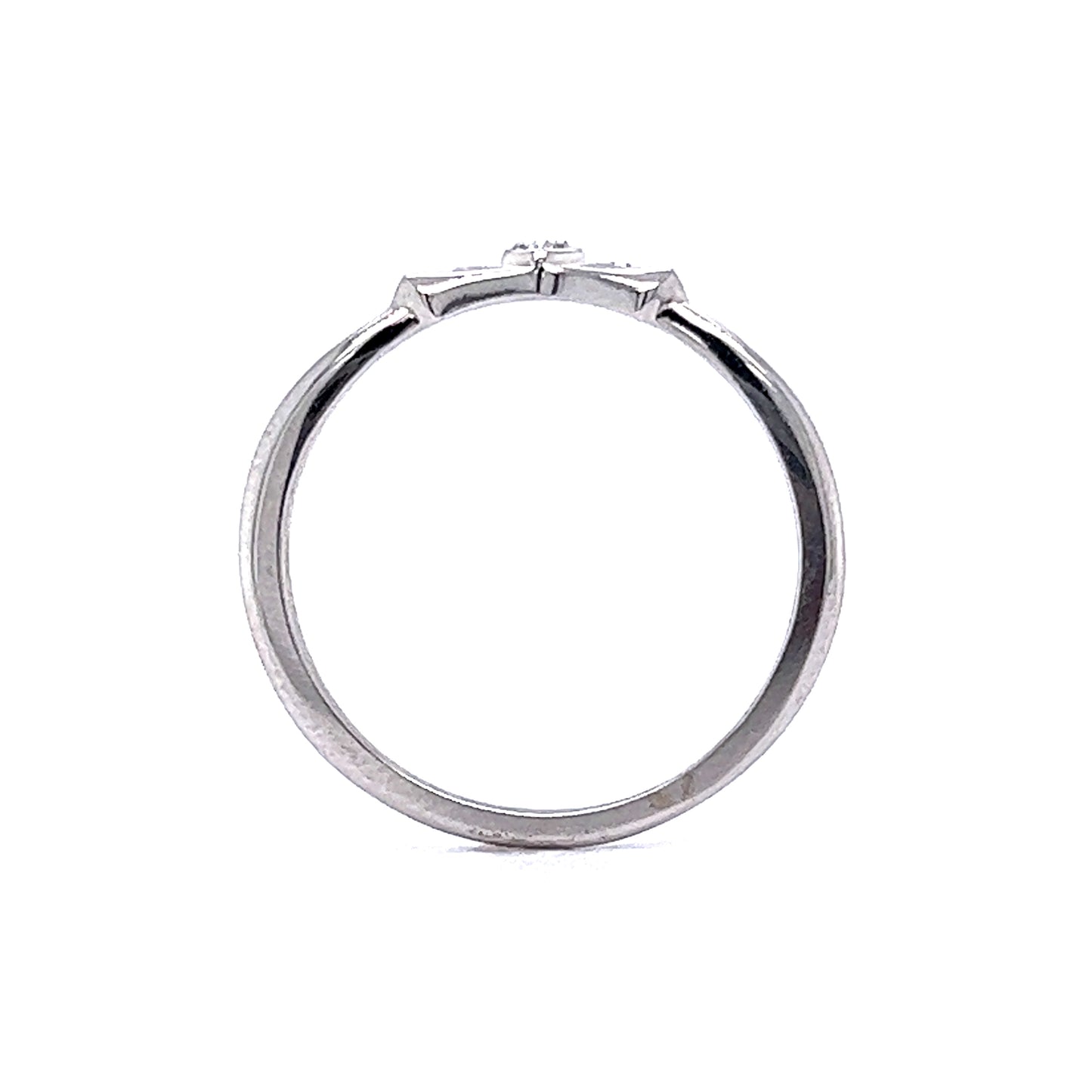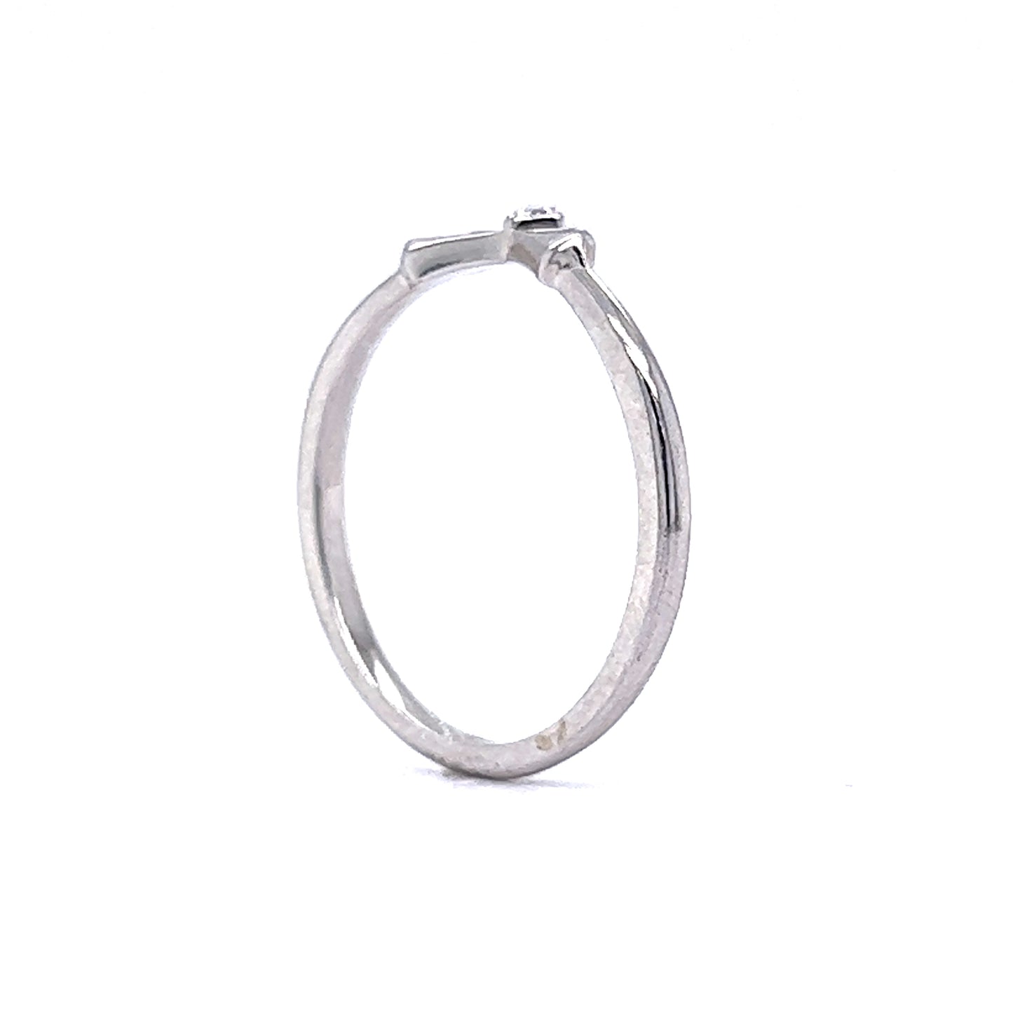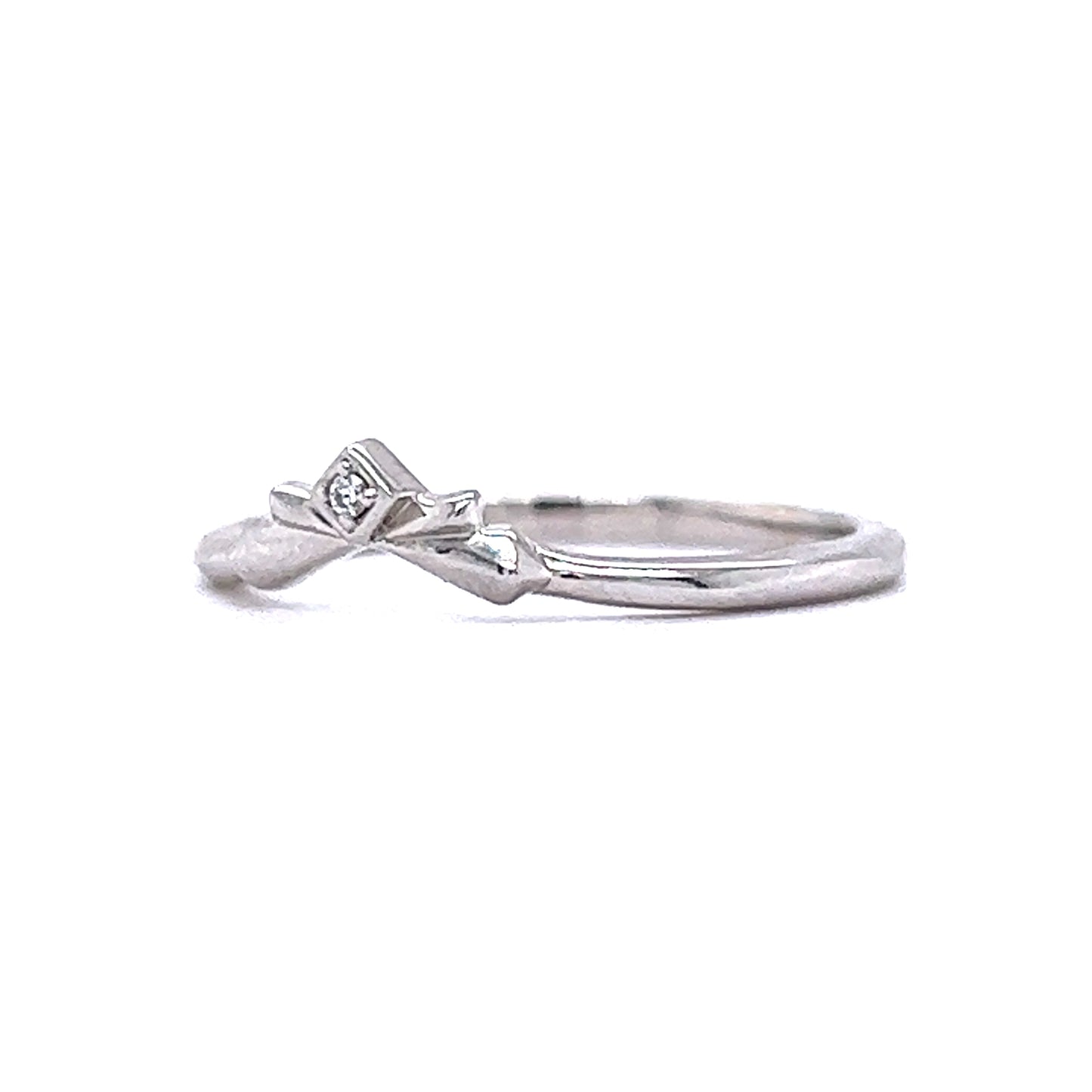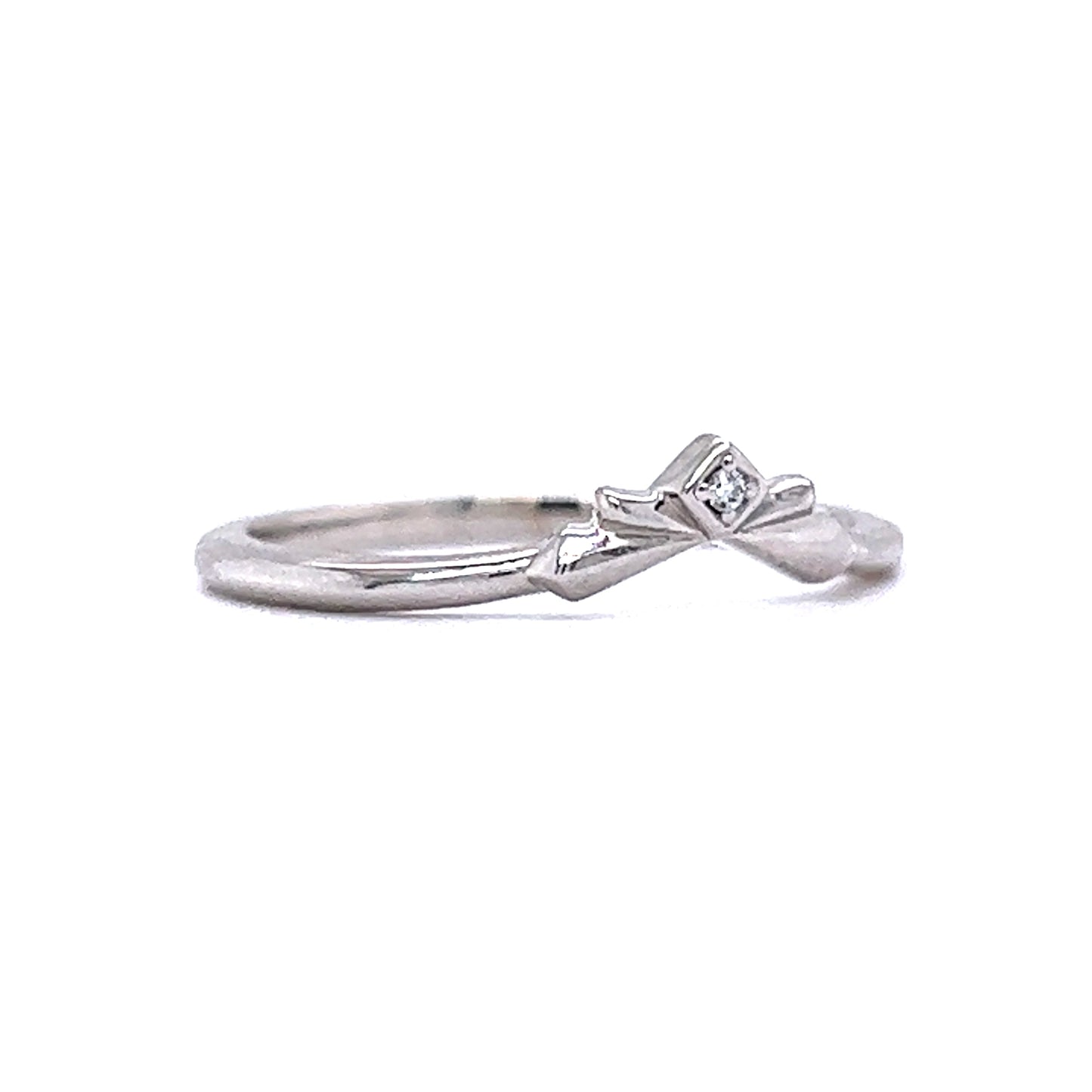 This romantic Single Diamond Curved Wedding Band features a solitaire Round Brilliant cut accent diamond in 14 karat white gold. The diamond is placed on an angular crown design. Geometric & modern. The curve of the band leaves room for the stone in an engagement ring. Measuring 3.15mm wide and finished in shimmering 14 white gold, this wedding ring can also be worn as a ring hand stacking band.