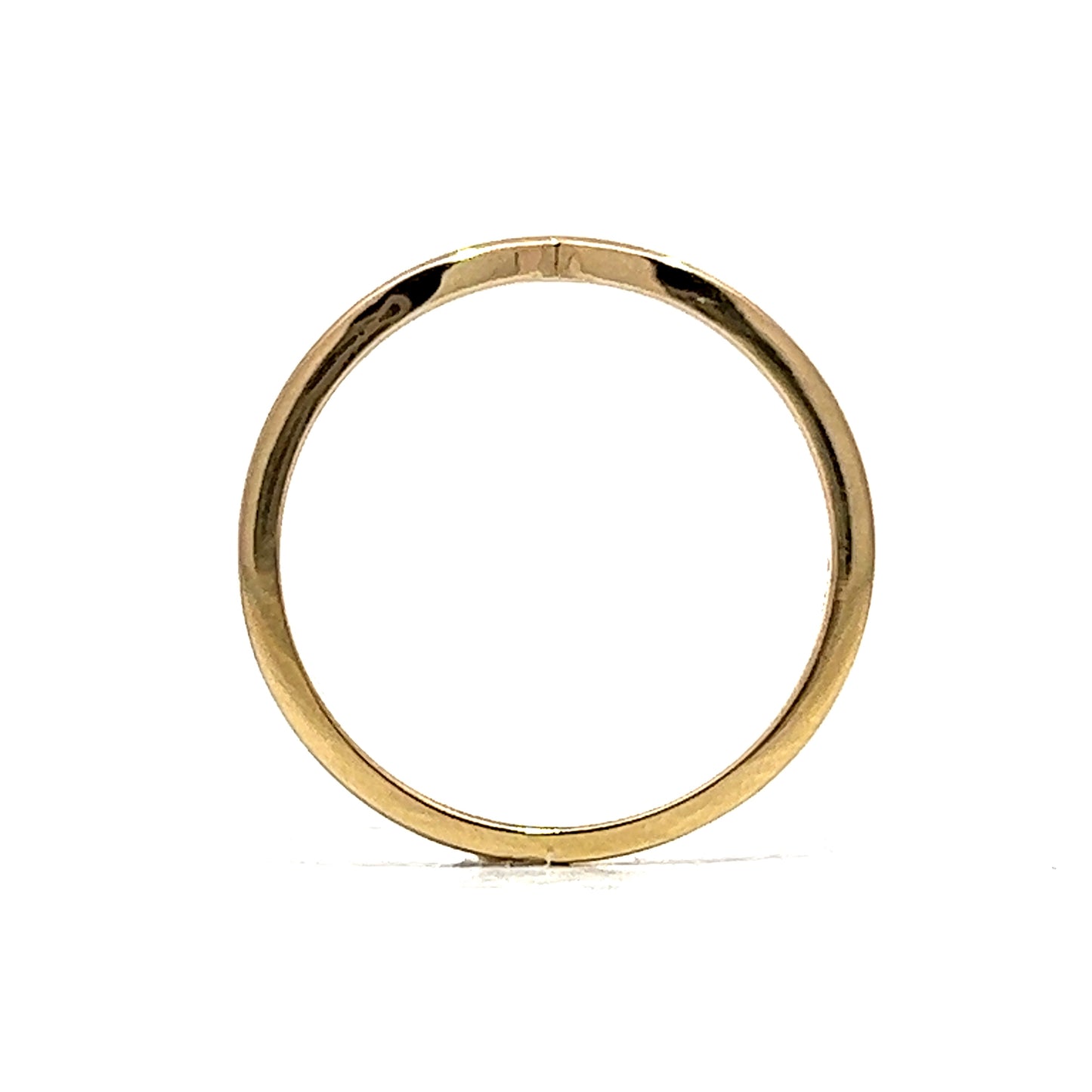 This simple timeless contoured wedding band features a slight V shape in 14 karat yellow gold. The dainty band measures 1.77mm wide and is perfect for stacking next to the stone in an engagement ring. Modern radiant. Pair this wedding band with a yellow gold engagement ring or wear in a right hand stack.